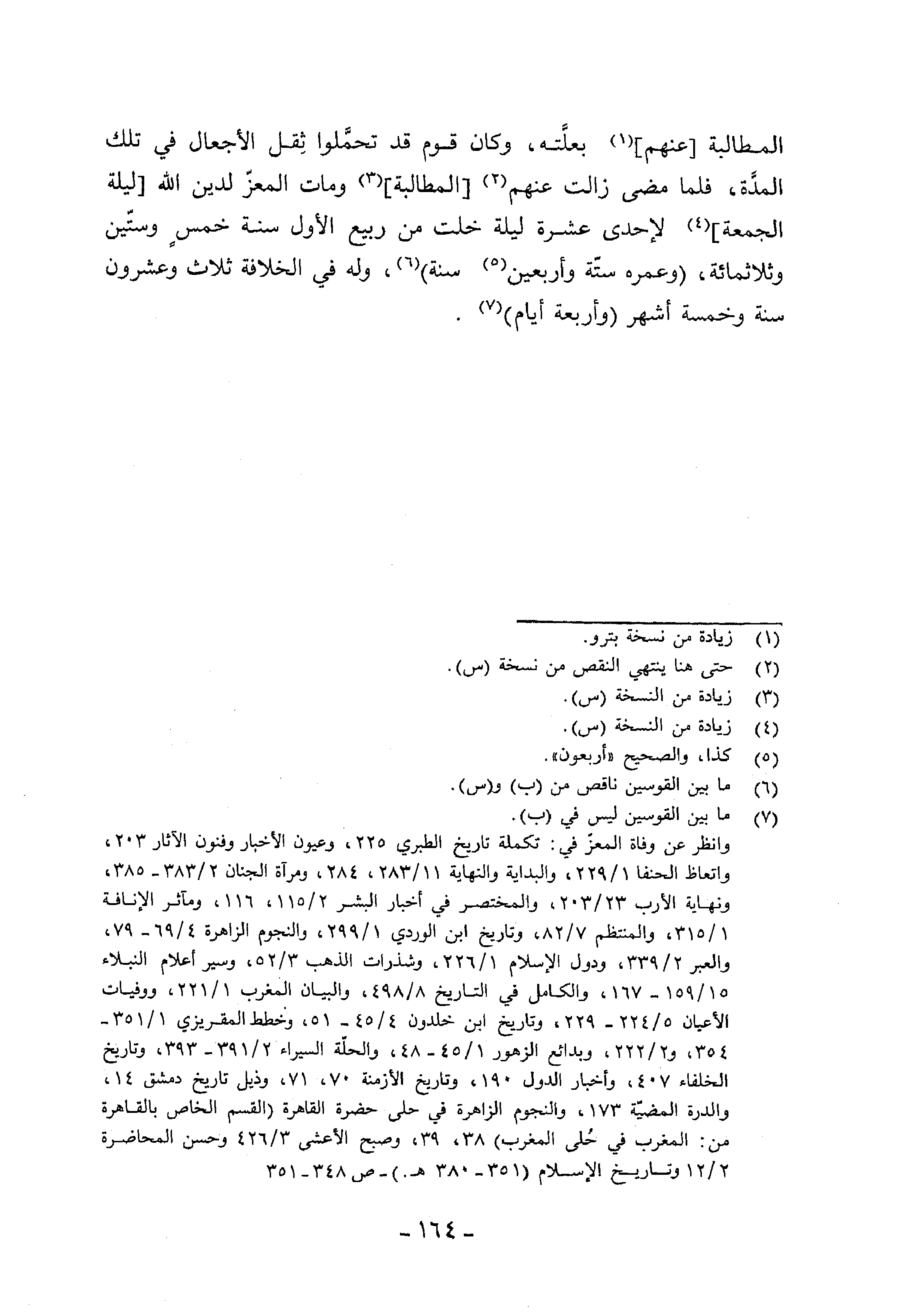 (¬7) ما بين القوسين ليس في (ب). وانظر عن وفاة المعزّ في: تكملة تاريخ الطبري 225، وعيون الأخبار وفنون الآثار 203، واتعاظ الحنفا 1/ 229، والبداية والنهاية 11/ 283،284، ومرآة الجنان 2/ 383 - 385، ونهاية الأرب 23/ 203، والمختصر في أخبار البشر 2/ 115،116، ومآثر الإنافة 1/ 315، والمنتظم 7/ 82، وتاريخ ابن الوردي 1/ 299، والنجوم الزاهرة 4/ 69 - 79، والعبر 2/ 339، ودول الإسلام 1/ 226، وشذرات الذهب 3/ 52، وسير أعلام النبلاء 15/ 159 - 167، والكامل في التاريخ 8/ 498، والبيان المغرب 1/ 221، ووفيات الأعيان 5/ 224 - 229، وتاريخ ابن خلدون 4/ 45 - 51، وخطط المقريزي 1/ 351 - 354، و 2/ 222، وبدائع الزهور 1/ 45 - 48، والحلّة السيراء 2/ 391 - 393، وتاريخ الخلفاء 407، وأخبار الدول 190، وتاريخ الأزمنة 70،71، وذيل تاريخ دمشق 14، والدرة المضيّة 173، والنجوم الزاهرة في حلى حضرة القاهرة (القسم الخاص بالقاهرة من: المغرب في حلى المغرب) 38،39، وصبح الأعشى 3/ 426 وحسن المحاضرة 2/ 12 وتاريخ الإسلام (351 - 380 هـ.) -ص 348 - 351
