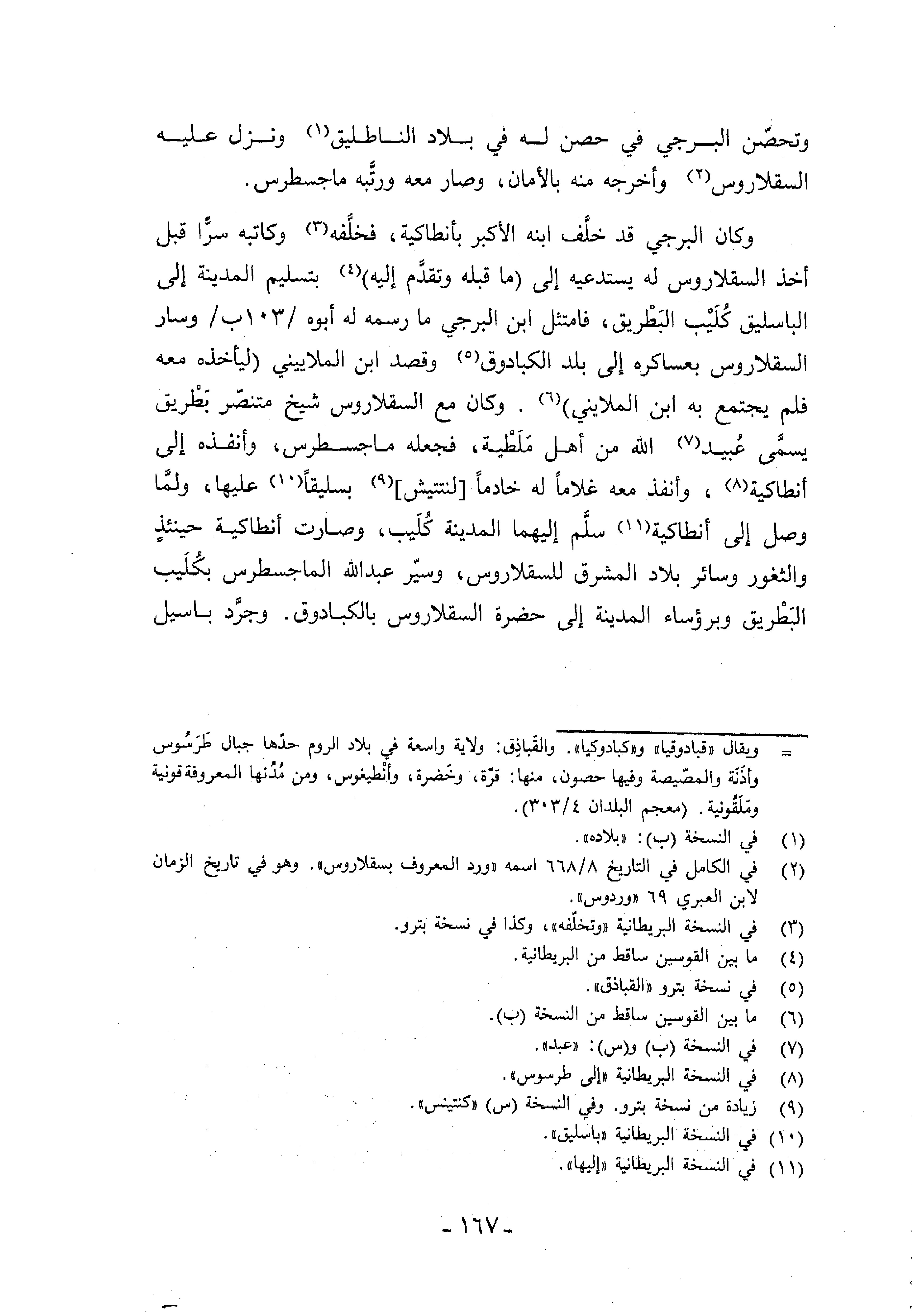 وكان البرجي قد خلّف ابنه الأكبر بأنطاكية، فخلّفه (¬3) وكاتبه سرّا قبل أخذ السقلاروس له يستدعيه إلى (ما قبله وتقدّم إليه) (¬4) بتسليم المدينة إلى الباسليق كليب البطريق، فامتثل ابن البرجي ما رسمه له أبوه/103 ب/وسار السقلاروس بعساكره إلى بلد الكبادوق (¬5) وقصد ابن الملاييني (ليأخذه معه فلم يجتمع به ابن الملايني) (¬6). وكان مع السقلاروس شيخ متنصّر بطريق يسمّى عبيد (¬7) الله من أهل ملطية، فجعله ماجسطرس، وأنفذه إلى أنطاكية (¬8)، وأنفذ معه غلاما له خادما [لنتتيش] (¬9) بسليقا (¬10) عليها،
