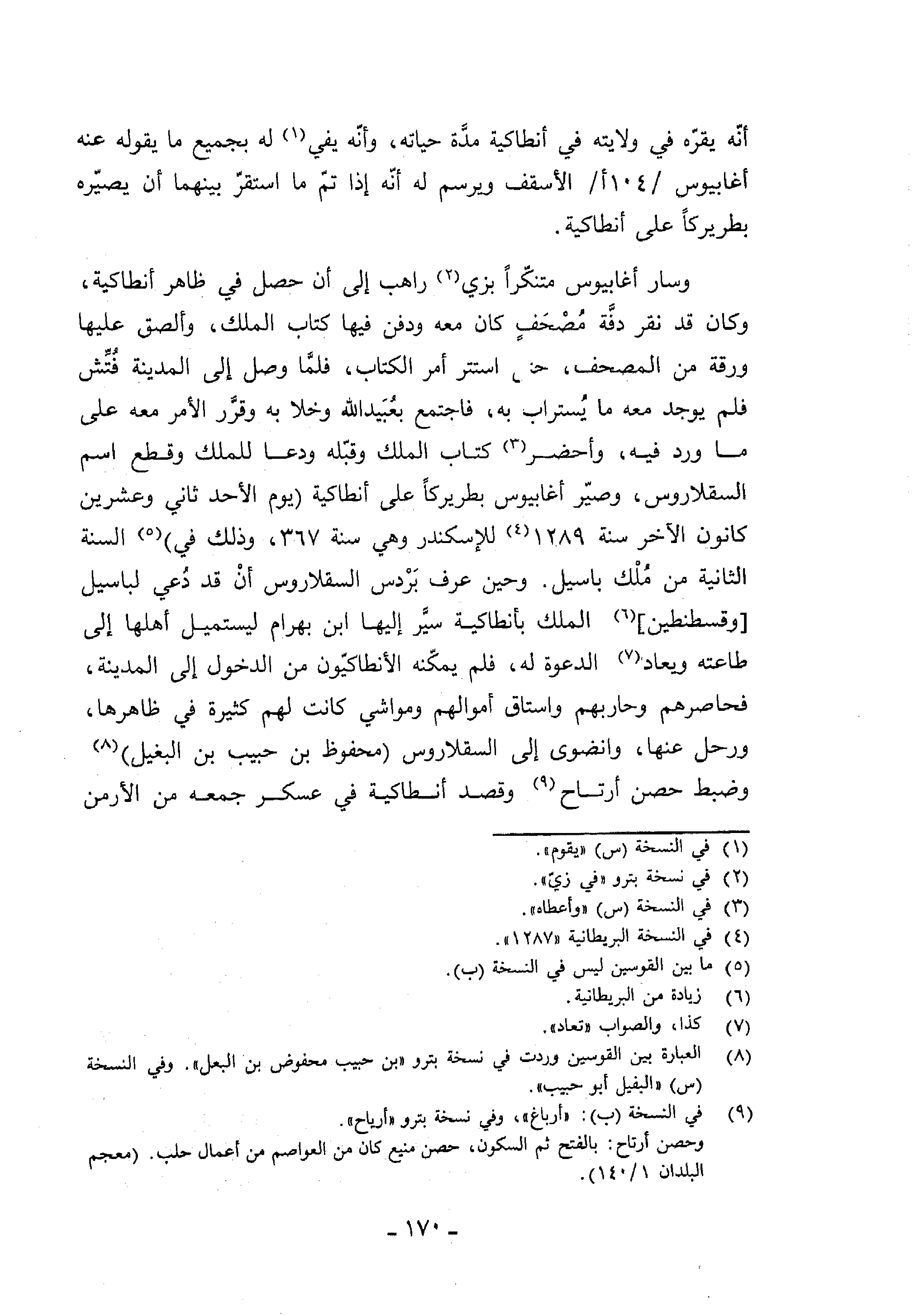 وصيّر أغابيوس بطريركا على أنطاكية (يوم الأحد ثاني وعشرين كانون الآخر سنة 1289 (¬4) للإسكندر وهي سنة 367، وذلك في) (¬5) السنة الثانية من ملك باسيل. وحين عرف بردس السقلاروس أن قد دعي لباسيل [وقسطنطين] (¬6) الملك بأنطاكية سيّر إليها ابن بهرام ليستميل أهلها إلى طاعته ويعاد (¬7) الدعوة له، فلم يمكّنه الأنطاكيّون من الدخول إلى المدينة، فحاصرهم وحاربهم واستاق أموالهم ومواشي كانت لهم كثيرة في ظاهرها،