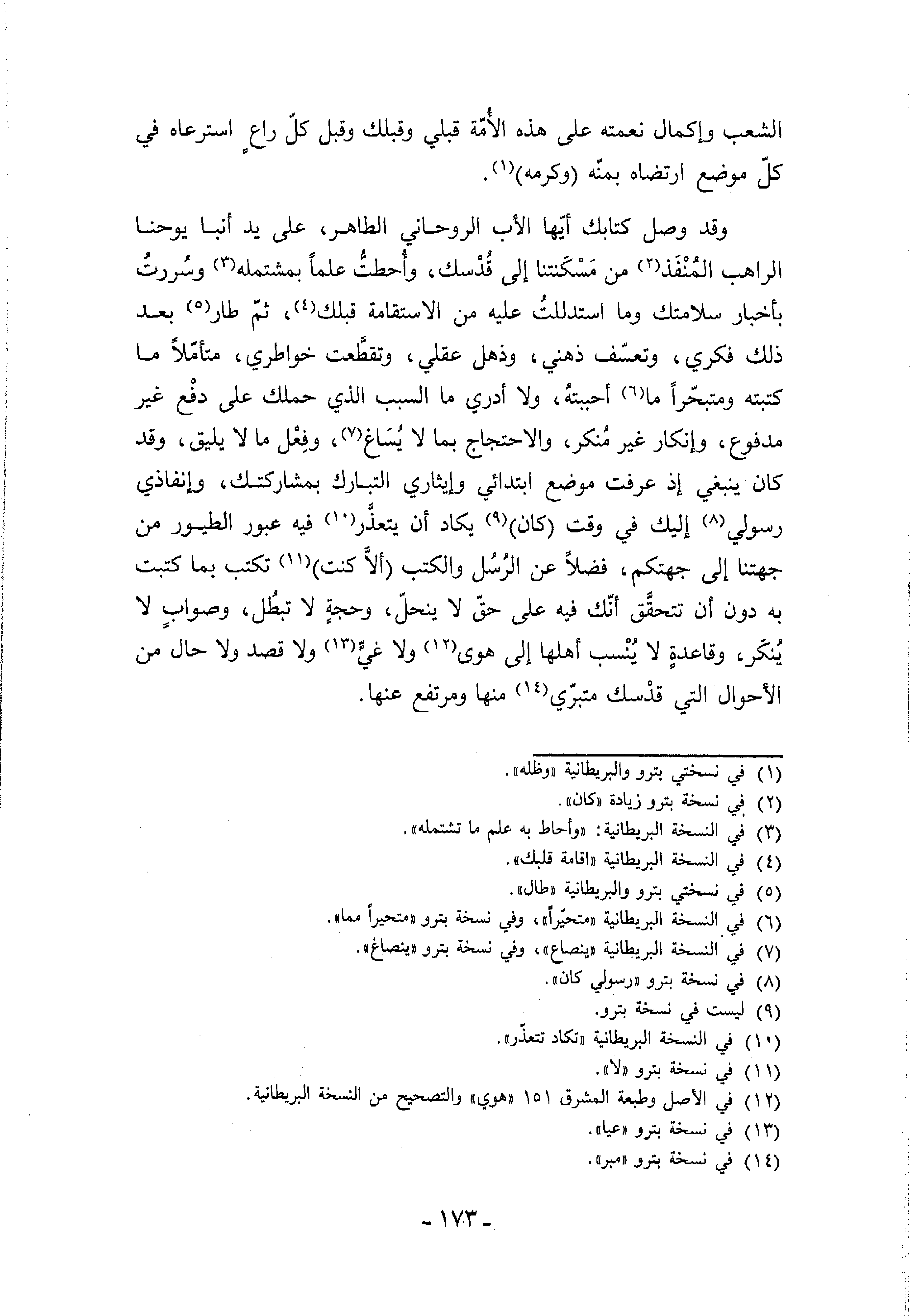 وقد وصل كتابك أيّها الأب الروحاني الطاهر، على يد أنبا يوحنا الراهب المنفذ (¬2) من مسكنتنا إلى قدسك، وأحطتّ علما بمشتمله (¬3) وسررت بأخبار سلامتك وما استدللت عليه من الاستقامة قبلك (¬4)، ثمّ طار (¬5) بعد ذلك فكري، وتعسّف ذهني، وذهل عقلي، وتقطّعت خواطري، متأمّلا ما كتبته ومتبحّرا ما (¬6) أحببته، ولا أدري ما السبب الذي حملك على دفع غير مدفوع، وإنكار غير منكر، والاحتجاج بما لا يساغ (¬7)، وفعل ما لا يليق، وقد كان ينبغي إذ عرفت موضع ابتدائي وإيثاري التبارك بمشاركتك، وإنفاذي رسولي (¬8) إليك في وقت (كان) (¬9) يكاد أن يتعذّر (¬10) فيه عبور الطيور من جهتنا إلى جهتكم، فضلا عن الرسل والكتب (ألاّ كنت) (¬11) تكتب بما كتبت به دون أن تتحقّق أنّك فيه على حقّ لا ينحلّ، وحجة لا تبطل، وصواب لا ينكر، وقاعدة لا ينسب أهلها إلى هوى (¬12) ولا غيّ (¬13) ولا قصد ولا حال من الأحوال التي قدسك متبرّي (¬14) منها ومرتفع عنها.