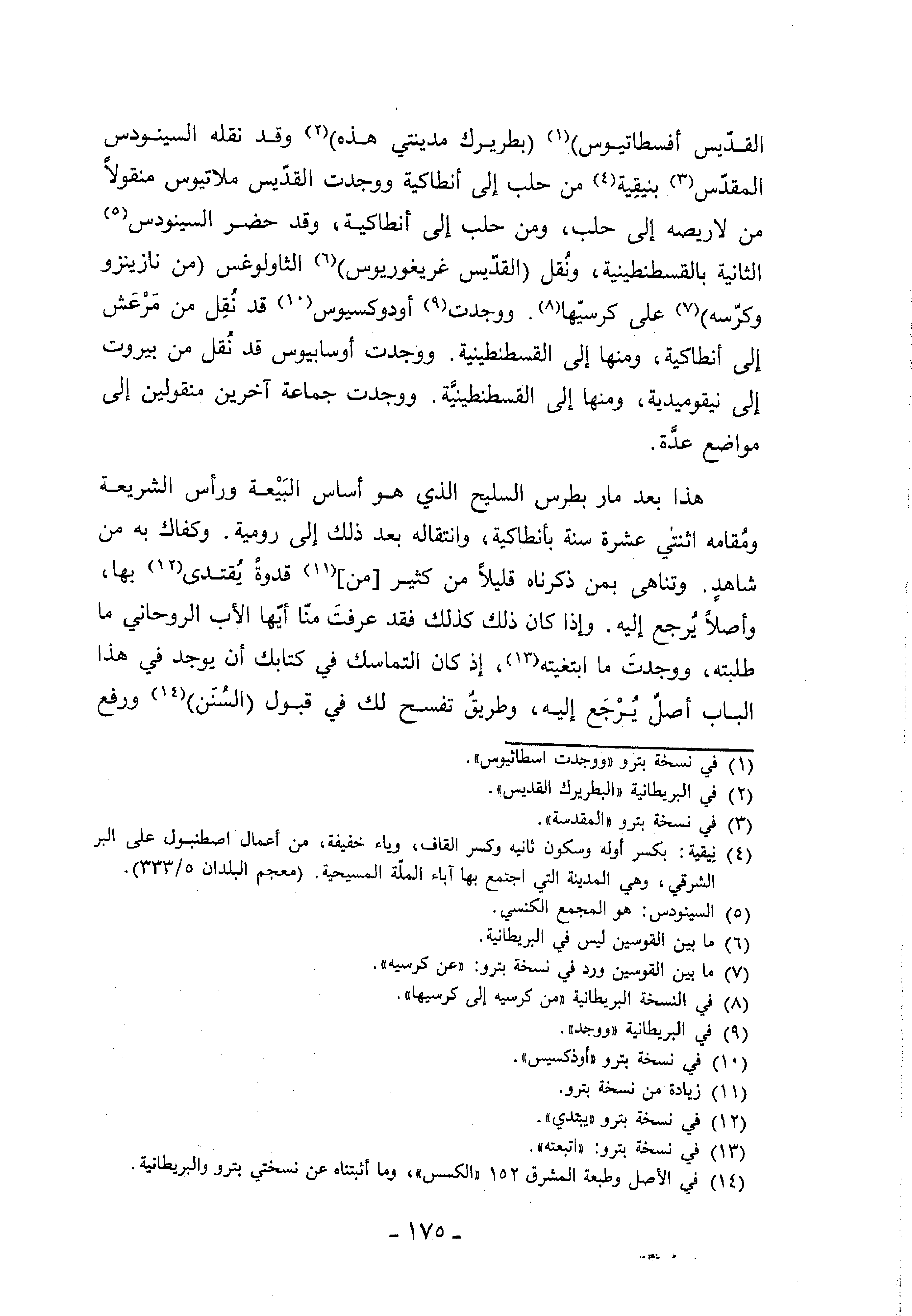 القدّيس أفسطاتيوس) (¬1) (بطريرك مدينتي هذه) (¬2) وقد نقله السينودس المقدّس (¬3) بنيقية (¬4) من حلب إلى أنطاكية ووجدت القدّيس ملاتيوس منقولا من لاريصه إلى حلب، ومن حلب إلى أنطاكية، وقد حضر السينودس (¬5) الثانية بالقسطنطينية، ونقل (القدّيس غريغوريوس) (¬6) الثاولوغس (من نازينزو وكرّسه) (¬7) على كرسيّها (¬8). ووجدت (¬9) أودوكسيوس (¬10) قد نقل من مرعش إلى أنطاكية، ومنها إلى القسطنطينية. ووجدت أوسابيوس قد نقل من بيروت إلى نيقوميدية، ومنها إلى القسطنطينيّة. ووجدت جماعة آخرين منقولين إلى مواضع عدّة.