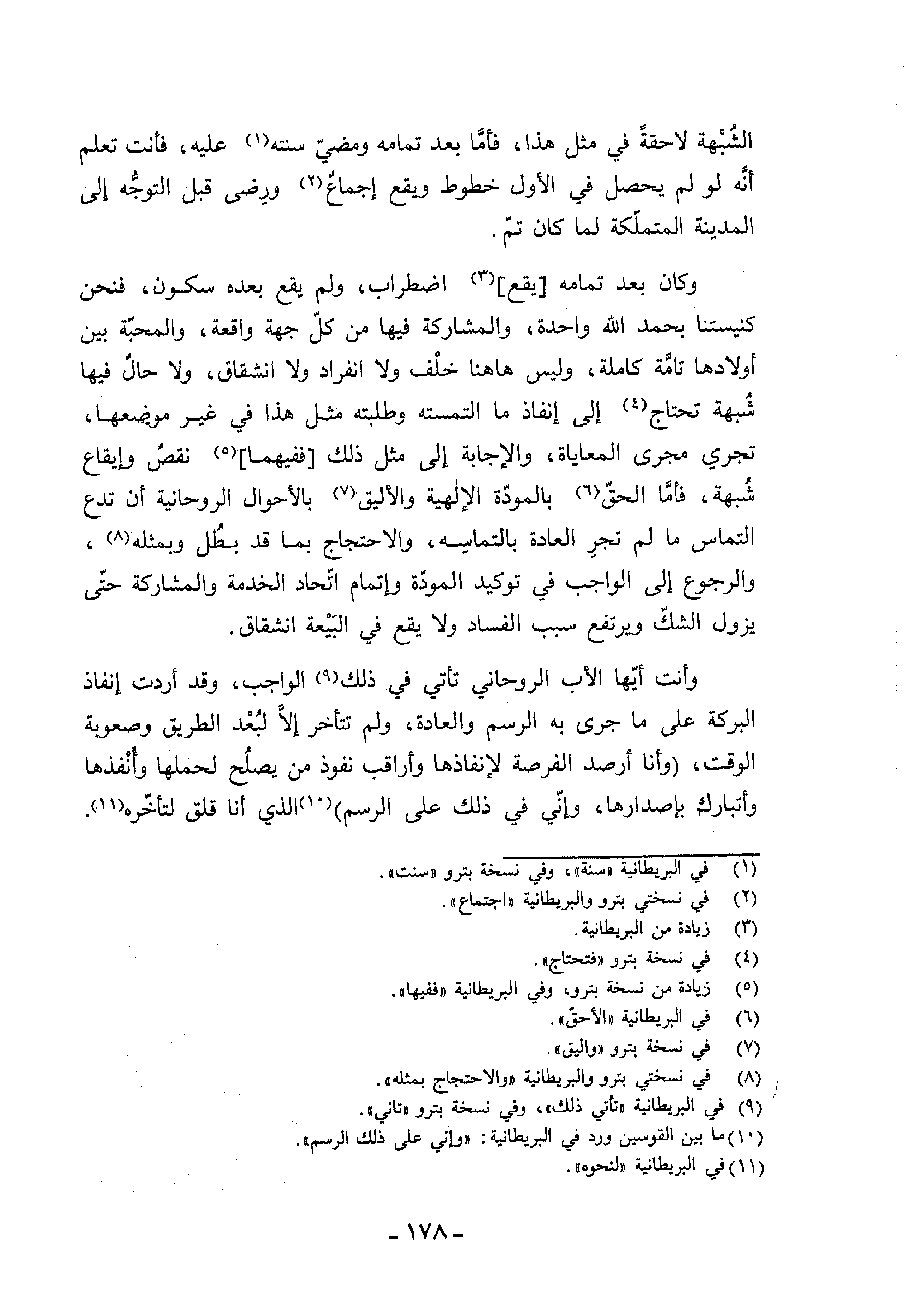 الشبهة لاحقة في مثل هذا، فأمّا بعد تمامه ومضيّ سنته (¬1) عليه، فأنت تعلم أنّه لو لم يحصل في الأول خطوط ويقع إجماع (¬2) ورضى قبل التوجّه إلى المدينة المتملّكة لما كان تمّ.
