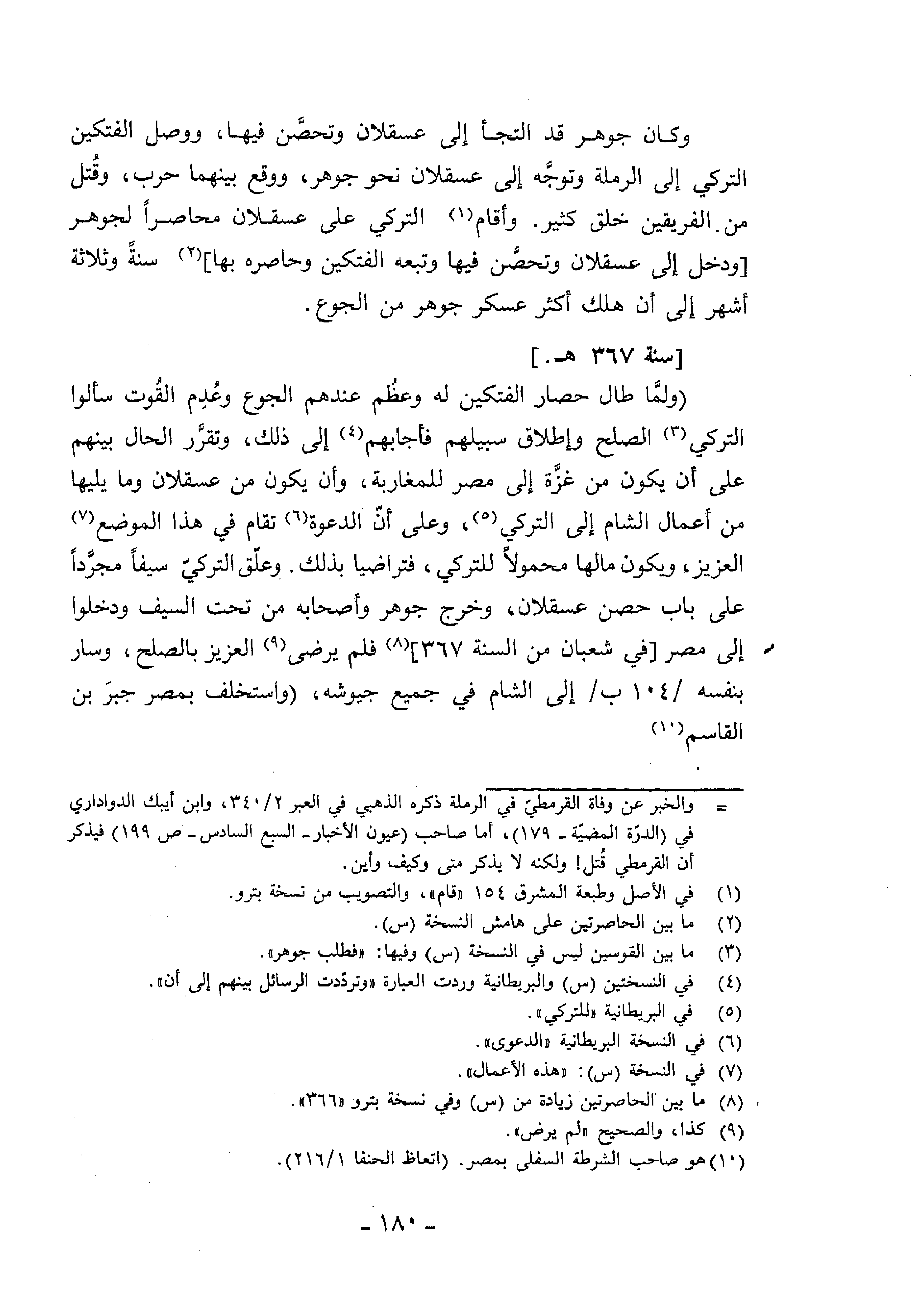 وكان جوهر قد التجأ إلى عسقلان وتحصّن فيها، ووصل الفتكين التركي إلى الرملة وتوجّه إلى عسقلان نحو جوهر، ووقع بينهما حرب، وقتل من الفريقين خلق كثير. وأقام (¬1) التركي على عسقلان محاصرا لجوهر [ودخل إلى عسقلان وتحصّن فيها وتبعه الفتكين وحاصره بها] (¬2) سنة وثلاثة أشهر إلى أن هلك أكثر عسكر جوهر من الجوع.