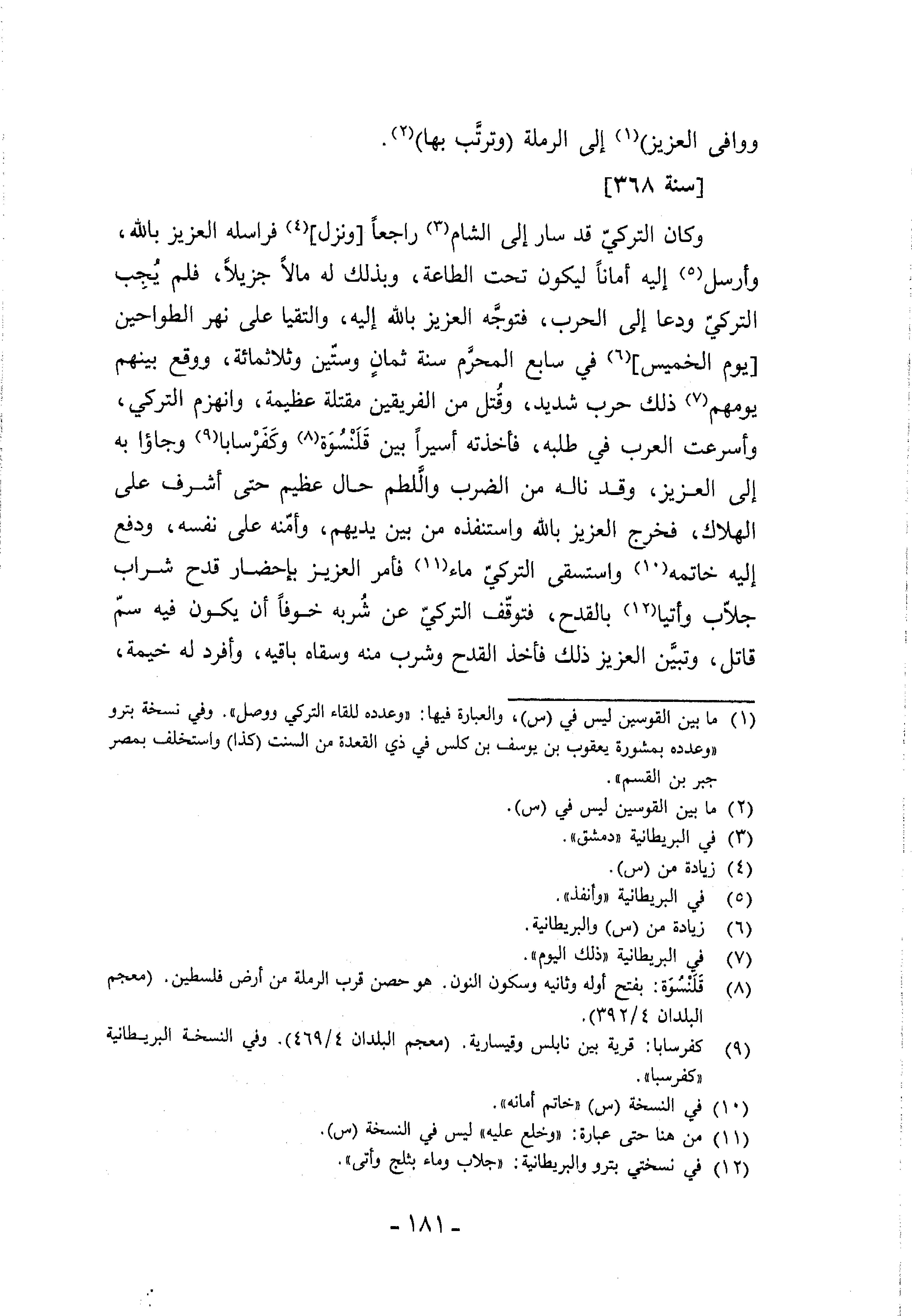 وأسرعت العرب في طلبه، فأخذته أسيرا بين قلنسوة (¬8) وكفرسابا (¬9) وجاؤا به إلى العزيز، وقد ناله من الضرب والّلطم حال عظيم حتى أشرف على الهلاك، فخرج العزيز بالله واستنفذه من بين يديهم، وأمّنه على نفسه، ودفع إليه خاتمه (¬10) واستسقى التركيّ ماء (¬11) فأمر العزيز بإحضار قدح شراب جلاّب وأتيا (¬12) بالقدح، فتوقّف التركيّ عن شربه خوفا أن يكون فيه سمّ قاتل، وتبيّن العزيز ذلك فأخذ القدح وشرب منه وسقاه باقيه، وأفرد له خيمة،
