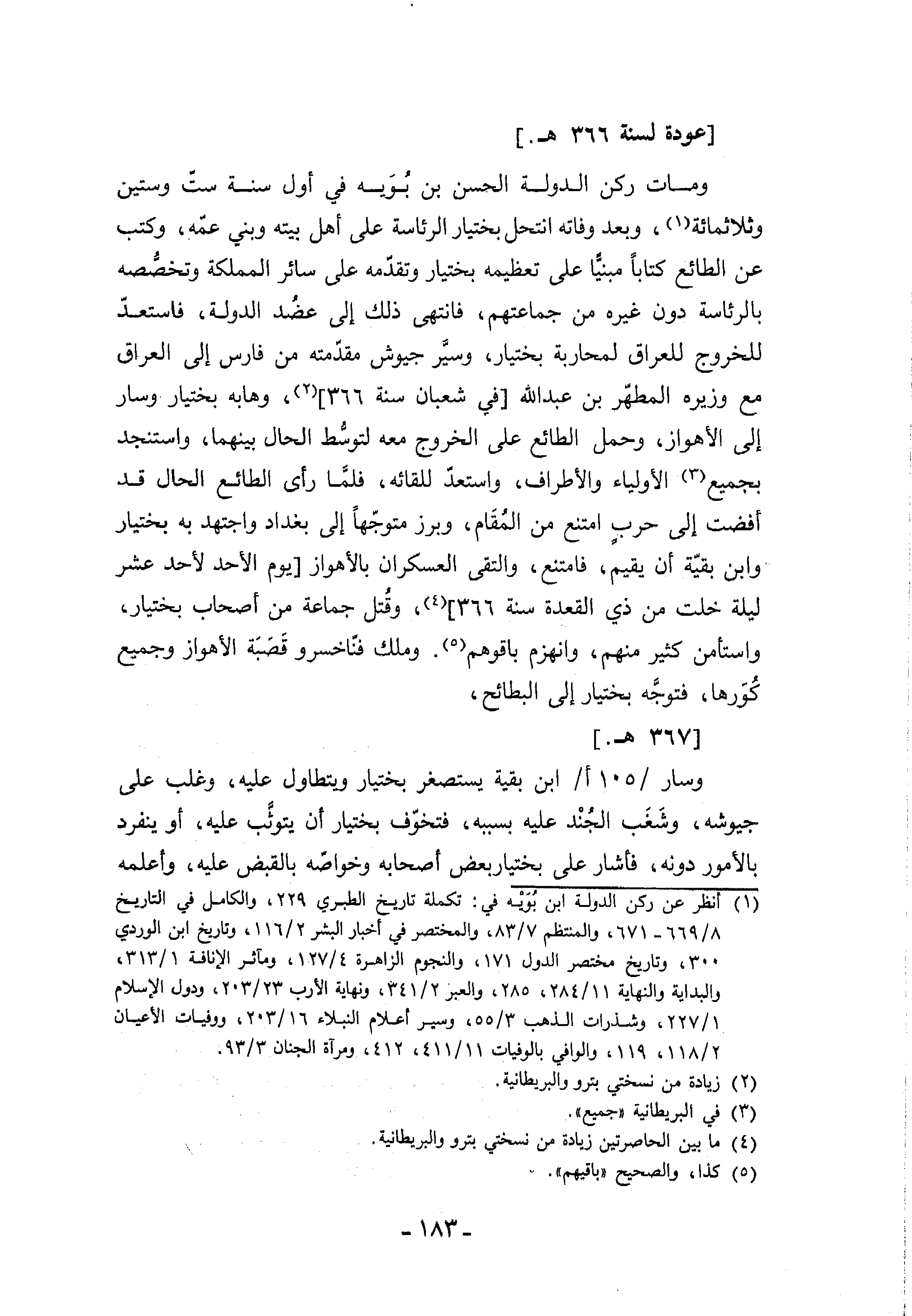 (¬1) أنظر عن ركن الدولة ابن بويه في: تكملة تاريخ الطبري 229، والكامل في التاريخ 8/ 669 - 671، والمنتظم 7/ 83، والمختصر في أخبار البشر 2/ 116، وتاريخ ابن الوردي 300، وتاريخ مختصر الدول 171، والنجوم الزاهرة 4/ 127، ومآثر الإنافة 1/ 313، والبداية والنهاية 11/ 284،285، والعبر 2/ 341، ونهاية الأرب 23/ 203، ودول الإسلام 1/ 227، وشذرات الذهب 3/ 55، وسير أعلام النبلاء 16/ 203، ووفيات الأعيان 2/ 118،119، والوافي بالوفيات 11/ 411،412، ومرآة الجنان 3/ 93.