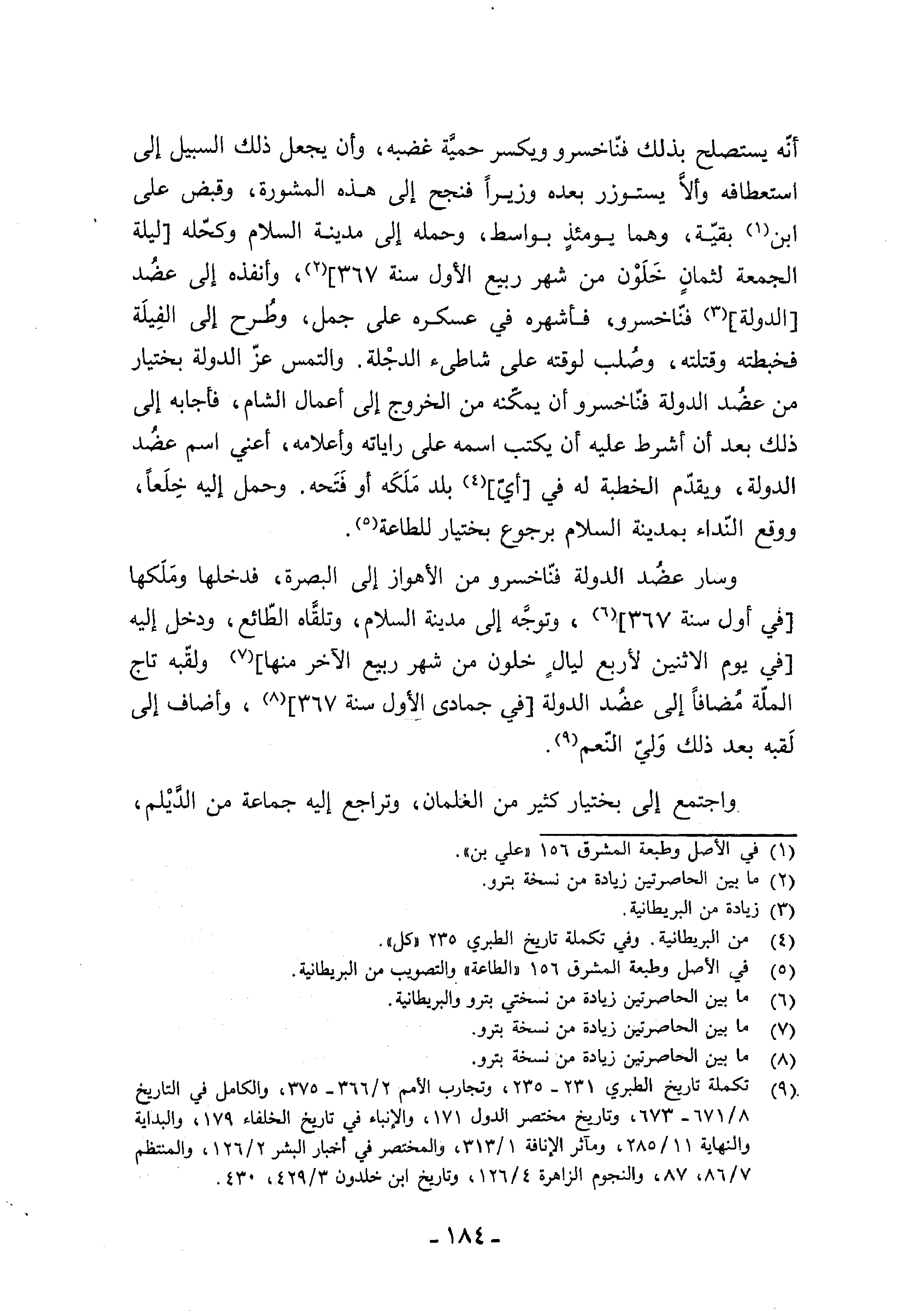 (¬9) تكملة تاريخ الطبري 231 - 235، وتجارب الأمم 2/ 366 - 375، والكامل في التاريخ 8/ 671 - 673، وتاريخ مختصر الدول 171، والإنباء في تاريخ الخلفاء 179، والبداية والنهاية 11/ 285، ومآثر الإنافة 1/ 313، والمختصر في أخبار البشر 2/ 126، والمنتظم 7/ 86،87، والنجوم الزاهرة 4/ 126، وتاريخ ابن خلدون 3/ 429،430.