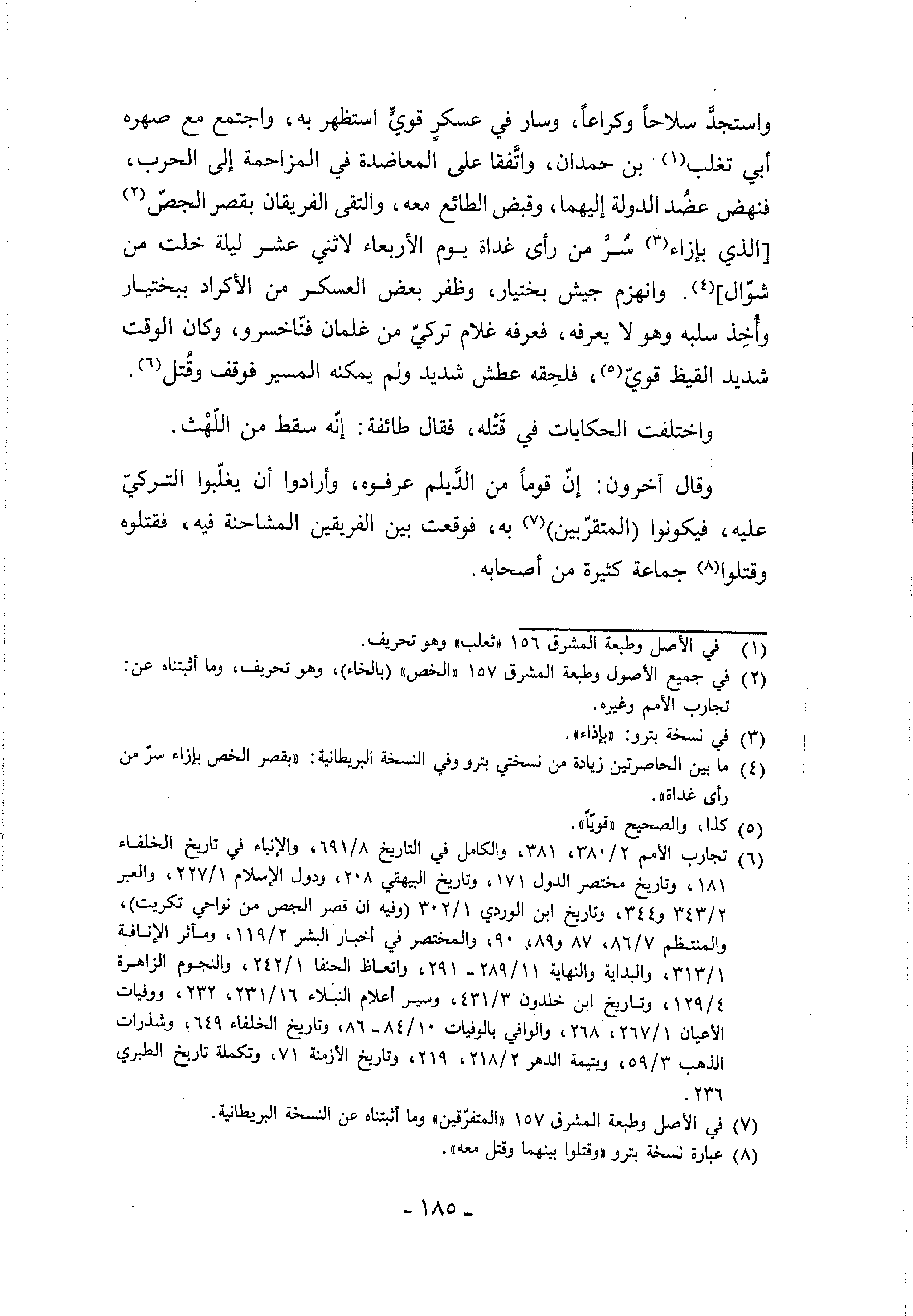 (¬6) تجارب الأمم 2/ 380،381، والكامل في التاريخ 8/ 691، والإنباء في تاريخ الخلفاء 181، وتاريخ مختصر الدول 171، وتاريخ البيهقي 208، ودول الإسلام 1/ 227، والعبر 2/ 343 و 344، وتاريخ ابن الوردي 1/ 302 (وفيه ان قصر الجص من نواحي تكريت)، والمنتظم 7/ 86،87 و 89،90، والمختصر في أخبار البشر 2/ 119، ومآثر الإنافة 1/ 313، والبداية والنهاية 11/ 289 - 291، واتعاظ الحنفا 1/ 242، والنجوم الزاهرة 4/ 129، وتاريخ ابن خلدون 3/ 431، وسير أعلام النبلاء 16/ 231،232، ووفيات الأعيان 1/ 267،268، والوافي بالوفيات 10/ 84 - 86، وتاريخ الخلفاء 649، وشذرات الذهب 3/ 59، ويتيمة الدهر 2/ 218،219، وتاريخ الأزمنة 71، وتكملة تاريخ الطبري 236.