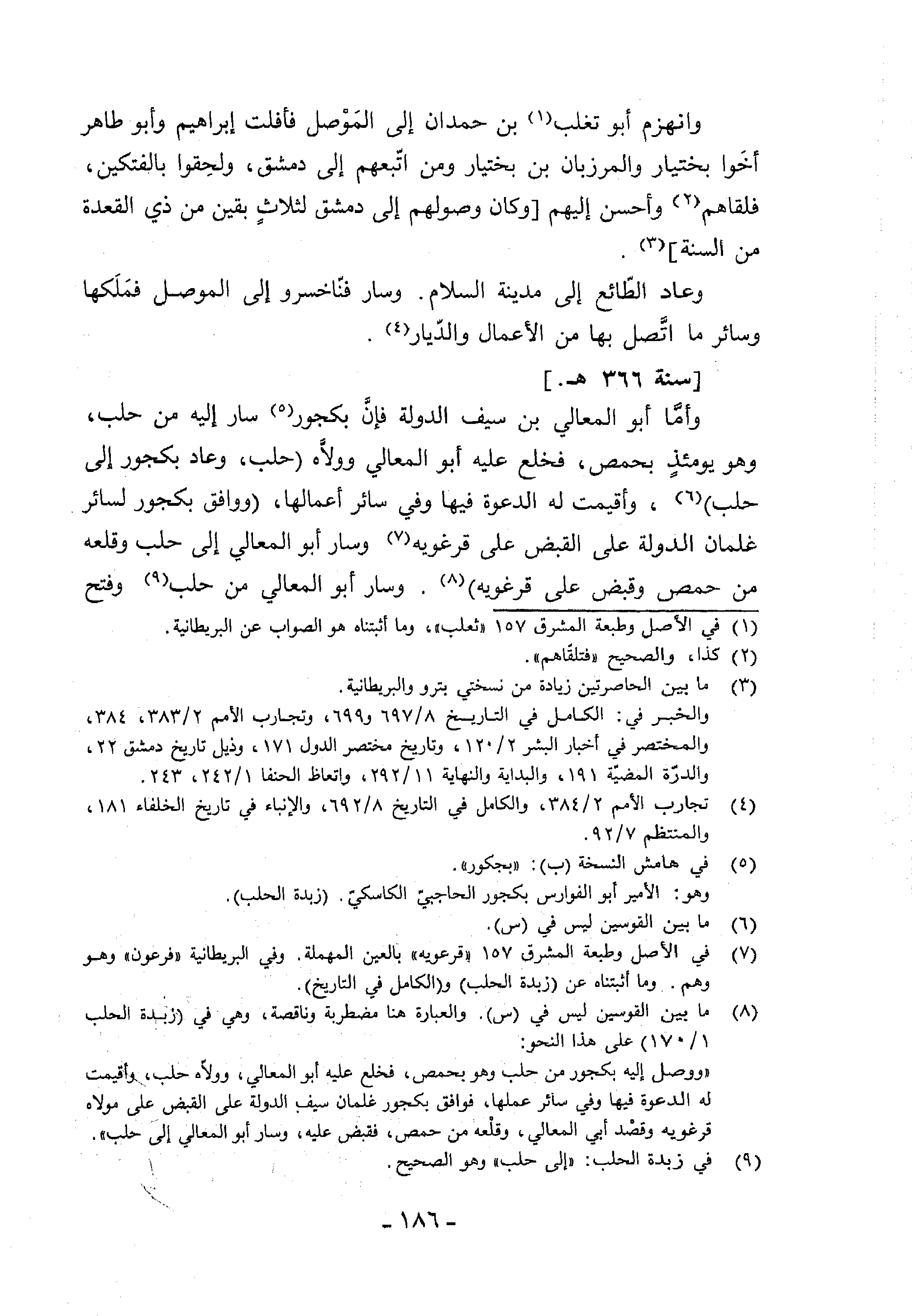 (¬8) ما بين القوسين ليس في (س). والعبارة هنا مضطربة وناقصة، وهي في (زبدة الحلب 1/ 170) على هذا النحو: «ووصل إليه بكجور من حلب وهو بحمص، فخلع عليه أبو المعالي، وولاّه حلب، وأقيمت له الدعوة فيها وفي سائر عملها، فوافق بكجور غلمان سيف الدولة على القبض على مولاه قرغويه وقصد أبي المعالي، وقلعه من حمص، فقبض عليه، وسار أبو المعالي إلى حلب».