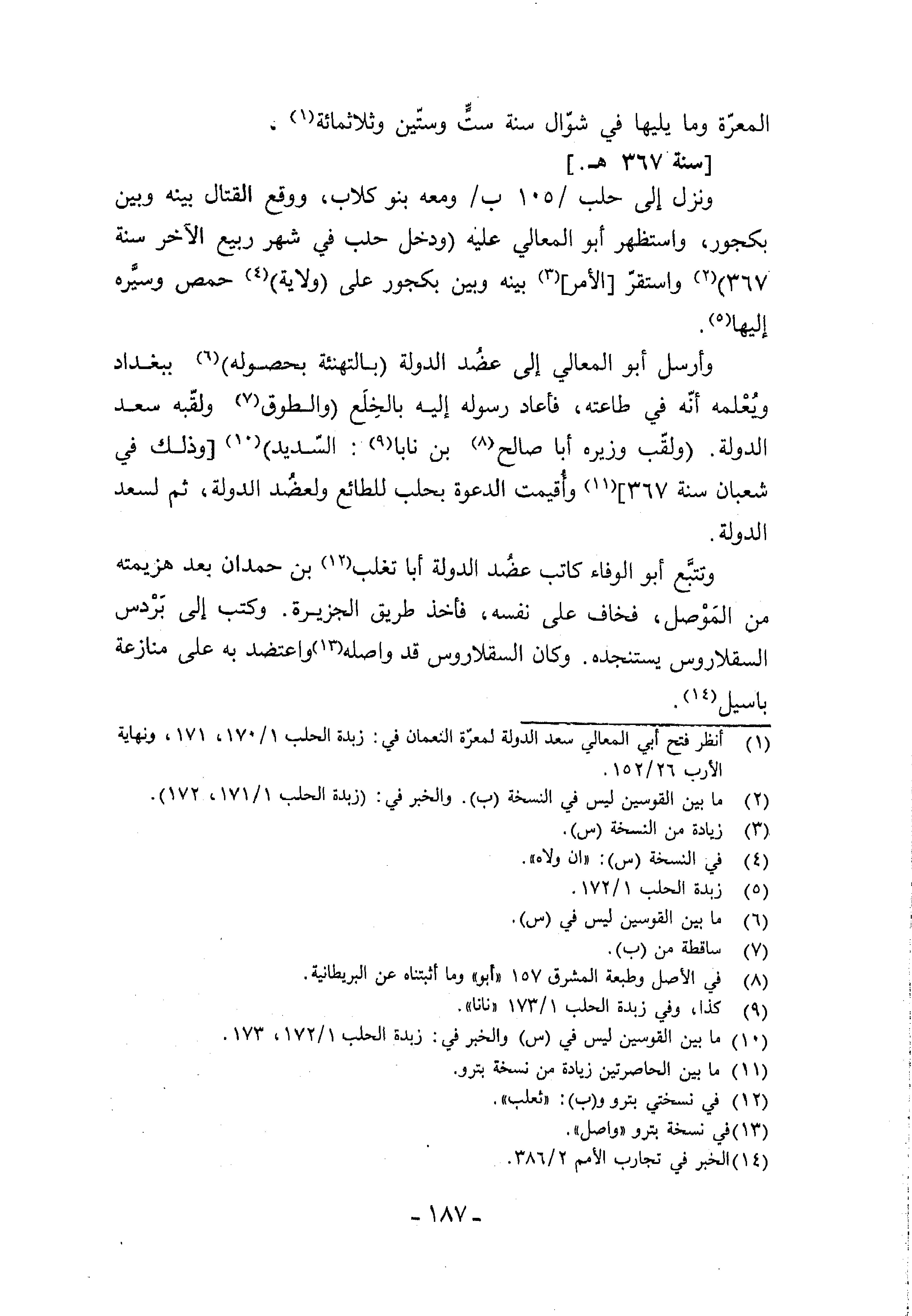 (¬1) أنظر فتح أبي المعالي سعد الدولة لمعرّة النعمان في: زبدة الحلب 1/ 170،171، ونهاية الأرب 26/ 152.