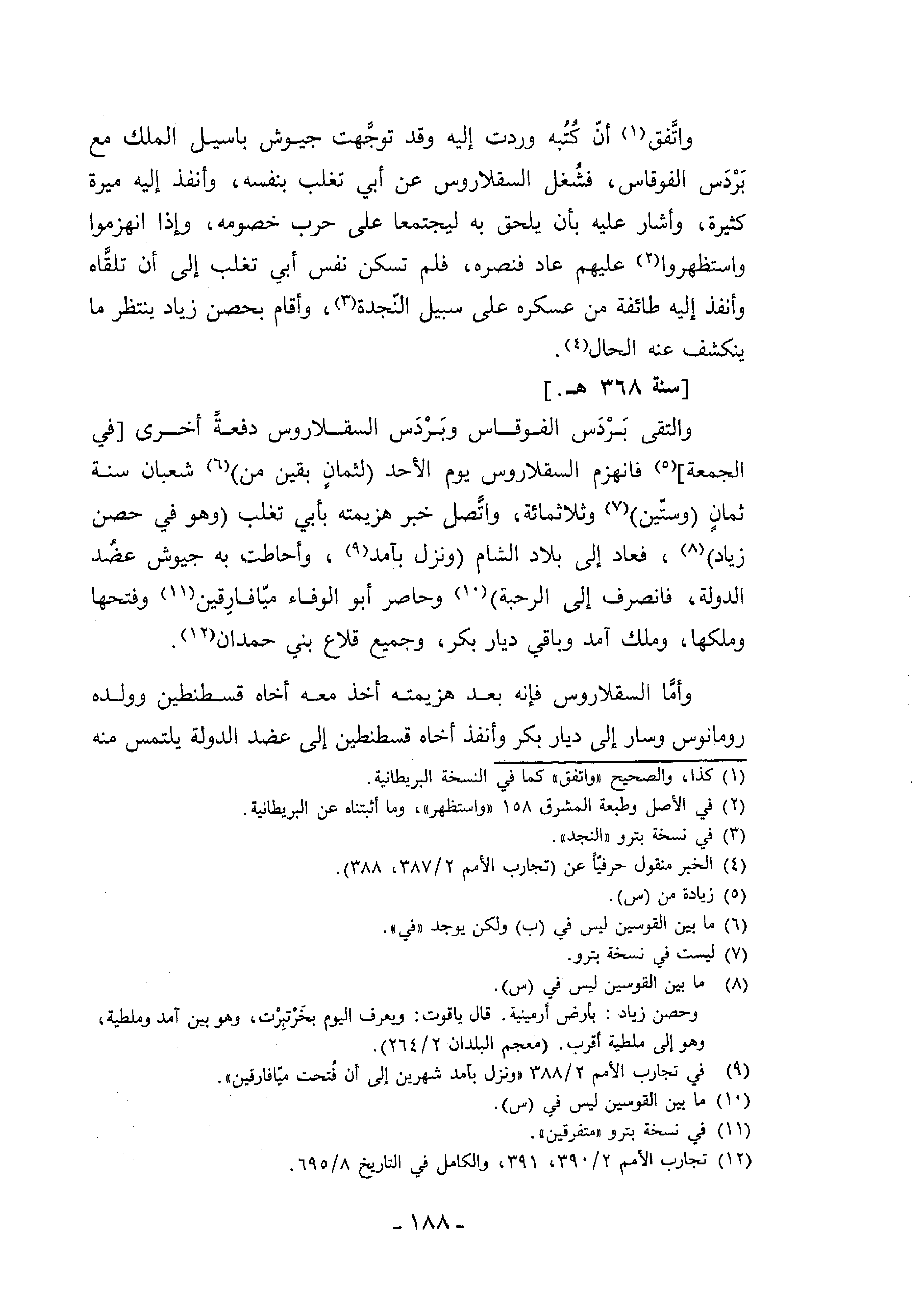 والتقى بردس الفوقاس وبردس السقلاروس دفعة أخرى [في الجمعة] (¬5) فانهزم السقلاروس يوم الأحد (لثمان بقين من) (¬6) شعبان سنة ثمان (وستّين) (¬7) وثلاثمائة، واتّصل خبر هزيمته بأبي تغلب (وهو في حصن زياد) (¬8)، فعاد إلى بلاد الشام (ونزل بآمد (¬9)، وأحاطت به جيوش عضد الدولة، فانصرف إلى الرحبة) (¬10) وحاصر أبو الوفاء ميّافارقين (¬11) وفتحها وملكها، وملك آمد وباقي ديار بكر، وجميع قلاع بني حمدان (¬12).