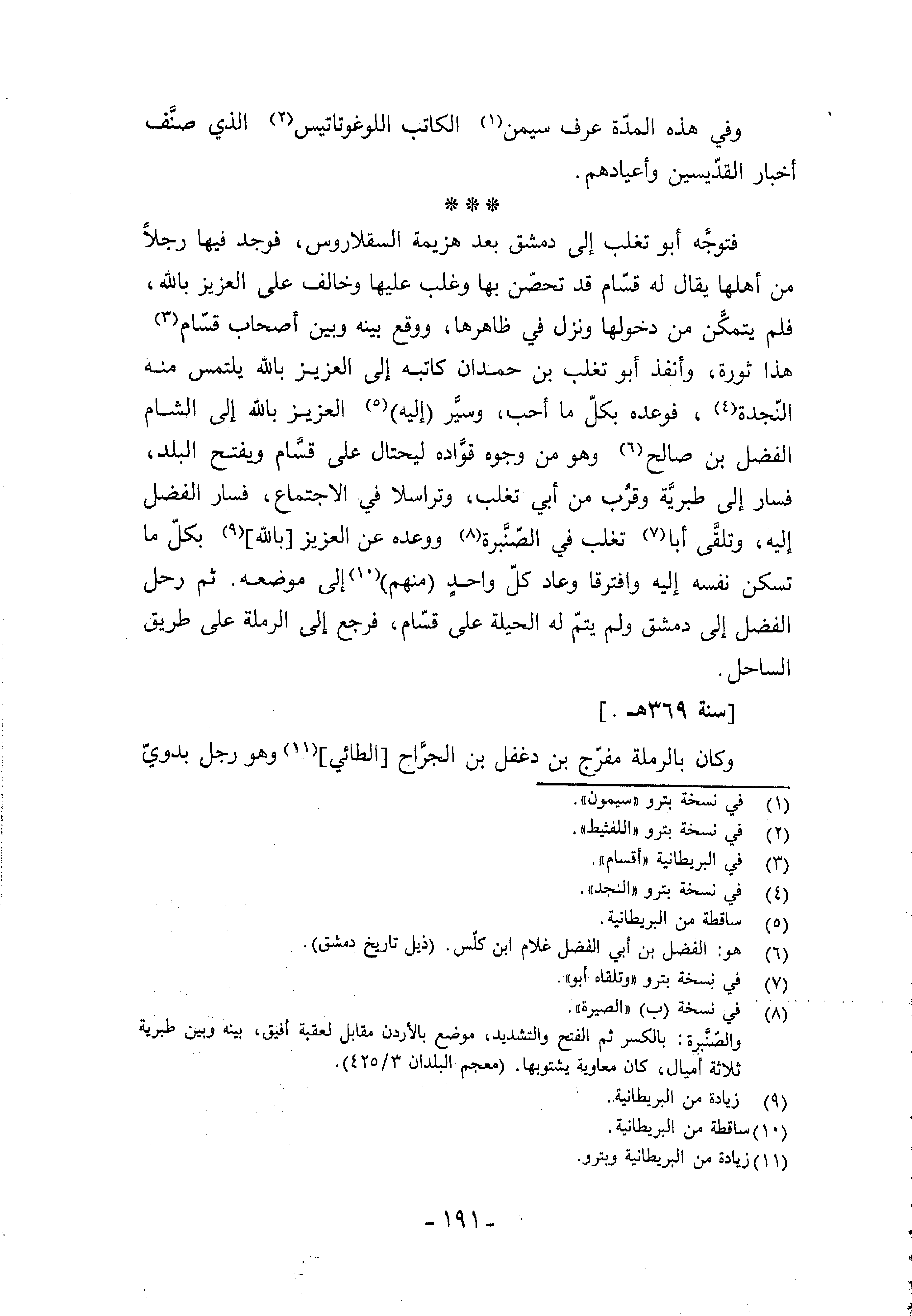 وأنفذ أبو تغلب بن حمدان كاتبه إلى العزيز بالله يلتمس منه النّجدة (¬4)، فوعده بكلّ ما أحب، وسيّر (إليه) (¬5) العزيز بالله إلى الشام الفضل بن صالح (¬6) وهو من وجوه قوّاده ليحتال على قسّام ويفتح البلد، فسار إلى طبريّة وقرب من أبي تغلب، وتراسلا في الاجتماع، فسار الفضل إليه، وتلقّى أبا (¬7) تغلب في الصّنّبرة (¬8) ووعده عن العزيز [بالله] (¬9) بكلّ ما تسكن نفسه إليه وافترقا وعاد كلّ واحد (منهم) (¬10) إلى موضعه. ثم رحل الفضل إلى دمشق ولم يتمّ له الحيلة على قسّام، فرجع إلى الرملة على طريق الساحل.