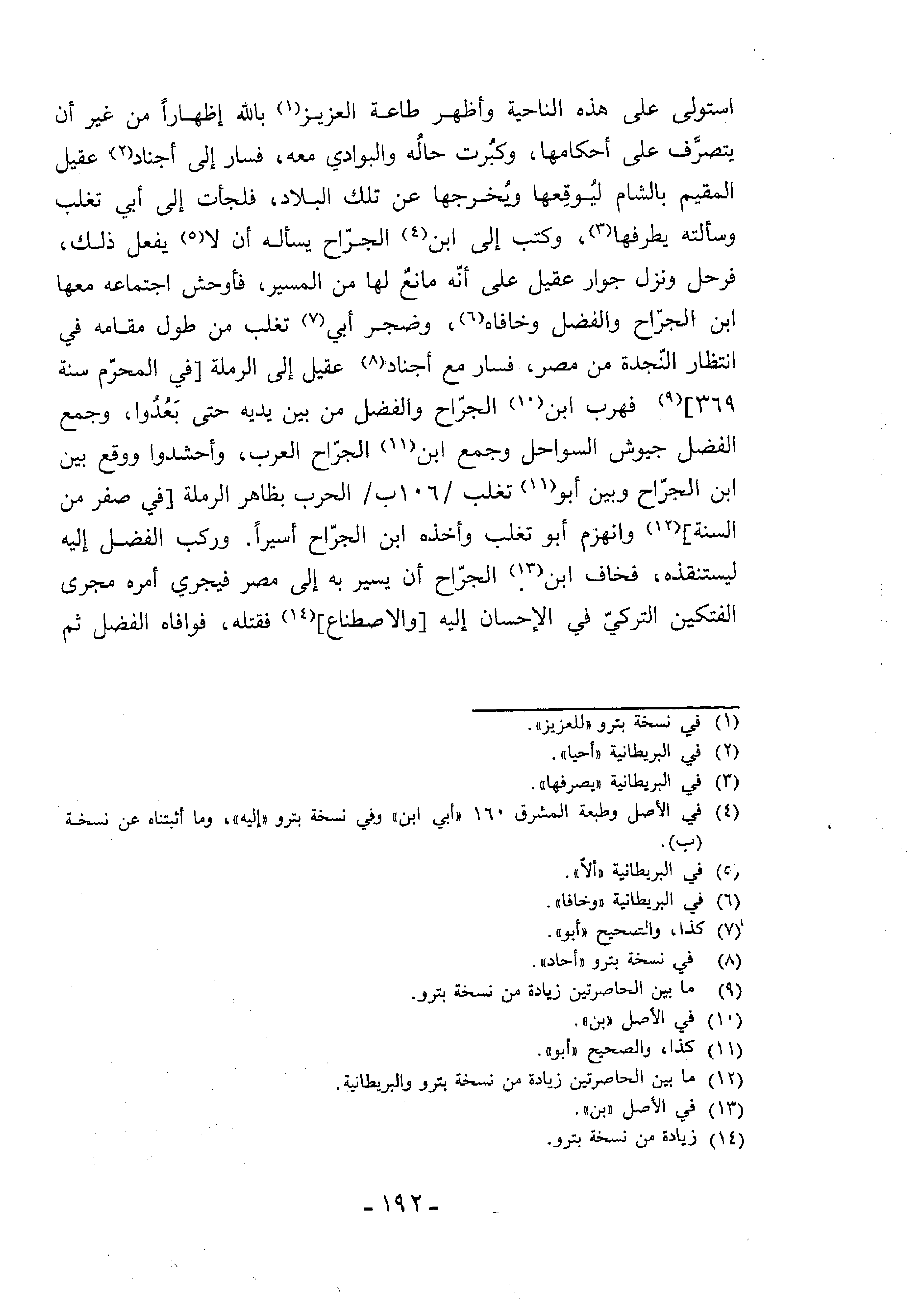 فسار مع أجناد (¬8) عقيل إلى الرملة [في المحرّم سنة 369] (¬9) فهرب ابن (¬10) الجرّاح والفضل من بين يديه حتى بعدوا، وجمع الفضل جيوش السواحل وجمع ابن (10) الجرّاح العرب، وأحشدوا ووقع بين ابن الجرّاح وبين أبو (¬11) تغلب/106 ب/الحرب بظاهر الرملة [في صفر من السنة] (¬12)