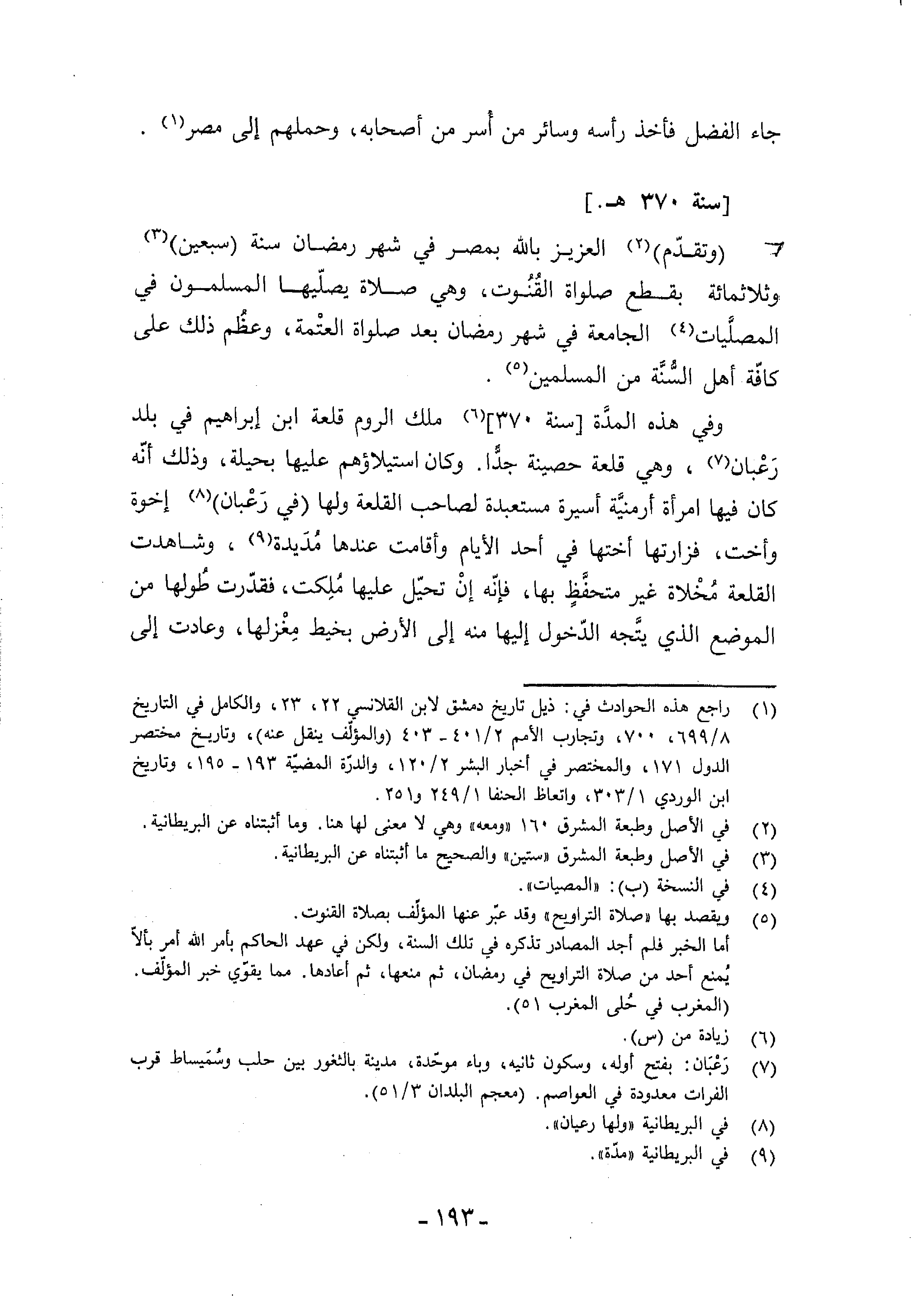 (¬5) ويقصد بها «صلاة التراويح» وقد عبّر عنها المؤلّف بصلاة القنوت. أما الخبر فلم أجد المصادر تذكره في تلك السنة، ولكن في عهد الحاكم بأمر الله أمر بألاّ يمنع أحد من صلاة التراويح في رمضان، ثم منعها، ثم أعادها. مما يقوّي خبر المؤلّف. (المغرب في حلى المغرب 51).