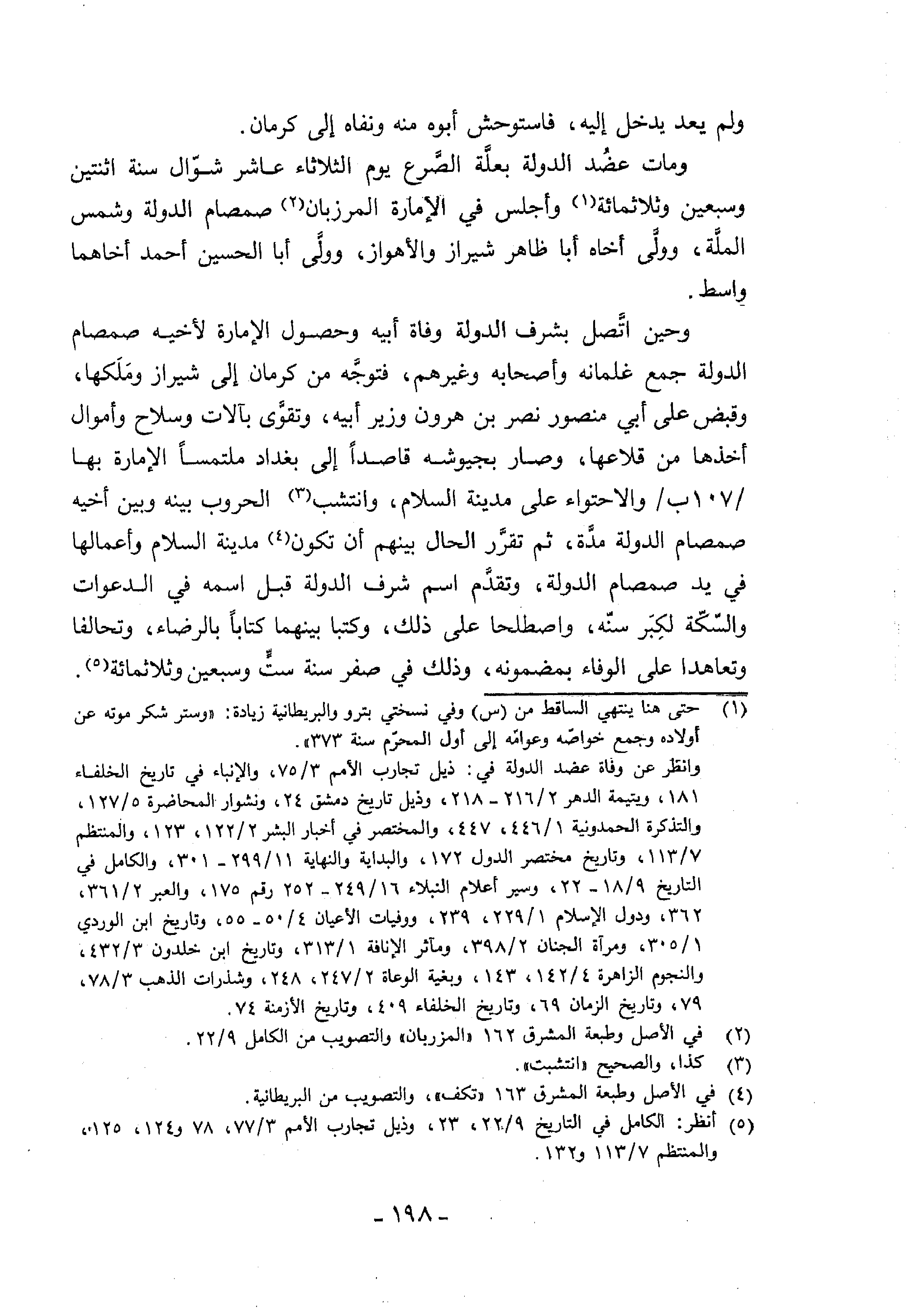 (¬5) أنظر: الكامل في التاريخ 9/ 22،23، وذيل تجارب الأمم 3/ 77،78 و 124،125، والمنتظم 7/ 113 و 132.