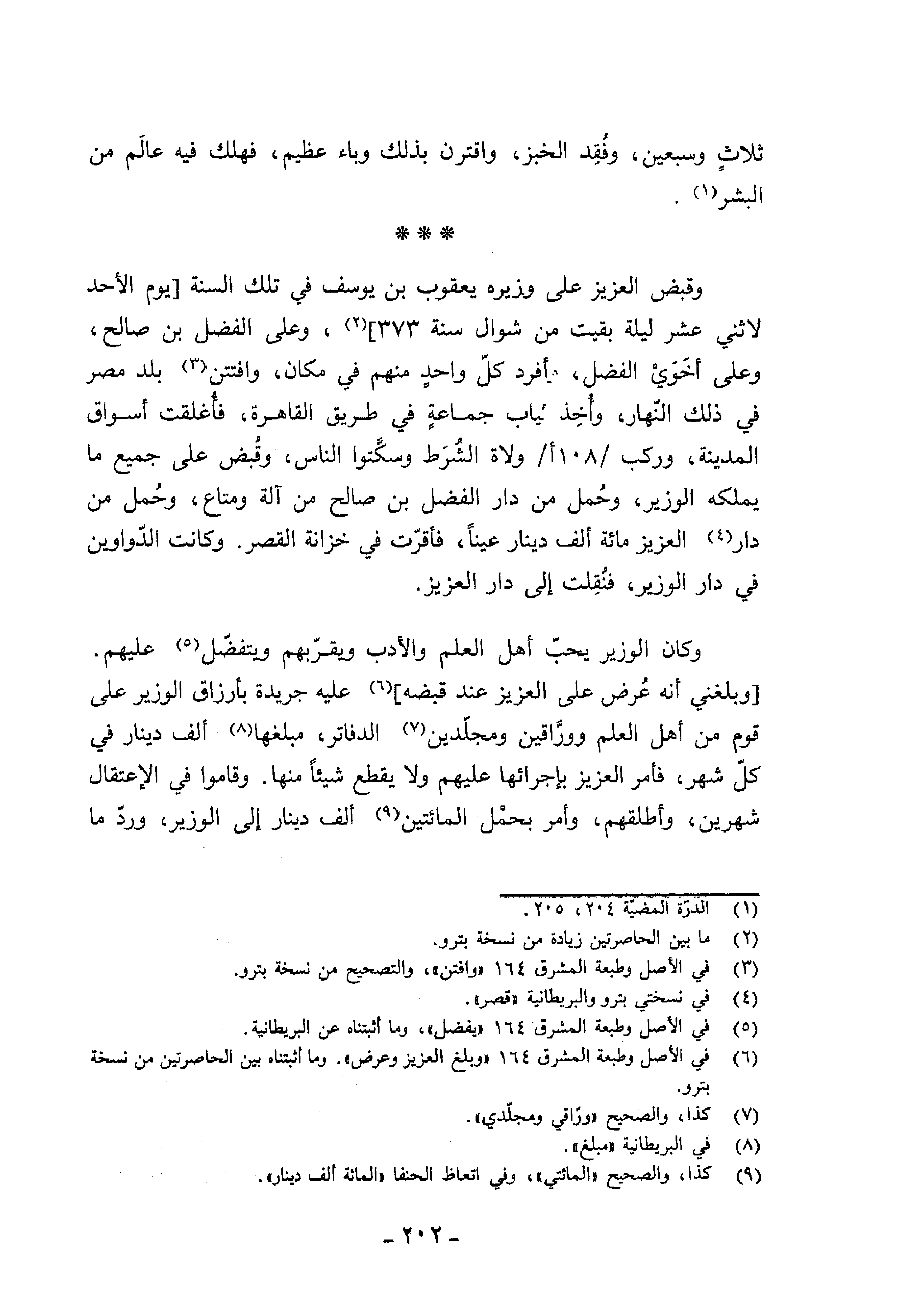 وعلى الفضل بن صالح، وعلى أخوي الفضل، أفرد كلّ واحد منهم في مكان، وافتتن (¬3) بلد مصر في ذلك النّهار، وأخذ ثياب جماعة في طريق القاهرة، فأغلقت أسواق المدينة، وركب/108 أ/ولاة الشرط وسكّتوا الناس، وقبض على جميع ما يملكه الوزير، وحمل من دار الفضل بن صالح من آلة ومتاع، وحمل من دار (¬4) العزيز مائة ألف دينار عينا، فأقرّت في خزانة القصر. وكانت الدّواوين في دار الوزير، فنقلت إلى دار العزيز.
