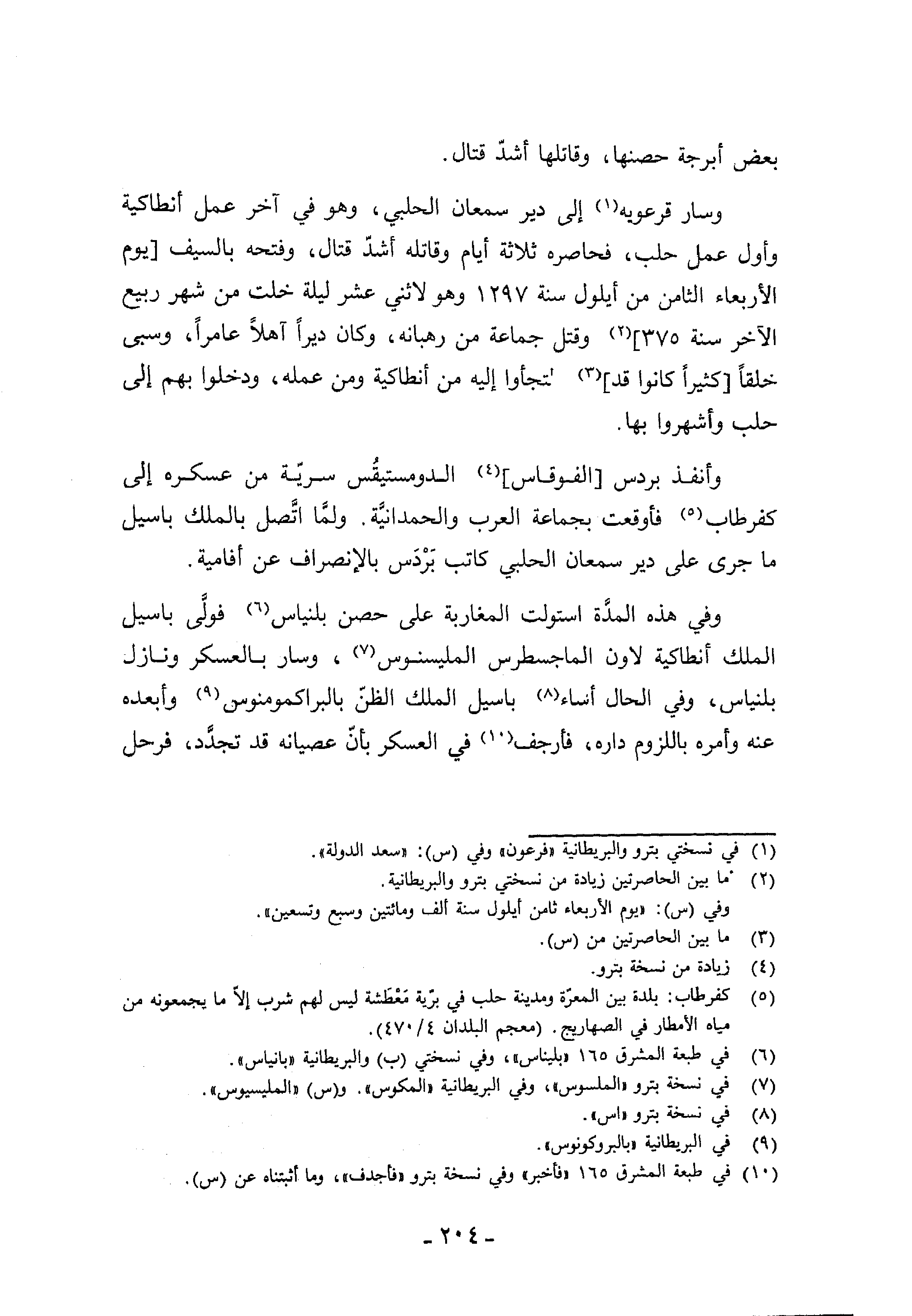 وأنفذ بردس [الفوقاس] (¬4) الدومستيقس سريّة من عسكره إلى كفرطاب (¬5) فأوقعت بجماعة العرب والحمدانيّة. ولمّا اتّصل بالملك باسيل ما جرى على دير سمعان الحلبي كاتب بردس بالإنصراف عن أفامية.