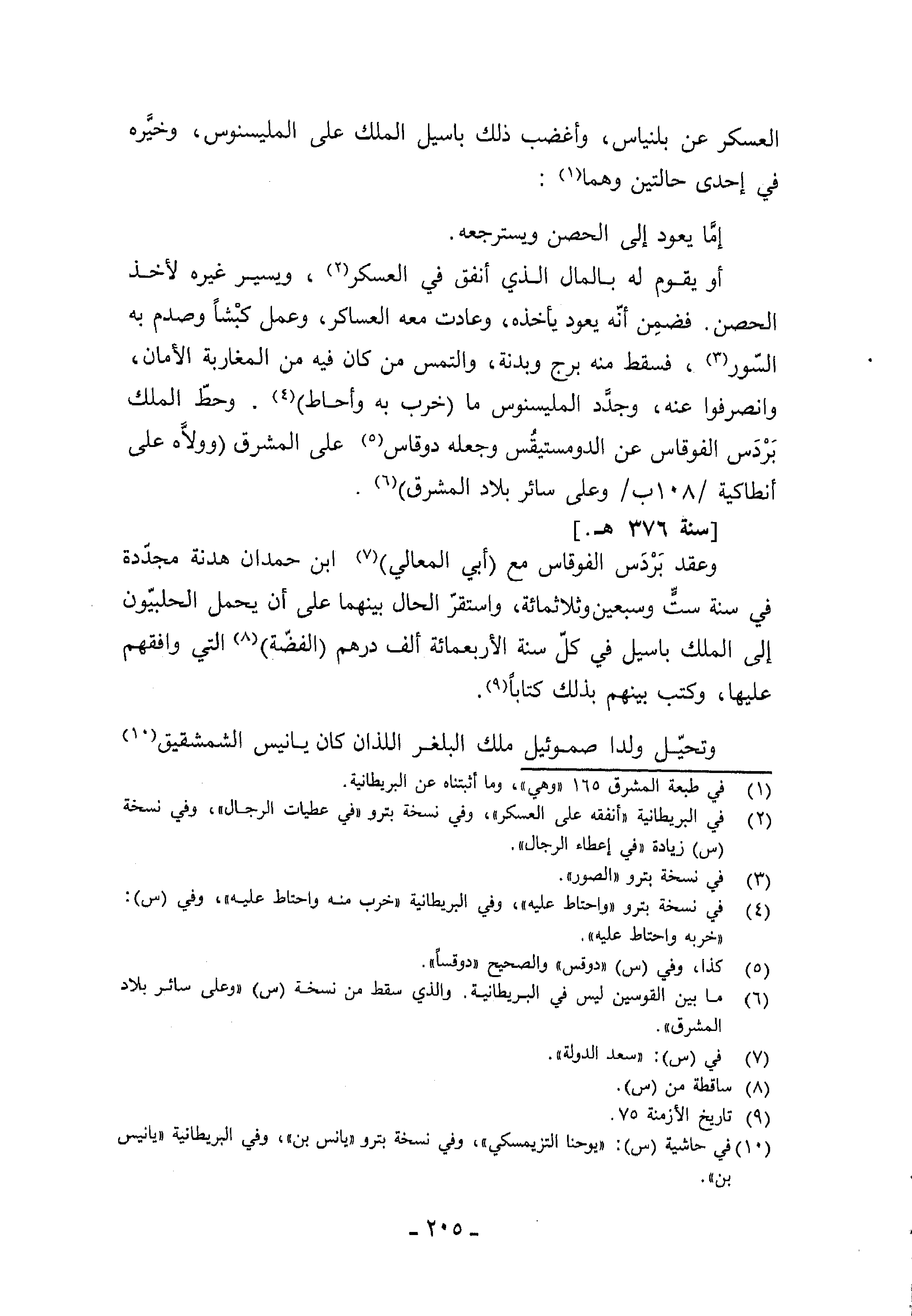 وعقد بردس الفوقاس مع (أبي المعالي) (¬7) ابن حمدان هدنة مجدّدة في سنة ستّ وسبعين وثلاثمائة، واستقرّ الحال بينهما على أن يحمل الحلبيّون إلى الملك باسيل في كلّ سنة الأربعمائة ألف درهم (الفضّة) (¬8) التي وافقهم عليها، وكتب بينهم بذلك كتابا (¬9).