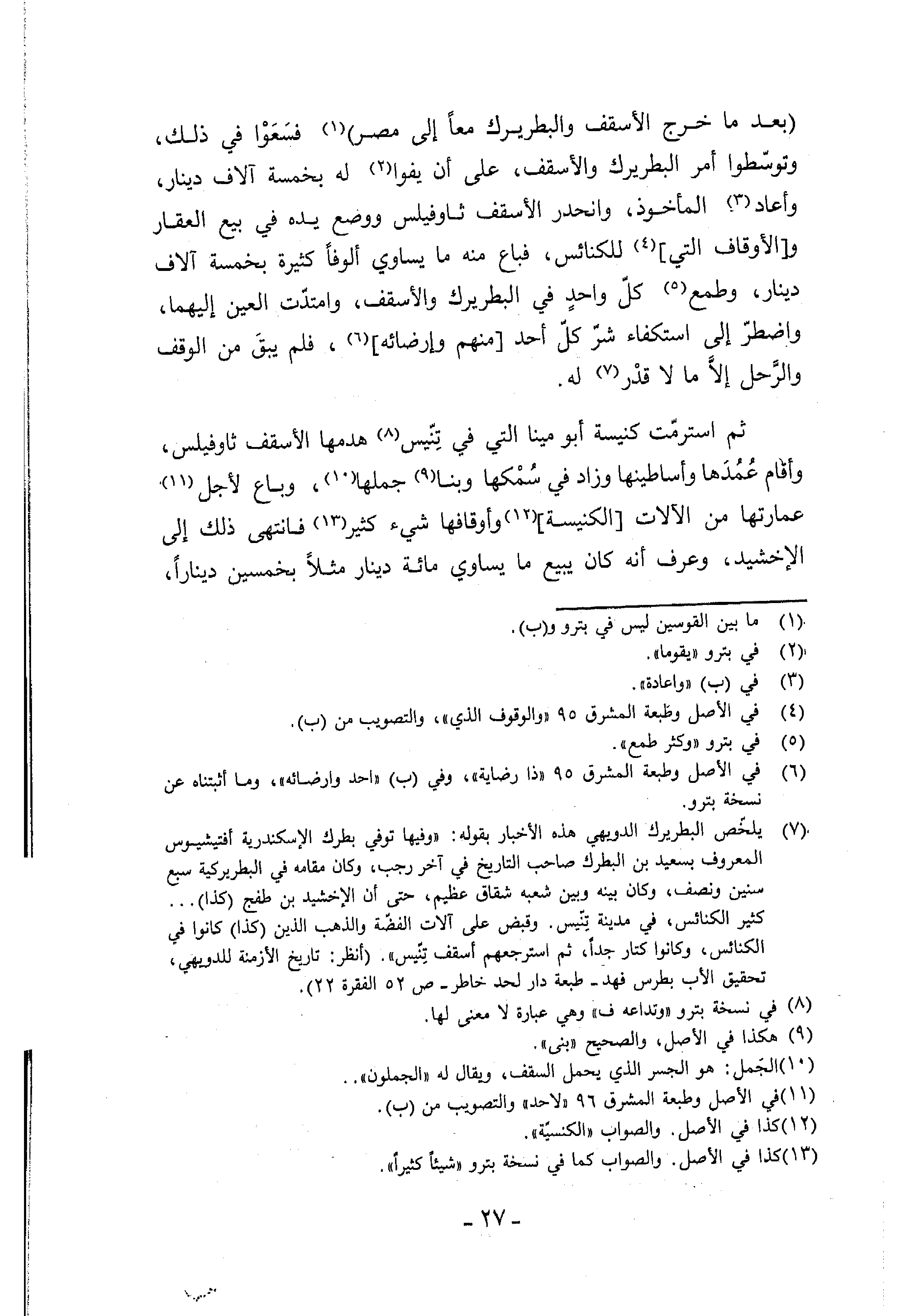 (¬7) يلخّص البطريرك الدويهي هذه الأخبار بقوله: «وفيها توفي بطرك الإسكندرية أفتيشيوس المعروف بسعيد بن البطرك صاحب التاريخ في آخر رجب، وكان مقامه في البطريركية سبع سنين ونصف، وكان بينه وبين شعبه شقاق عظيم، حتى أن الإخشيد بن طفج (كذا). . . كثير الكنائس، في مدينة تنّيس. وقبض على آلات الفضّة والذهب الذين (كذا) كانوا في الكنائس، وكانوا كتار جدا، ثم استرجعهم أسقف تنّيس». (أنظر: تاريخ الأزمنة للدويهي، تحقيق الأب بطرس فهد-طبعة دار لحد خاطر-ص 52 الفقرة 22).