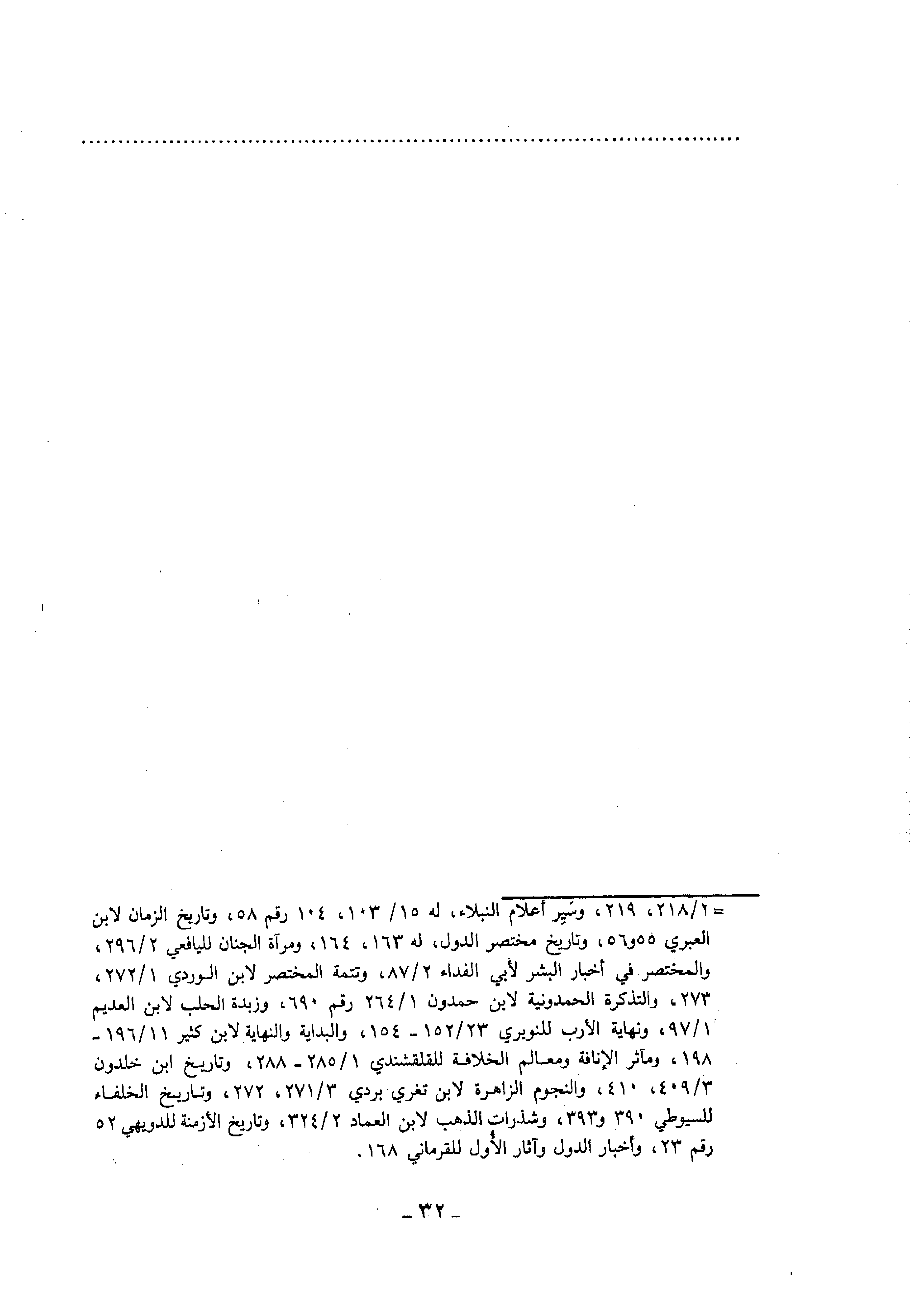 (9) -2/ 218،219، وسير أعلام النبلاء، له 15/ 103،104 رقم 58، وتاريخ الزمان لابن العبري 55 و 56، وتاريخ مختصر الدول، له 163،164، ومرآة الجنان لليافعي 2/ 296، والمختصر في أخبار البشر لأبي الفداء 2/ 87، وتتمة المختصر لابن الوردي 1/ 272، 273، والتذكرة الحمدونية لابن حمدون 1/ 264 رقم 690، وزبدة الحلب لابن العديم 1/ 97، ونهاية الأرب للنويري 23/ 152 - 154، والبداية والنهاية لابن كثير 11/ 196 - 198، ومآثر الإنافة ومعالم الخلافة للقلقشندي 1/ 285 - 288، وتاريخ ابن خلدون 3/ 409،410، والنجوم الزاهرة لابن تغري بردي 3/ 271،272، وتاريخ الخلفاء للسيوطي 390 و 393، وشذرات الذهب لابن العماد 2/ 324، وتاريخ الأزمنة للدويهي 52 رقم 23، وأخبار الدول وآثار الأول للقرماني 168.