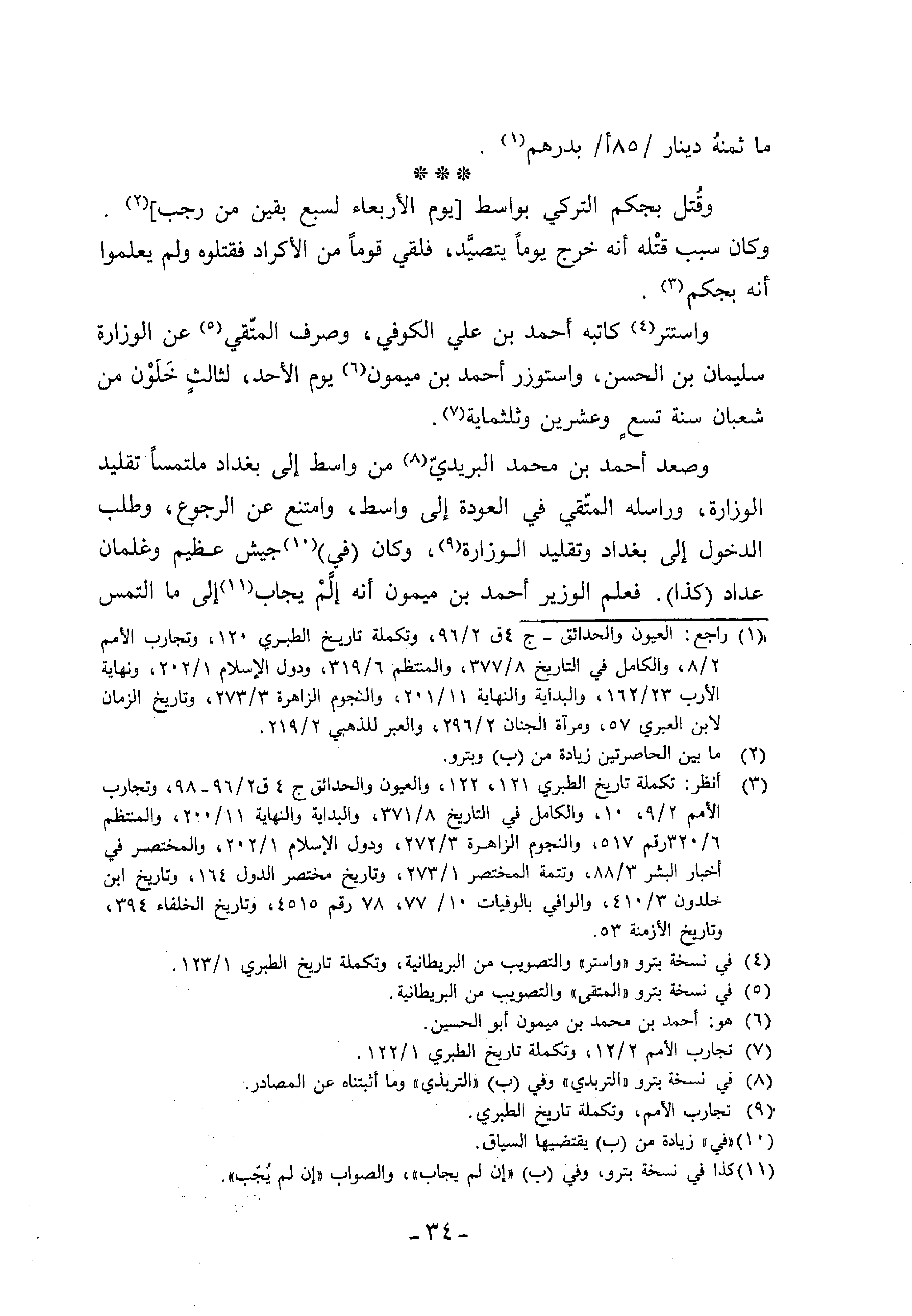 (¬3) أنظر: تكملة تاريخ الطبري 121،122، والعيون والحدائق ج 4 ق 2/ 96 - 98، وتجارب الأمم 2/ 9،10، والكامل في التاريخ 8/ 371، والبداية والنهاية 11/ 200، والمنتظم 6/ 320 رقم 517، والنجوم الزاهرة 3/ 272، ودول الإسلام 1/ 202، والمختصر في أخبار البشر 3/ 88، وتتمة المختصر 1/ 273، وتاريخ مختصر الدول 164، وتاريخ ابن خلدون 3/ 410، والوافي بالوفيات 10/ 77،78 رقم 4515، وتاريخ الخلفاء 394، وتاريخ الأزمنة 53.