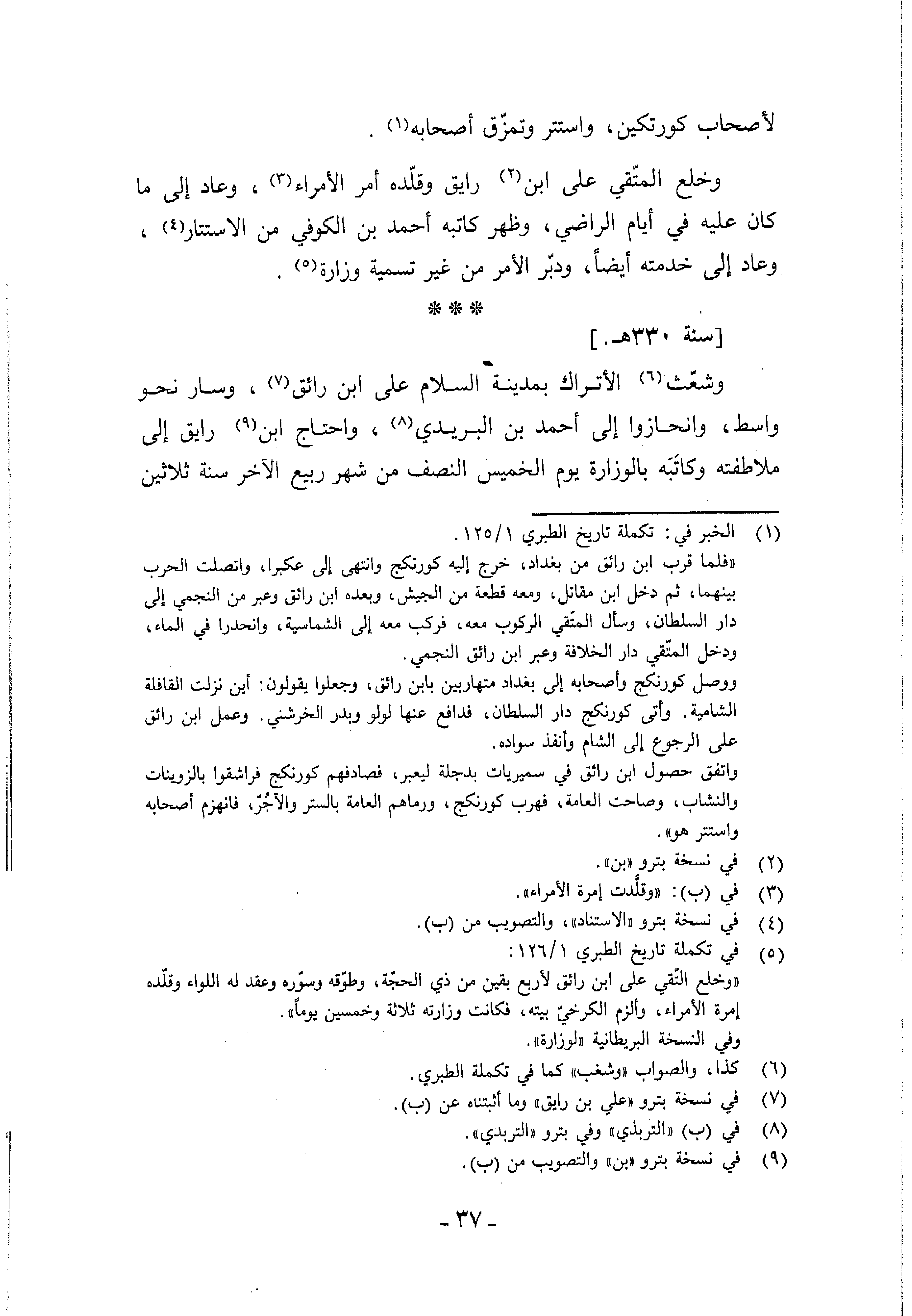 (¬5) في تكملة تاريخ الطبري 1/ 126: «وخلع التّقي على ابن رائق لأربع بقين من ذي الحجّة، وطوّقه وسوّره وعقد له اللواء وقلّده إمرة الأمراء، وألزم الكرخيّ بيته، فكانت وزارته ثلاثة وخمسين يوما». وفي النسخة البريطانية «لوزارة».
