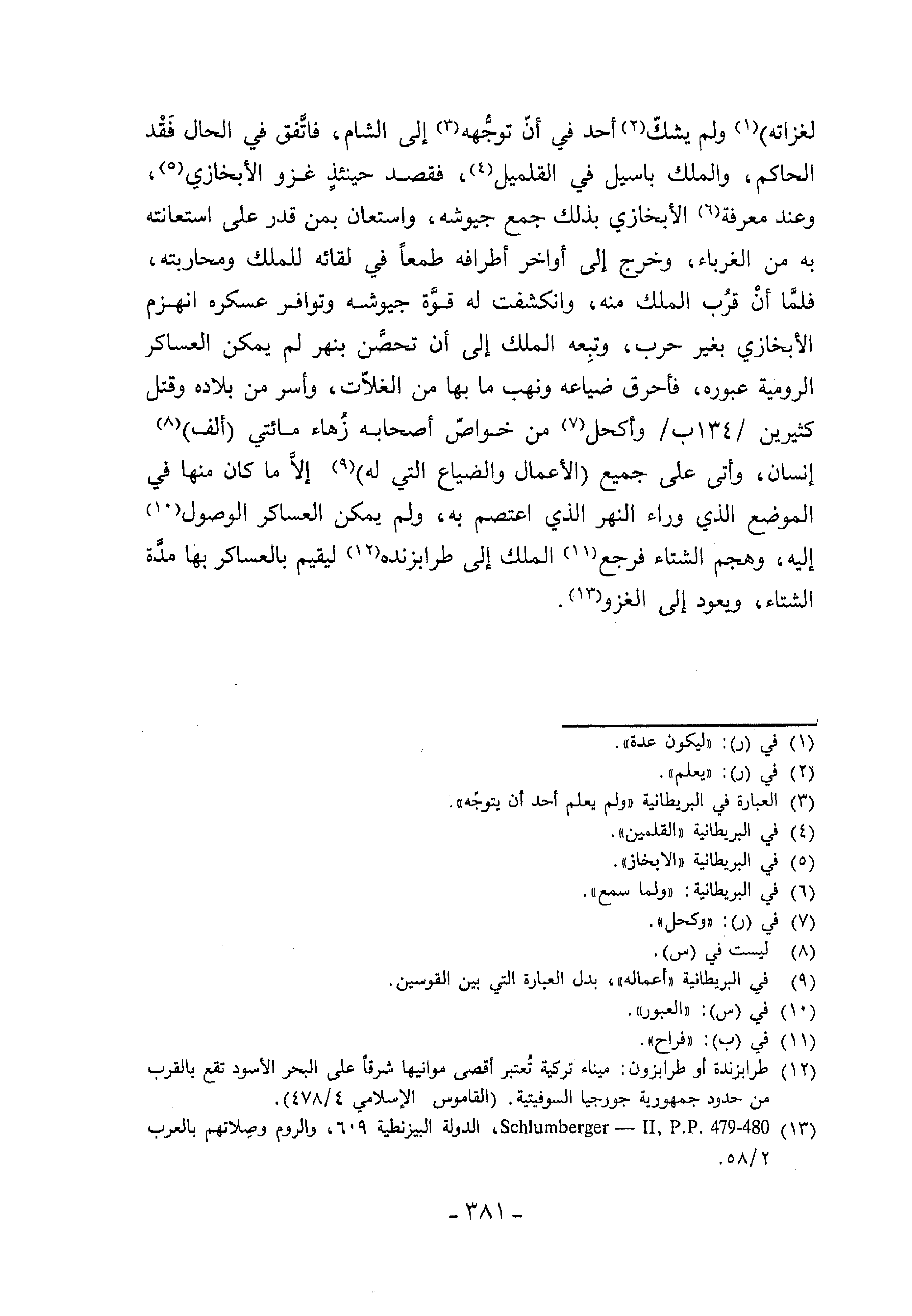 لغزاته) (¬1) ولم يشكّ (¬2) أحد في أنّ توجّهه (¬3) إلى الشام، فاتّفق في الحال فقد الحاكم، والملك باسيل في القلميل (¬4)، فقصد حينئذ غزو الأبخازي (¬5)، وعند معرفة (¬6) الأبخازي بذلك جمع جيوشه، واستعان بمن قدر على استعانته به من الغرباء، وخرج إلى أواخر أطرافه طمعا في لقائه للملك ومحاربته، فلمّا أن قرب الملك منه، وانكشفت له قوّة جيوشه وتوافر عسكره انهزم الأبخازي بغير حرب، وتبعه الملك إلى أن تحصّن بنهر لم يمكن العساكر الرومية عبوره، فأحرق ضياعه ونهب ما بها من الغلاّت، وأسر من بلاده وقتل كثيرين/134 ب/وأكحل (¬7) من خواصّ أصحابه زهاء مائتي (ألف) (¬8) إنسان، وأتى على جميع (الأعمال والضياع التي له) (¬9) إلاّ ما كان منها في الموضع الذي وراء النهر الذي اعتصم به، ولم يمكن العساكر الوصول (¬10) إليه، وهجم الشتاء فرجع (¬11) الملك إلى طرابزنده (¬12) ليقيم بالعساكر بها مدّة الشتاء، ويعود إلى الغزو (¬13).