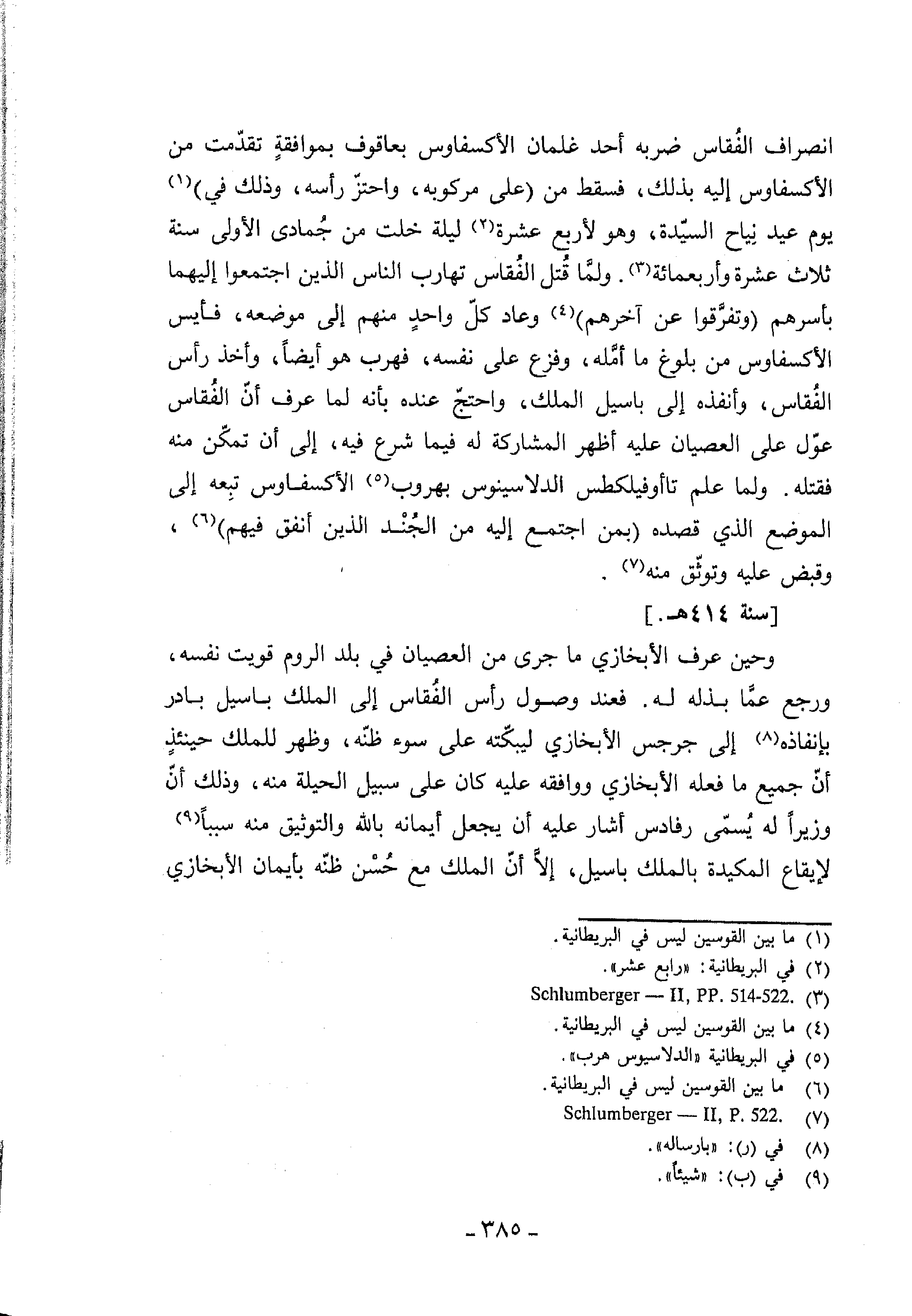وأنفذه إلى باسيل الملك، واحتجّ عنده بأنه لما عرف أنّ الفقاس عوّل على العصيان عليه أظهر المشاركة له فيما شرع فيه، إلى أن تمكّن منه فقتله. ولما علم تاأوفيلكطس الدلاسينوس بهروب (¬5) الأكسفاوس تبعه إلى الموضع الذي قصده (بمن اجتمع إليه من الجند الذين أنفق فيهم) (¬6)، وقبض عليه وتوثّق منه (¬7).