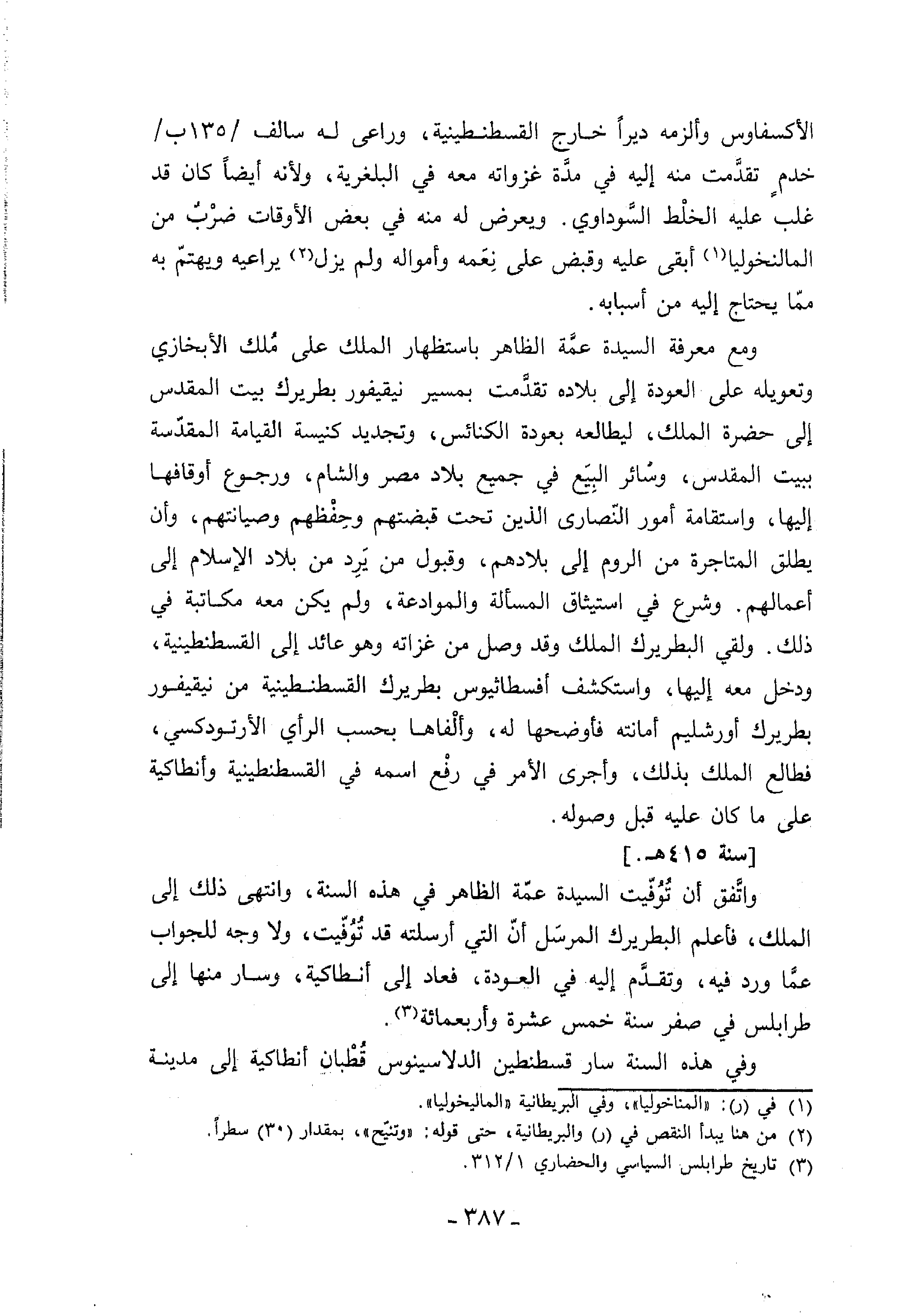 واتّفق أن توفّيت السيدة عمّة الظاهر في هذه السنة، وانتهى ذلك إلى الملك، فأعلم البطريرك المرسل أنّ التي أرسلته قد توفّيت، ولا وجه للجواب عمّا ورد فيه، وتقدّم إليه في العودة، فعاد إلى أنطاكية، وسار منها إلى طرابلس في صفر سنة خمس عشرة وأربعمائة (¬3).