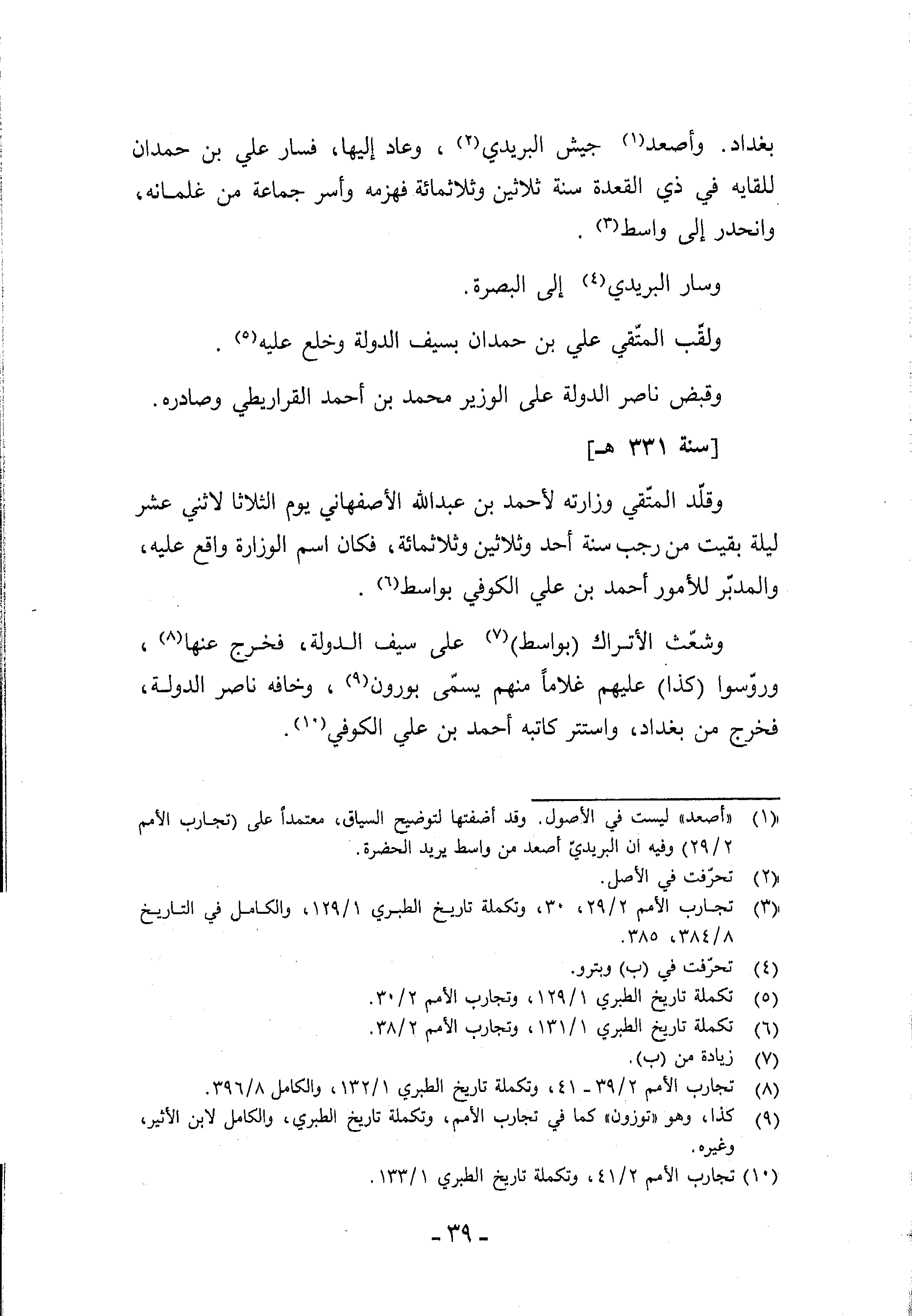 بغداد. وأصعد (¬1) جيش البريدي (¬2)، وعاد إليها، فسار علي بن حمدان للقايه في ذي القعدة سنة ثلاثين وثلاثمائة فهزمه وأسر جماعة من غلمانه، وانحدر إلى واسط (¬3).