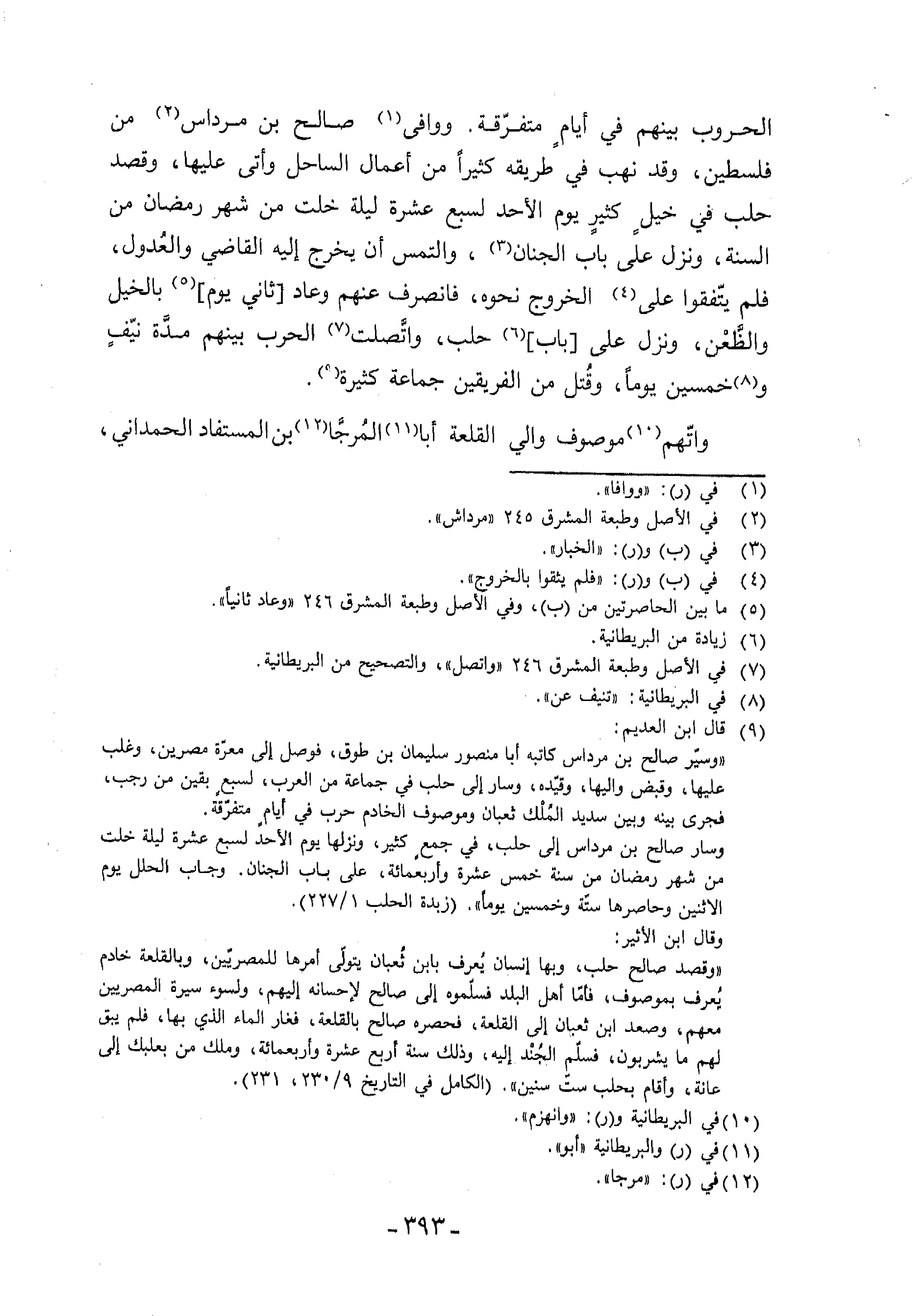 (¬9) قال ابن العديم: «وسيّر صالح بن مرداس كاتبه أبا منصور سليمان بن طوق، فوصل إلى معرّة مصرين، وغلب عليها، وقبض واليها، وقيّده، وسار إلى حلب في جماعة من العرب، لسبع بقين من رجب، فجرى بينه وبين سديد الملك ثعبان وموصوف الخادم حرب في أيام متفرّقة. وسار صالح بن مرداس إلى حلب، في جمع كثير، ونزلها يوم الأحد لسبع عشرة ليلة خلت من شهر رمضان من سنة خمس عشرة وأربعمائة، على باب الجنان. وجاب الحلل يوم الاثنين وحاصرها ستّة وخمسين يوما». (زبدة الحلب 1/ 227). وقال ابن الأثير: «وقصد صالح حلب، وبها إنسان يعرف بابن ثعبان يتولّى أمرها للمصريّين، وبالقلعة خادم يعرف بموصوف، فأمّا أهل البلد فسلّموه إلى صالح لإحسانه إليهم، ولسوء سيرة المصريين معهم، وصعد ابن ثعبان إلى القلعة، فحصره صالح بالقلعة، فغار الماء الذي بها، فلم يبق لهم ما يشربون، فسلّم الجند إليه، وذلك سنة أربع عشرة وأربعمائة، وملك من بعلبك إلى عانة، وأقام بحلب ستّ سنين». (الكامل في التاريخ 9/ 230،231).