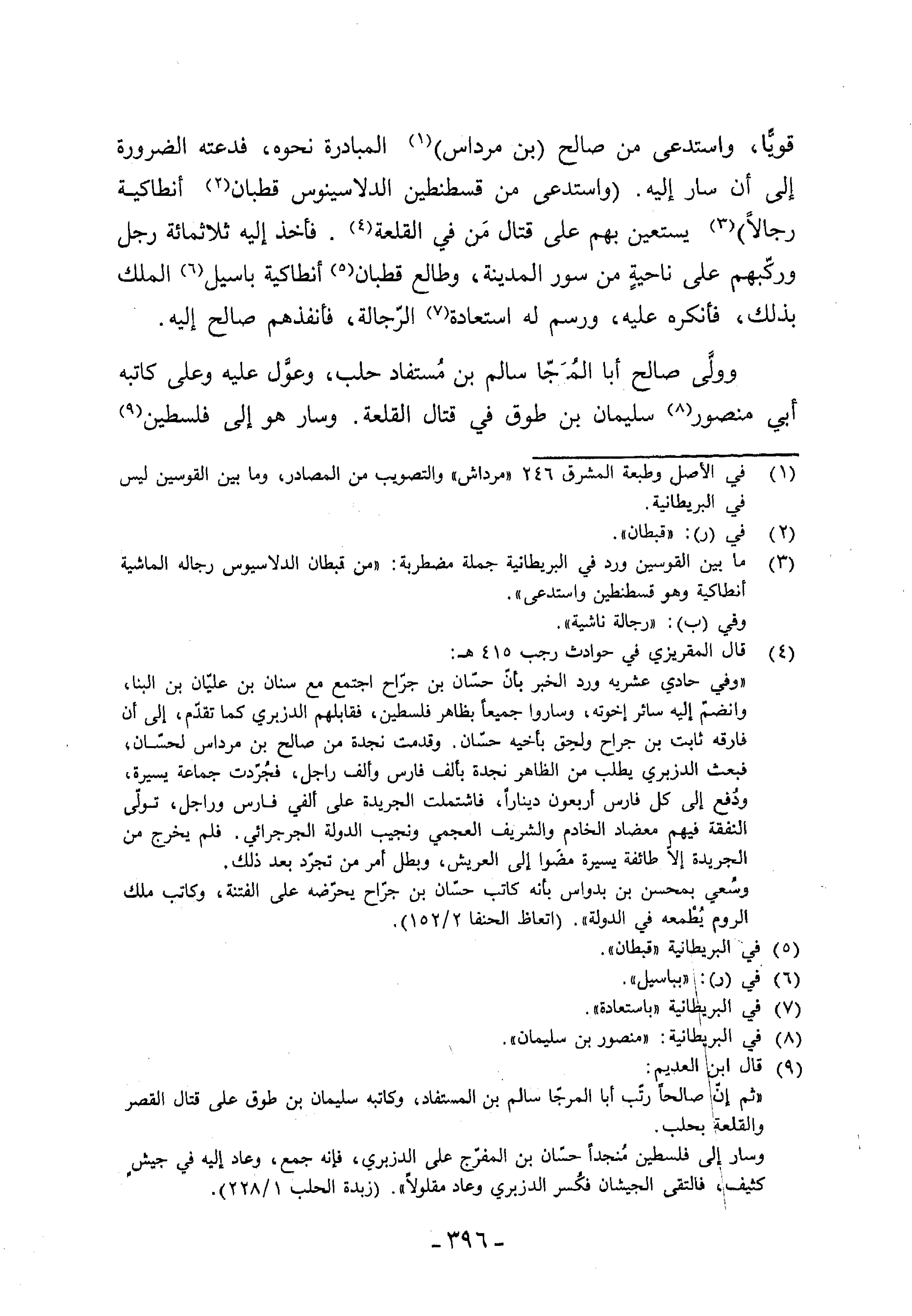واستدعى من صالح (بن مرداس) (¬1) المبادرة نحوه، فدعته الضرورة إلى أن سار إليه. (واستدعى من قسطنطين الدلاسينوس قطبان (¬2) أنطاكية رجالا) (¬3) يستعين بهم على قتال من في القلعة (¬4). فأخذ إليه ثلاثمائة رجل وركّبهم على ناحية من سور المدينة، وطالع قطبان (¬5) أنطاكية باسيل (¬6) الملك بذلك، فأنكره عليه، ورسم له استعادة (¬7) الرّجالة، فأنفذهم صالح إليه.