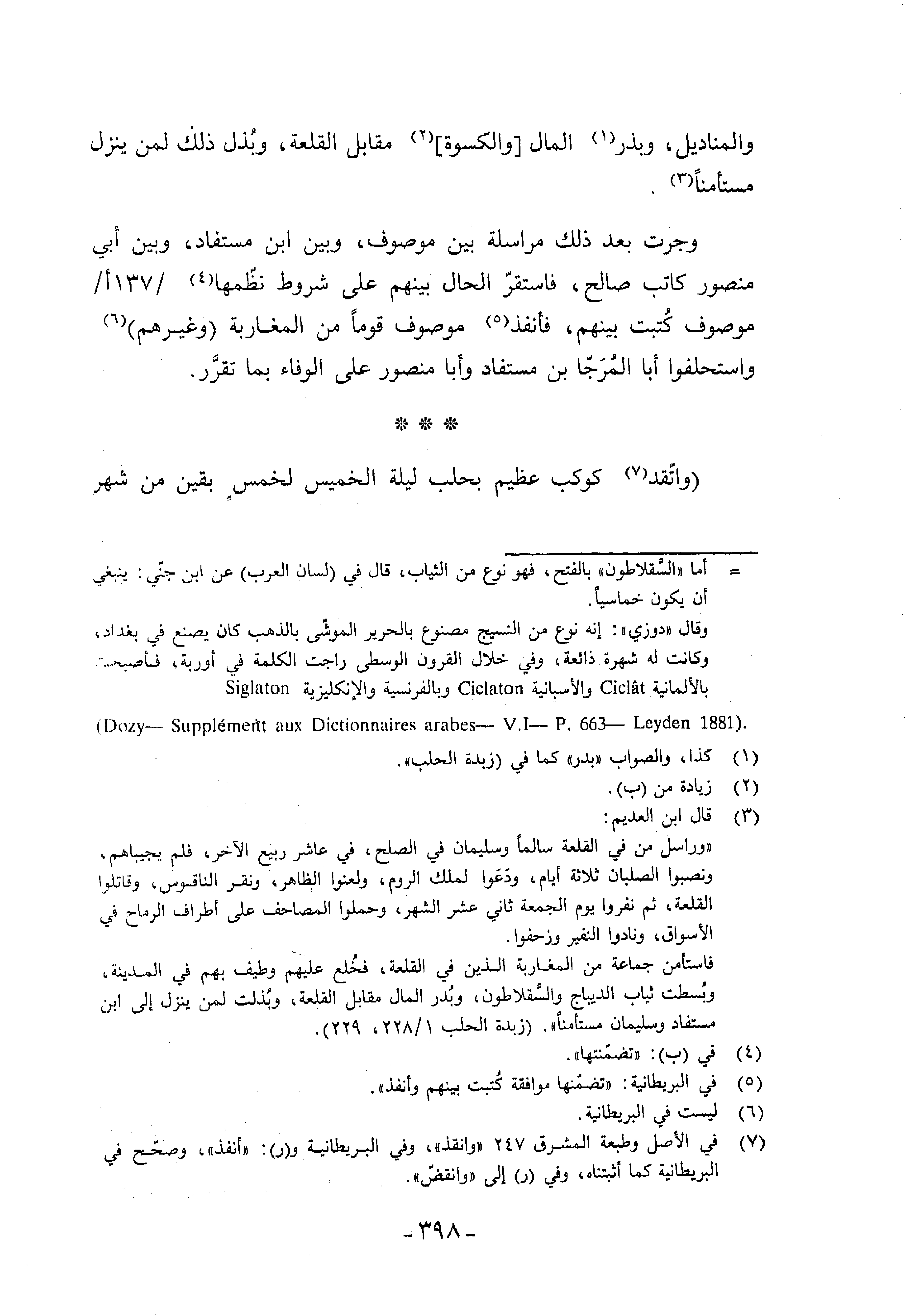 = أما «السّقلاطون» بالفتح، فهو نوع من الثياب، قال في (لسان العرب) عن ابن جنّي: ينبغي أن يكون خماسيا. وقال «دوزي»: إنه نوع من النسيج مصنوع بالحرير الموشّى بالذهب كان يصنع في بغداد، وكانت له شهرة ذائعة، وفي خلال القرون الوسطى راجت الكلمة في أوربة، فأصبحت بالألمانية Cicla?t والأسبانية Ciclaton وبالفرنسية والإنكليزية (Dozy-Supple?men?t aux Dictionnaires arabes-V .I-P .366 - Leyden 1881) . Siglaton