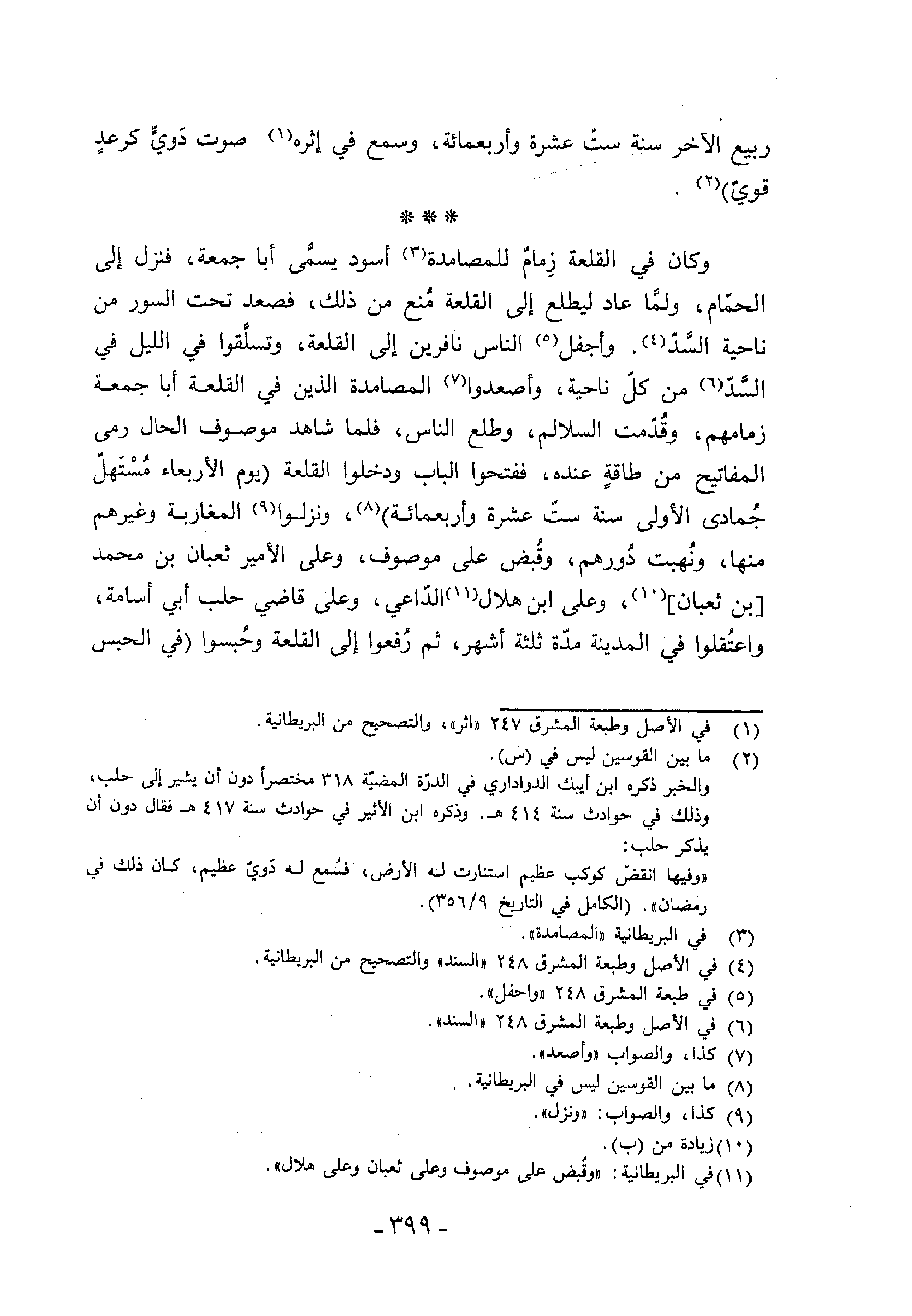 وكان في القلعة زمام للمصامدة (¬3) أسود يسمّى أبا جمعة، فنزل إلى الحمّام، ولمّا عاد ليطلع إلى القلعة منع من ذلك، فصعد تحت السور من ناحية السّدّ (¬4). وأجفل (¬5) الناس نافرين إلى القلعة، وتسلّقوا في الليل في السّدّ (¬6) من كلّ ناحية، وأصعدوا (¬7) المصامدة الذين في القلعة أبا جمعة زمامهم، وقدّمت السلالم، وطلع الناس، فلما شاهد موصوف الحال رمى المفاتيح من طاقة عنده، ففتحوا الباب ودخلوا القلعة (يوم الأربعاء مستهلّ جمادى الأولى سنة ستّ عشرة وأربعمائة) (¬8)، ونزلوا (¬9) المغاربة وغيرهم منها، ونهبت دورهم، وقبض على موصوف، وعلى الأمير ثعبان بن محمد [بن ثعبان] (¬10)، وعلى ابن هلال (¬11) الدّاعي، وعلى قاضي حلب أبي أسامة، واعتقلوا في المدينة مدّة ثلثة أشهر، ثم رفعوا إلى القلعة وحبسوا (في الحبس