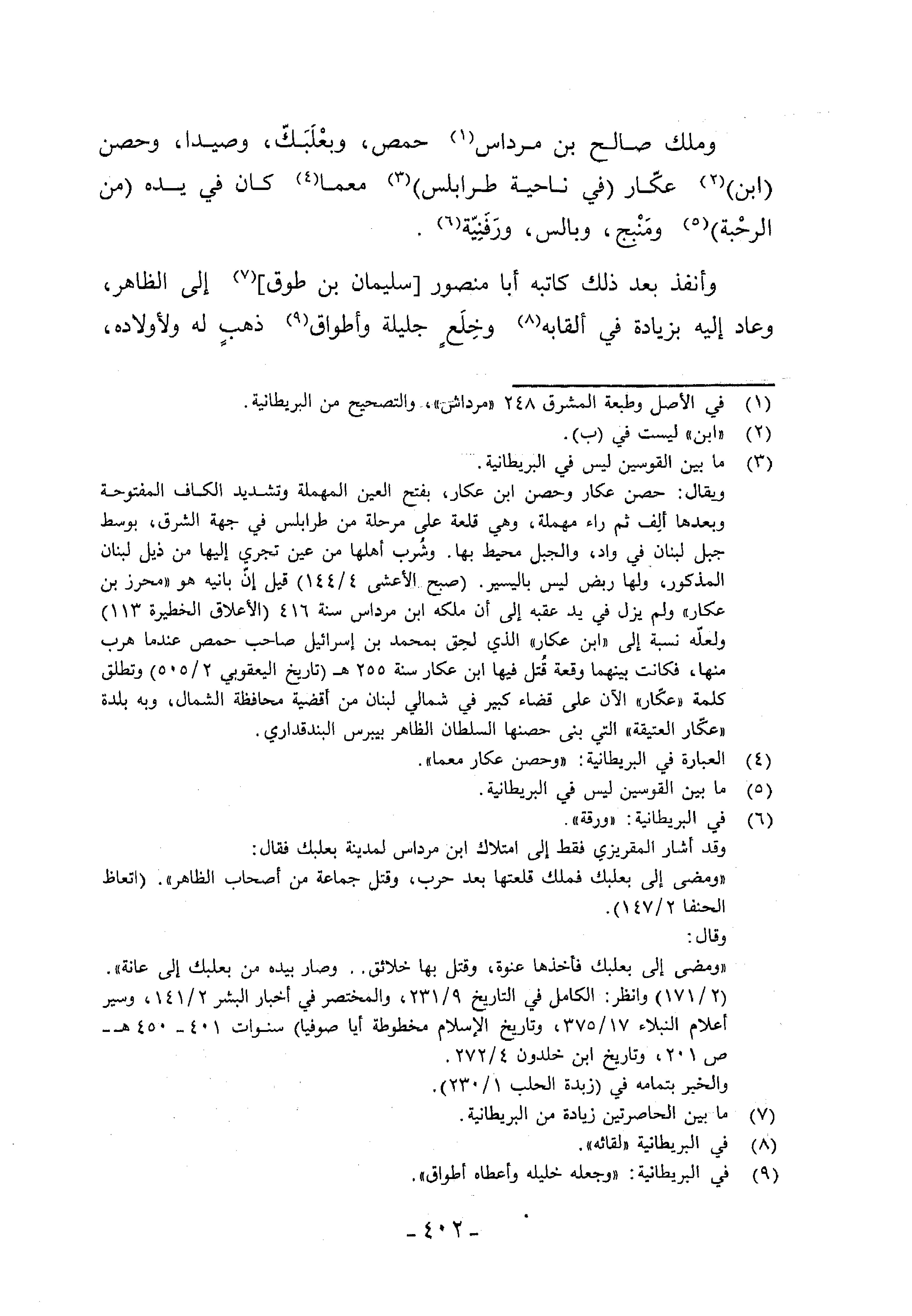 (¬6) في البريطانية: «ورقة». وقد أشار المقريزي فقط إلى امتلاك ابن مرداس لمدينة بعلبك فقال: «ومضى إلى بعلبك فملك قلعتها بعد حرب، وقتل جماعة من أصحاب الظاهر». (اتعاظ الحنفا 2/ 147). وقال: «ومضى إلى بعلبك فأخذها عنوة، وقتل بها خلائق. . وصار بيده من بعلبك إلى عانة». (2/ 171) وانظر: الكامل في التاريخ 9/ 231، والمختصر في أخبار البشر 2/ 141، وسير أعلام النبلاء 17/ 375، وتاريخ الإسلام مخطوطة أيا صوفيا) سنوات 401 - 450 هـ- ص 201، وتاريخ ابن خلدون 4/ 272. والخبر بتمامه في (زبدة الحلب 1/ 230).