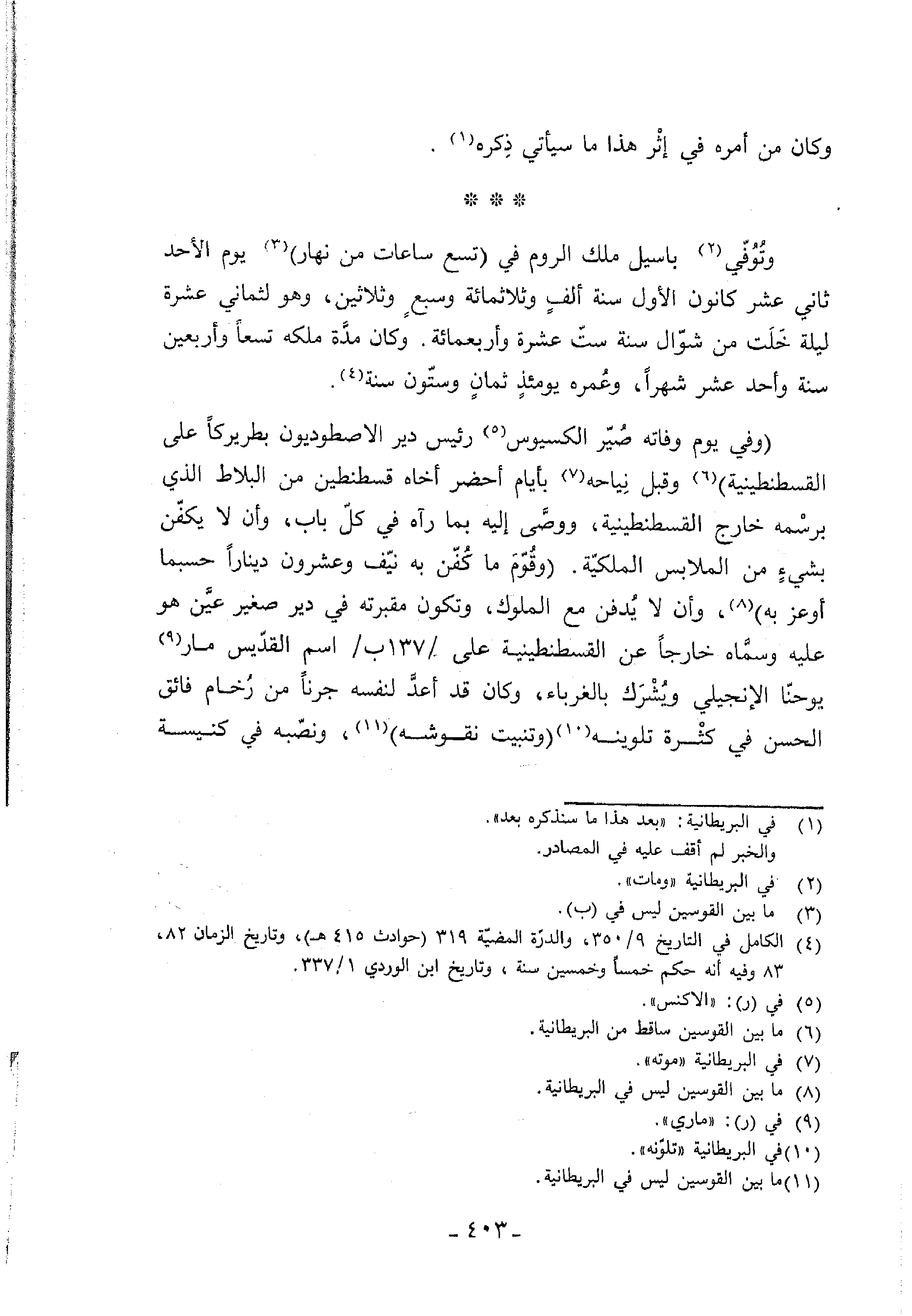 وتوفّي (¬2) باسيل ملك الروم في (تسع ساعات من نهار) (¬3) يوم الأحد ثاني عشر كانون الأول سنة ألف وثلاثمائة وسبع وثلاثين، وهو لثماني عشرة ليلة خلت من شوّال سنة ستّ عشرة وأربعمائة. وكان مدّة ملكه تسعا وأربعين سنة وأحد عشر شهرا، وعمره يومئذ ثمان وستّون سنة (¬4).