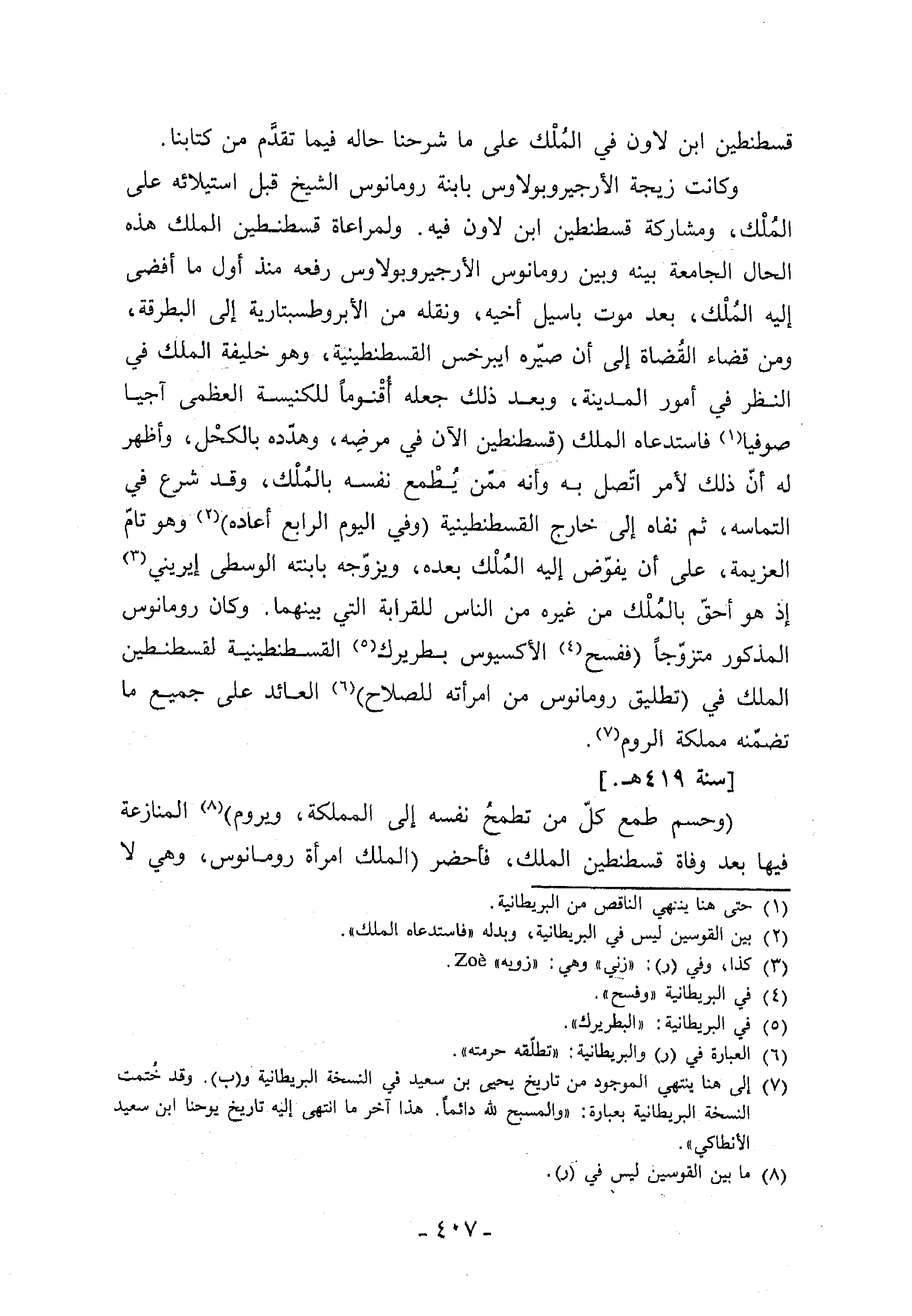 (¬7) إلى هنا ينتهي الموجود من تاريخ يحيى بن سعيد في النسخة البريطانية و (ب). وقد ختمت النسخة البريطانية بعبارة: «والمسبح لله دائما. هذا آخر ما انتهى إليه تاريخ يوحنا ابن سعيد الأنطاكي».
