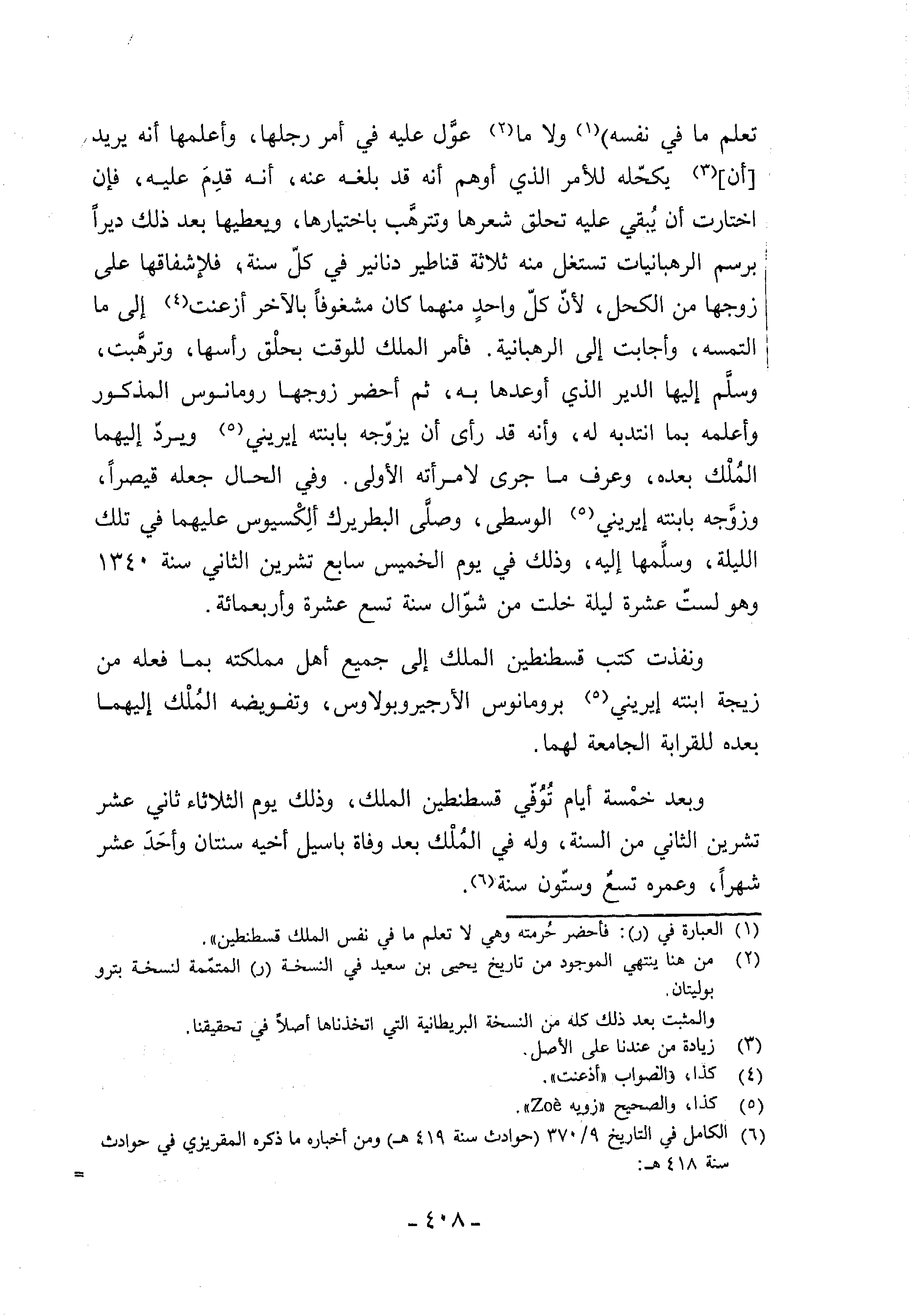 (¬2) من هنا ينتهي الموجود من تاريخ يحيى بن سعيد في النسخة (ر) المتمّمة لنسخة بترو بوليتان. والمثبت بعد ذلك كله من النسخة البريطانية التي اتخذناها أصلا في تحقيقنا.