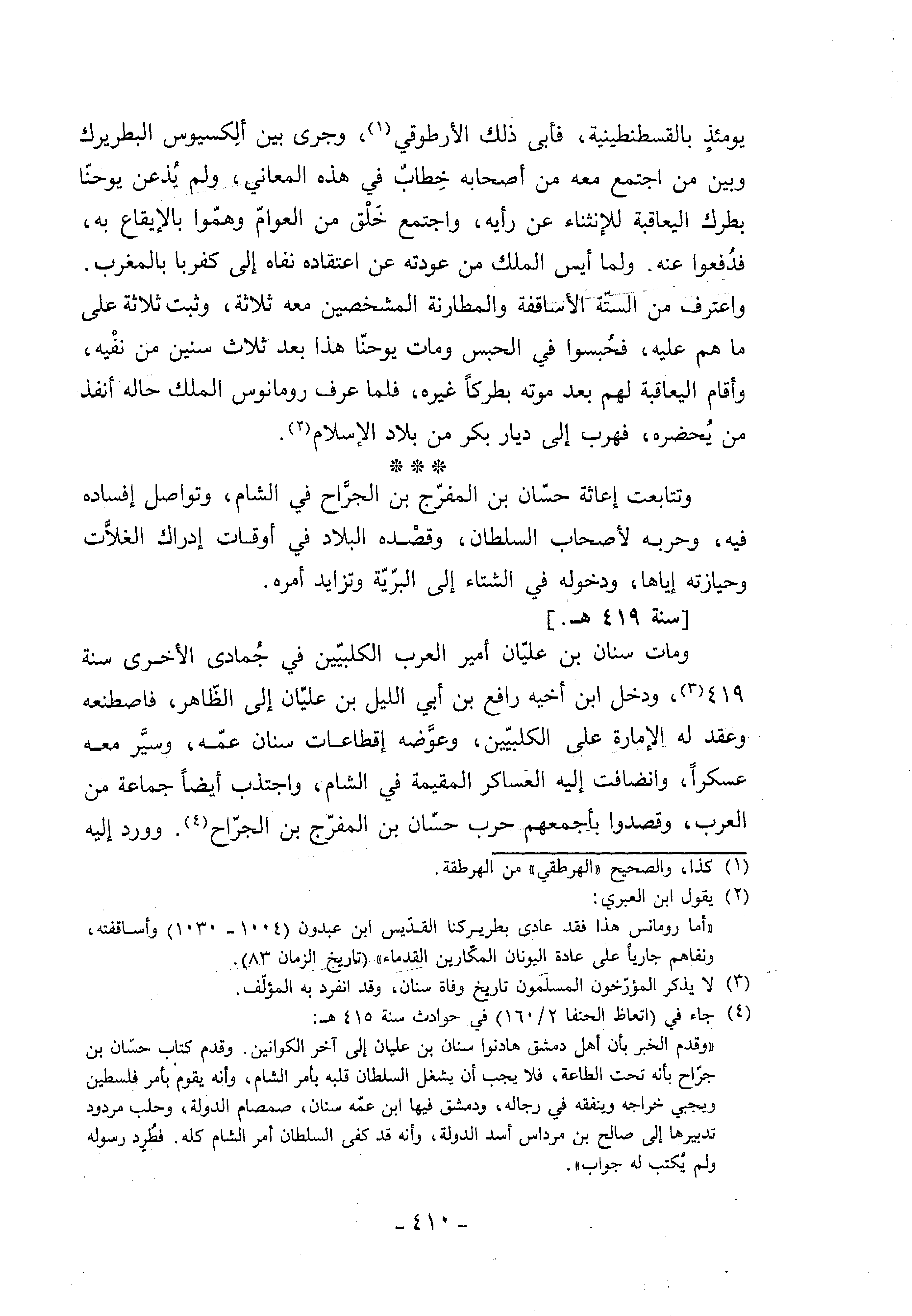 (¬4) جاء في (اتعاظ الحنفا 2/ 160) في حوادث سنة 415 هـ: «وقدم الخبر بأن أهل دمشق هادنوا سنان بن عليان إلى آخر الكوانين. وقدم كتاب حسّان بن جرّاح بأنه تحت الطاعة، فلا يجب أن يشغل السلطان قلبه بأمر الشام، وأنه يقوم بأمر فلسطين ويجبي خراجه وينفقه في رجاله، ودمشق فيها ابن عمّه سنان، صمصام الدولة، وحلب مردود تدبيرها إلى صالح بن مرداس أسد الدولة، وأنه قد كفى السلطان أمر الشام كله. فطرد رسوله ولم يكتب له جواب».