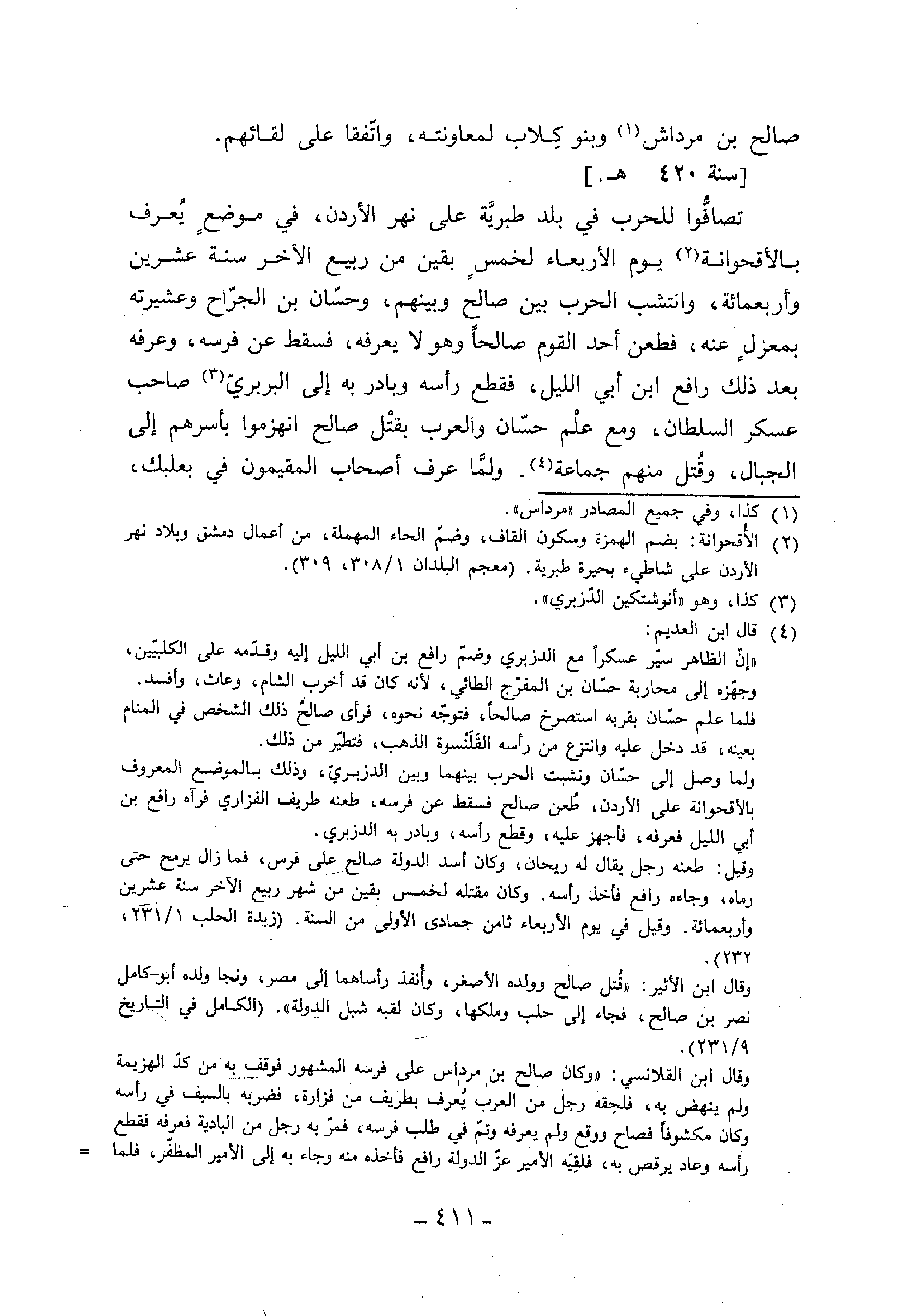 (¬4) قال ابن العديم: «إنّ الظاهر سيّر عسكرا مع الدزبري وضمّ رافع بن أبي الليل إليه وقدّمه على الكلبيّين، وجهّزه إلى محاربة حسّان بن المفرّج الطائي، لأنه كان قد أخرب الشام، وعاث، وأفسد. فلما علم حسّان بقربه استصرخ صالحا، فتوجّه نحوه، فرأى صالح ذلك الشخص في المنام بعينه، قد دخل عليه وانتزع من رأسه القلنسوة الذهب، فتطيّر من ذلك. ولما وصل إلى حسّان ونشبت الحرب بينهما وبين الدزبريّ، وذلك بالموضع المعروف بالأقحوانة على الأردن، طعن صالح فسقط عن فرسه، طعنه طريف الفزاري فرآه رافع بن أبي الليل فعرفه، فأجهز عليه، وقطع رأسه، وبادر به الدزبري. وقيل: طعنه رجل يقال له ريحان، وكان أسد الدولة صالح على فرس، فما زال يرمح حتى رماه، وجاءه رافع فأخذ رأسه. وكان مقتله لخمس بقين من شهر ربيع الآخر سنة عشرين وأربعمائة. وقيل في يوم الأربعاء ثامن جمادى الأولى من السنة. (زبدة الحلب 1/ 231، 232). وقال ابن الأثير: «قتل صالح وولده الأصغر، وأنفذ رأساهما إلى مصر، ونجا ولده أبو كامل نصر بن صالح، فجاء إلى حلب وملكها، وكان لقبه شبل الدولة». (الكامل في التاريخ 9/ 231). وقال ابن القلانسي: «وكان صالح بن مرداس على فرسه المشهور فوقف به من كدّ الهزيمة ولم ينهض به، فلحقه رجل من العرب يعرف بطريف من فزارة، فضربه بالسيف في رأسه وكان مكشوفا فصاح ووقع ولم يعرفه وتمّ في طلب فرسه، فمرّ به رجل من البادية فعرفه فقطع رأسه وعاد يرقص به، فلقيه الأمير عزّ الدولة رافع فأخذه منه وجاء به إلى الأمير المظفّر، فلما-