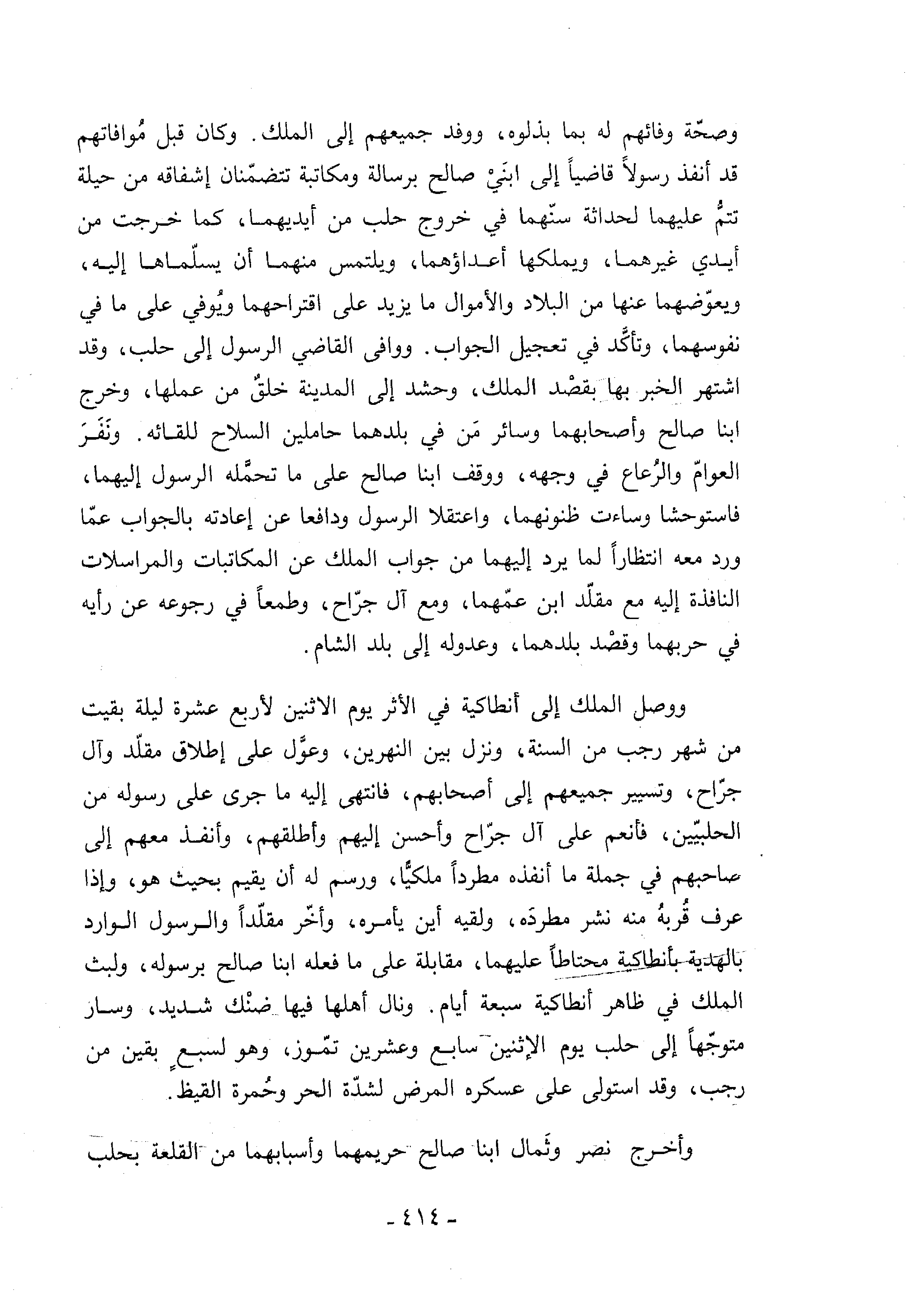 وصحّة وفائهم له بما بذلوه، ووفد جميعهم إلى الملك. وكان قبل موافاتهم قد أنفذ رسولا قاضيا إلى ابني صالح برسالة ومكاتبة تتضمّنان إشفاقه من حيلة تتمّ عليهما لحداثة سنّهما في خروج حلب من أيديهما، كما خرجت من أيدي غيرهما، ويملكها أعداؤهما، ويلتمس منهما أن يسلّماها إليه، ويعوّضهما عنها من البلاد والأموال ما يزيد على اقتراحهما ويوفي على ما في نفوسهما، وتأكّد في تعجيل الجواب. ووافى القاضي الرسول إلى حلب، وقد اشتهر الخبر بها بقصد الملك، وحشد إلى المدينة خلق من عملها، وخرج ابنا صالح وأصحابهما وسائر من في بلدهما حاملين السلاح للقائه. ونفر العوامّ والرعاع في وجهه، ووقف ابنا صالح على ما تحمّله الرسول إليهما، فاستوحشا وساءت ظنونهما، واعتقلا الرسول ودافعا عن إعادته بالجواب عمّا ورد معه انتظارا لما يرد إليهما من جواب الملك عن المكاتبات والمراسلات النافذة إليه مع مقلّد ابن عمّهما، ومع آل جرّاح، وطمعا في رجوعه عن رأيه في حربهما وقصد بلدهما، وعدوله إلى بلد الشام.
