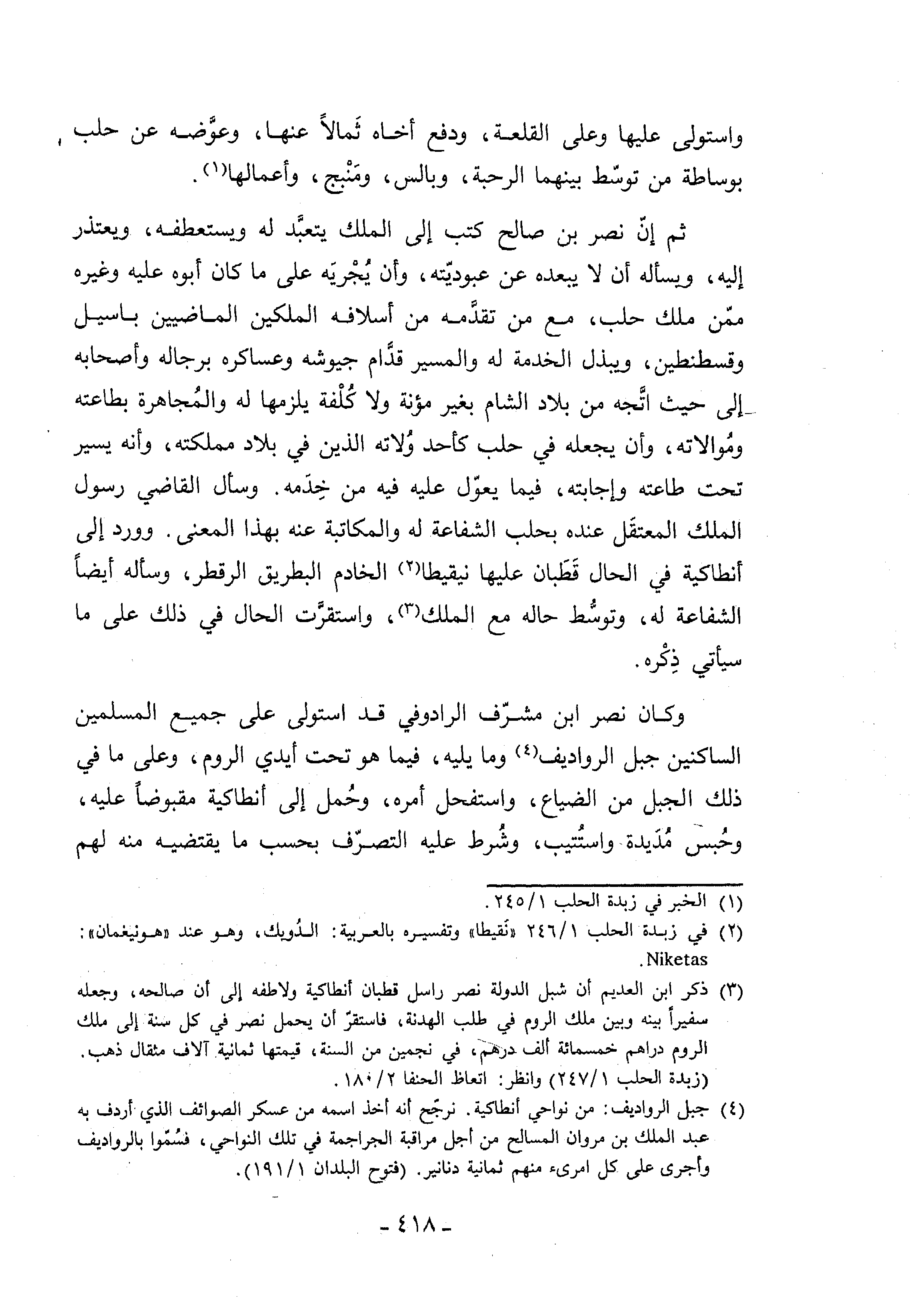 ثم إنّ نصر بن صالح كتب إلى الملك يتعبّد له ويستعطفه، ويعتذر إليه، ويسأله أن لا يبعده عن عبوديّته، وأن يجريه على ما كان أبوه عليه وغيره ممّن ملك حلب، مع من تقدّمه من أسلافه الملكين الماضيين باسيل وقسطنطين، ويبذل الخدمة له والمسير قدّام جيوشه وعساكره برجاله وأصحابه إلى حيث اتّجه من بلاد الشام بغير مؤنة ولا كلفة يلزمها له والمجاهرة بطاعته وموالاته، وأن يجعله في حلب كأحد ولاته الذين في بلاد مملكته، وأنه يسير تحت طاعته وإجابته، فيما يعوّل عليه فيه من خدمه. وسأل القاضي رسول الملك المعتقل عنده بحلب الشفاعة له والمكاتبة عنه بهذا المعنى. وورد إلى أنطاكية في الحال قطبان عليها نيقيطا (¬2) الخادم البطريق الرقطر، وسأله أيضا الشفاعة له، وتوسّط حاله مع الملك (¬3)، واستقرّت الحال في ذلك على ما سيأتي ذكره.