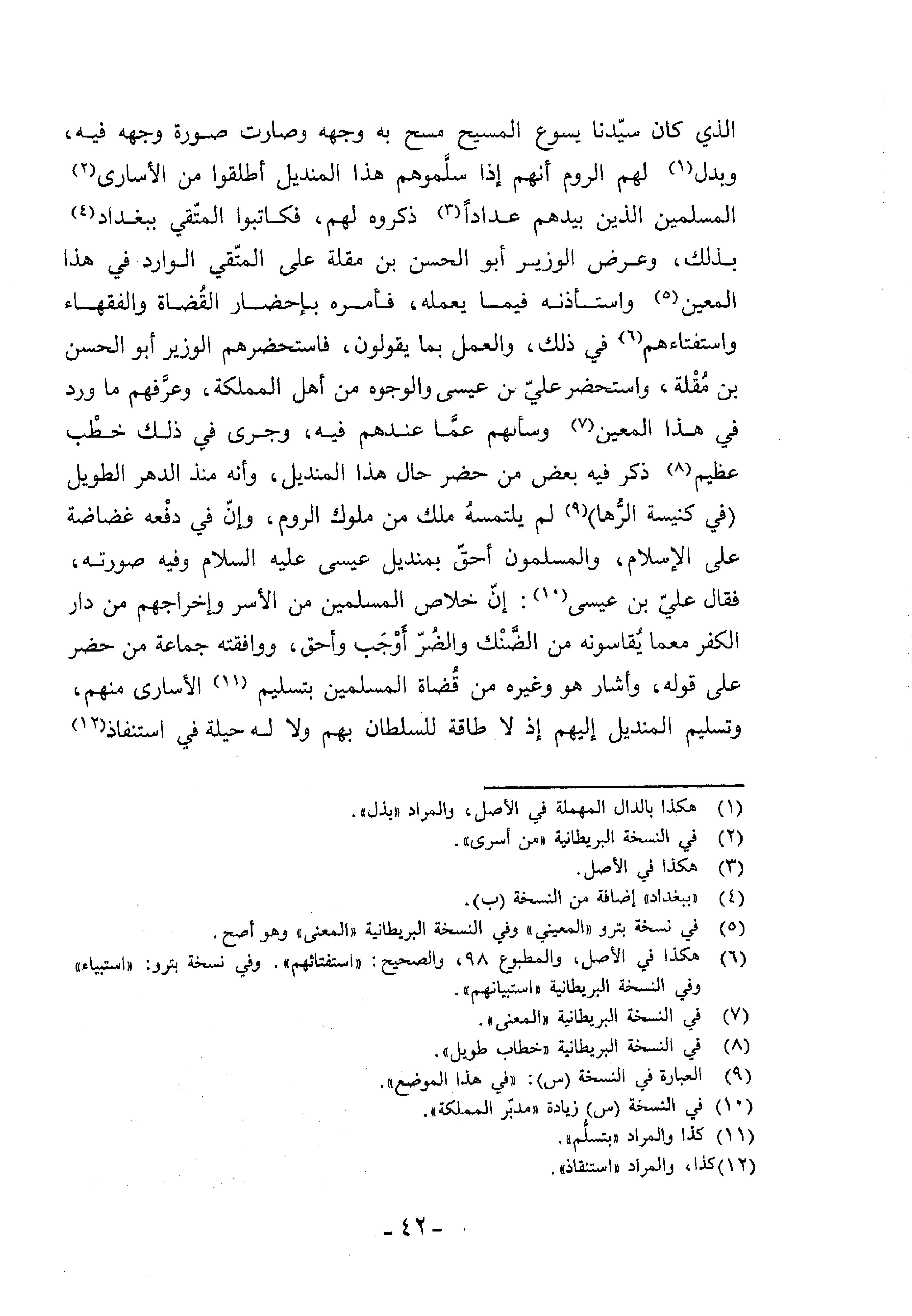 وعرض الوزير أبو الحسن بن مقلة على المتّقي الوارد في هذا المعين (¬5) واستأذنه فيما يعمله، فأمره بإحضار القضاة والفقهاء واستفتاءهم (¬6) في ذلك، والعمل بما يقولون، فاستحضرهم الوزير أبو الحسن بن مقلة، واستحضر عليّ بن عيسى والوجوه من أهل المملكة، وعرّفهم ما ورد في هذا المعين (¬7) وسألهم عمّا عندهم فيه، وجرى في ذلك خطب عظيم (¬8) ذكر فيه بعض من حضر حال هذا المنديل، وأنه منذ الدهر الطويل (في كنيسة الرّها) (¬9) لم يلتمسه ملك من ملوك الروم، وإنّ في دفعه غضاضة على الإسلام، والمسلمون أحقّ بمنديل عيسى عليه السلام وفيه صورته، فقال عليّ بن عيسى (¬10): إنّ خلاص المسلمين من الأسر وإخراجهم من دار الكفر معما يقاسونه من الضّنك والضرّ أوجب وأحق، ووافقته جماعة من حضر على قوله، وأشار هو وغيره من قضاة المسلمين بتسليم (¬11) الأسارى منهم، وتسليم المنديل إليهم إذ لا طاقة للسلطان بهم ولا له حيلة في استنفاذ (¬12)