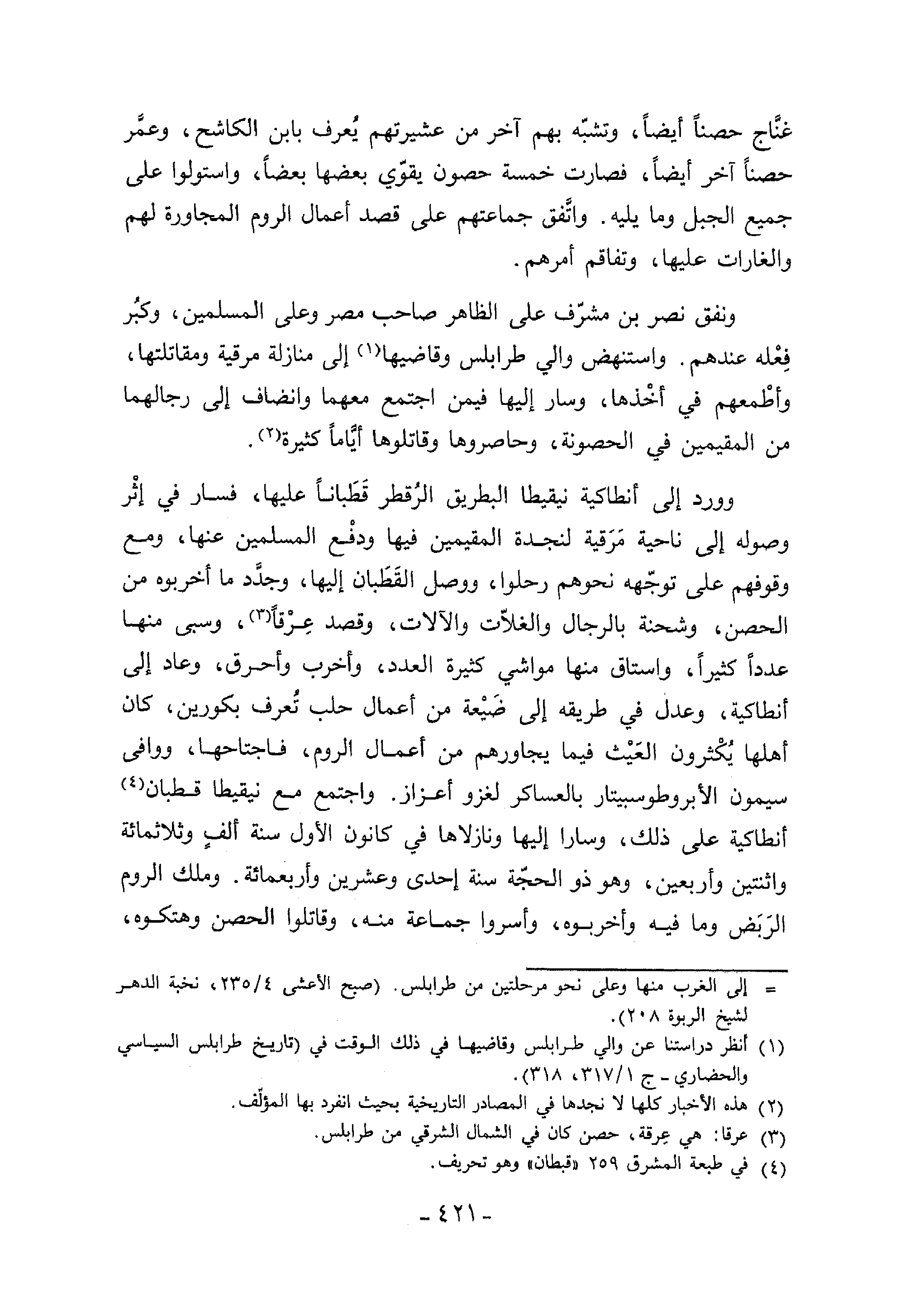 وورد إلى أنطاكية نيقيطا البطريق الرقطر قطبانا عليها، فسار في إثر وصوله إلى ناحية مرقية لنجدة المقيمين فيها ودفع المسلمين عنها، ومع وقوفهم على توجّهه نحوهم رحلوا، ووصل القطبان إليها، وجدّد ما أخربوه من الحصن، وشحنة بالرجال والغلاّت والآلات، وقصد عرقا (¬3)، وسبى منها عددا كثيرا، واستاق منها مواشي كثيرة العدد، وأخرب وأحرق، وعاد إلى أنطاكية، وعدل في طريقه إلى ضيعة من أعمال حلب تعرف بكورين، كان أهلها يكثرون العيث فيما يجاورهم من أعمال الروم، فاجتاحها،