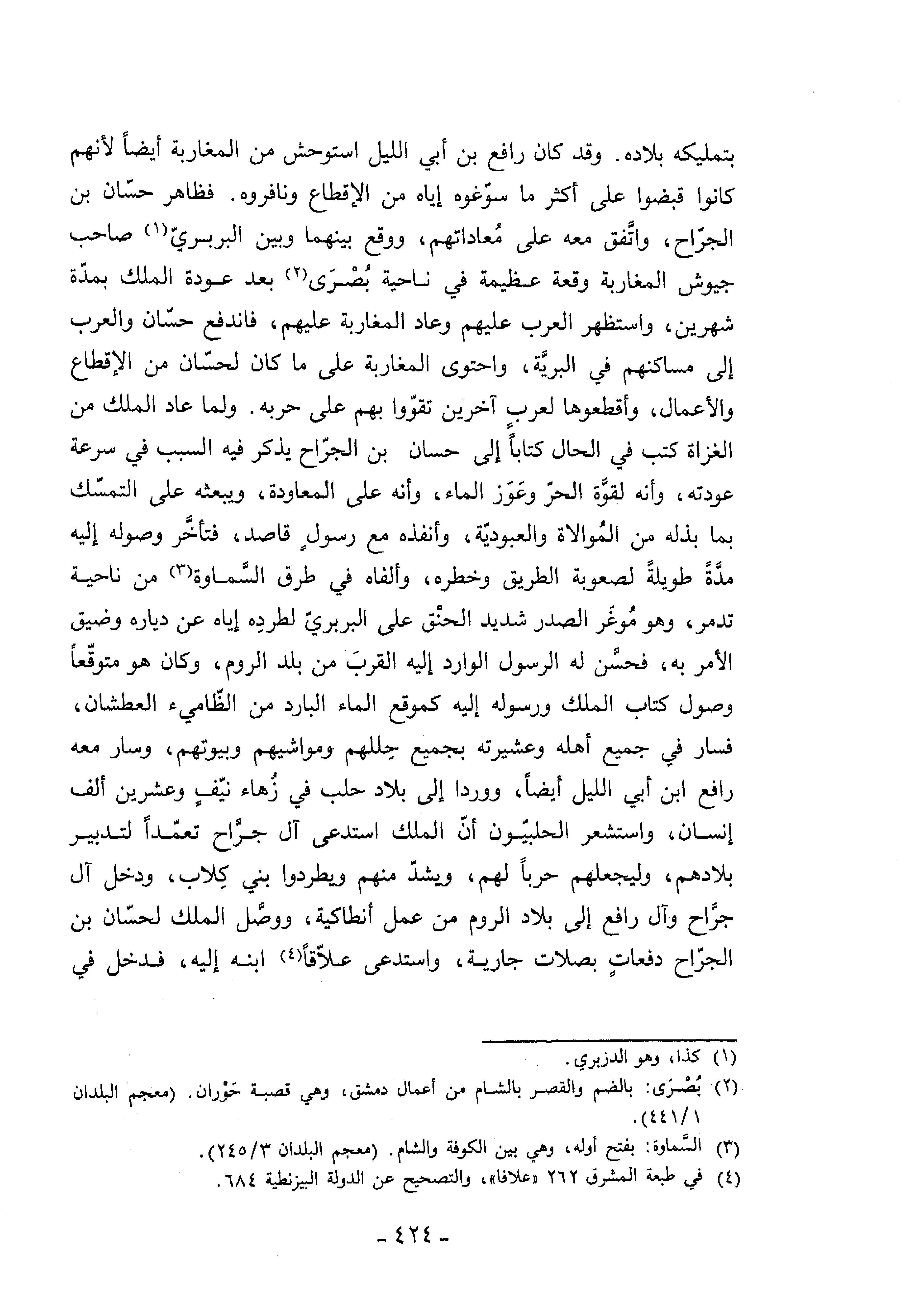 واستظهر العرب عليهم وعاد المغاربة عليهم، فاندفع حسّان والعرب إلى مساكنهم في البريّة، واحتوى المغاربة على ما كان لحسّان من الإقطاع والأعمال، وأقطعوها لعرب آخرين تقوّوا بهم على حربه. ولما عاد الملك من الغزاة كتب في الحال كتابا إلى حسان بن الجرّاح يذكر فيه السبب في سرعة عودته، وأنه لقوّة الحرّ وعوز الماء، وأنه على المعاودة، ويبعثه على التمسّك بما بذله من الموالاة والعبوديّة، وأنفذه مع رسول قاصد، فتأخّر وصوله إليه مدّة طويلة لصعوبة الطريق وخطره، وألفاه في طرق السّماوة (¬3) من ناحية تدمر، وهو موغر الصدر شديد الحنق على البربريّ لطرده إياه عن دياره وضيق الأمر به، فحسّن له الرسول الوارد إليه القرب من بلد الروم، وكان هو متوقّعا وصول كتاب الملك ورسوله إليه كموقع الماء البارد من الظّاميء العطشان،