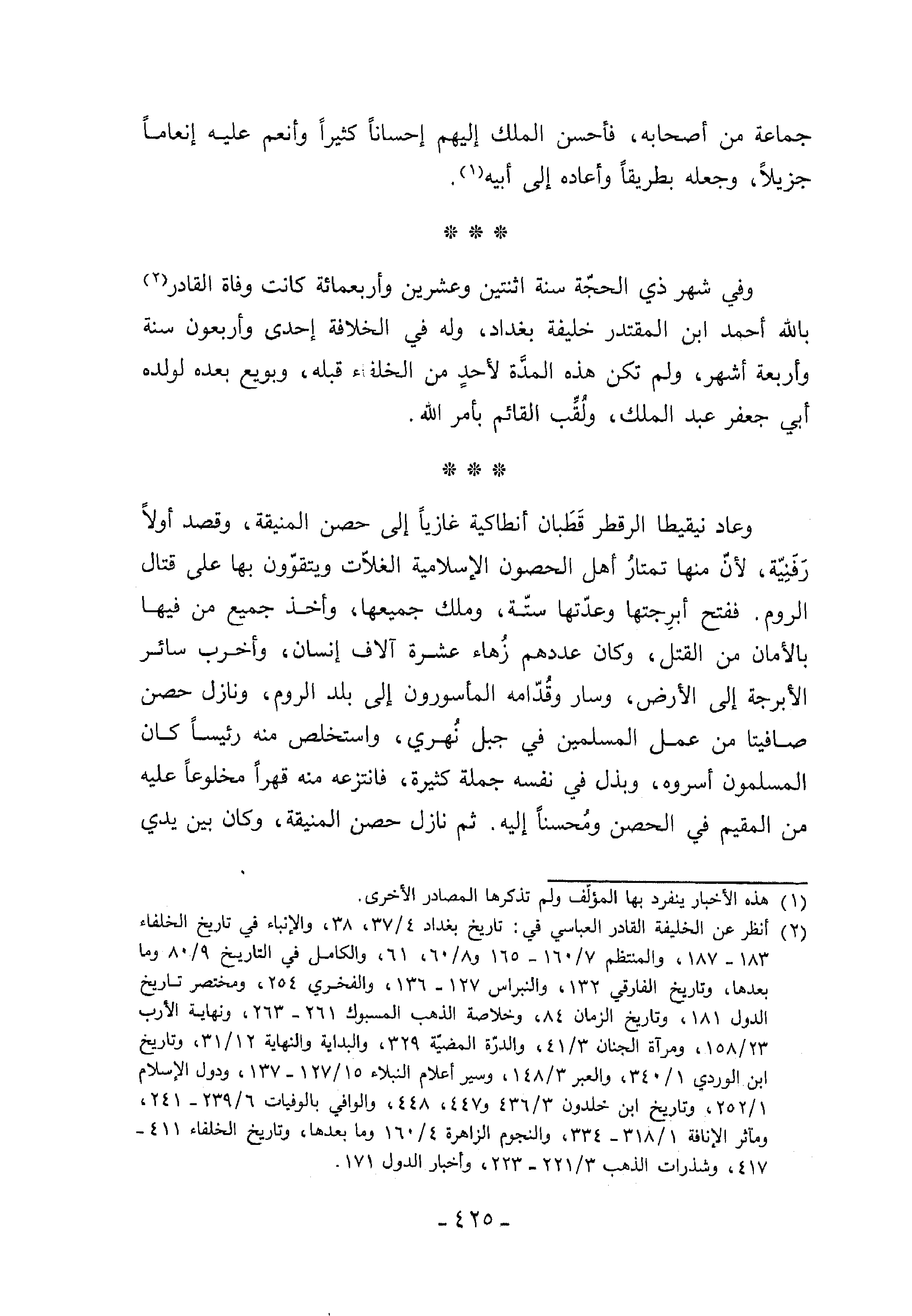 (¬2) أنظر عن الخليفة القادر العباسي في: تاريخ بغداد 4/ 37،38، والإنباء في تاريخ الخلفاء 183 - 187، والمنتظم 7/ 160 - 165 و 8/ 60،61، والكامل في التاريخ 9/ 80 وما بعدها، وتاريخ الفارقي 132، والنبراس 127 - 136، والفخري 254، ومختصر تاريخ الدول 181، وتاريخ الزمان 84، وخلاصة الذهب المسبوك 261 - 263، ونهاية الأرب 23/ 158، ومرآة الجنان 3/ 41، والدرّة المضيّة 329، والبداية والنهاية 12/ 31، وتاريخ ابن الوردي 1/ 340، والعبر 3/ 148، وسير أعلام النبلاء 15/ 127 - 137، ودول الإسلام 1/ 252، وتاريخ ابن خلدون 3/ 436 و 447،448، والوافي بالوفيات 6/ 239 - 241، ومآثر الإنافة 1/ 318 - 334، والنجوم الزاهرة 4/ 160 وما بعدها، وتاريخ الخلفاء 411 - 417، وشذرات الذهب 3/ 221 - 223، وأخبار الدول 171.