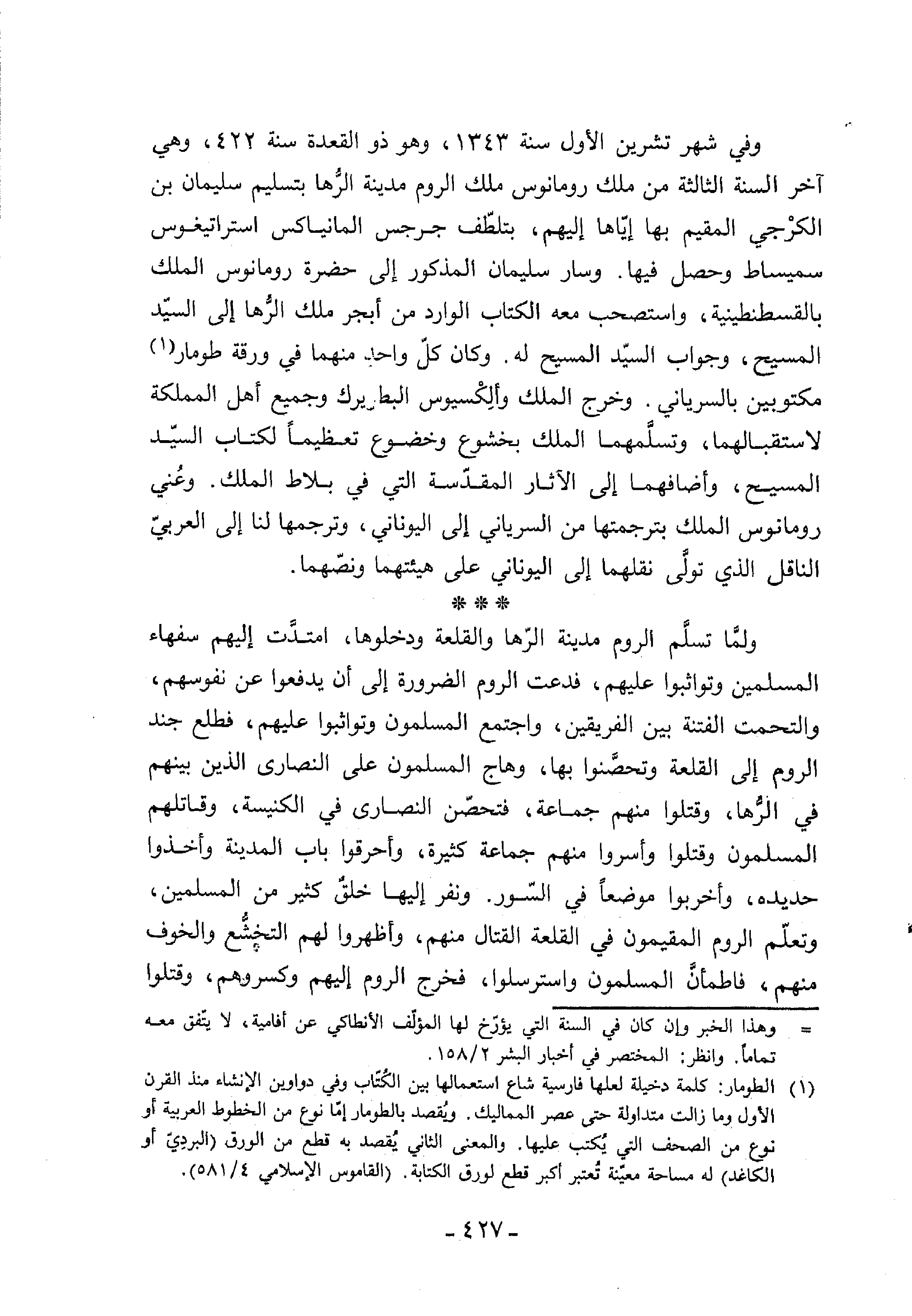 وفي شهر تشرين الأول سنة 1343، وهو ذو القعدة سنة 422، وهي آخر السنة الثالثة من ملك رومانوس ملك الروم مدينة الرّها بتسليم سليمان بن الكرجي المقيم بها إيّاها إليهم، بتلطّف جرجس المانياكس استراتيغوس سميساط وحصل فيها. وسار سليمان المذكور إلى حضرة رومانوس الملك بالقسطنطينية، واستصحب معه الكتاب الوارد من أبجر ملك الرّها إلى السيّد المسيح، وجواب السيّد المسيح له. وكان كلّ واحد منهما في ورقة طومار (¬1) مكتوبين بالسرياني. وخرج الملك وألكسيوس البطريرك وجميع أهل المملكة لاستقبالهما، وتسلّمهما الملك بخشوع وخضوع تعظيما لكتاب السيّد المسيح، وأضافهما إلى الآثار المقدّسة التي في بلاط الملك. وعني رومانوس الملك بترجمتها من السرياني إلى اليوناني، وترجمها لنا إلى العربيّ الناقل الذي تولّى نقلهما إلى اليوناني على هيئتهما ونصّهما.