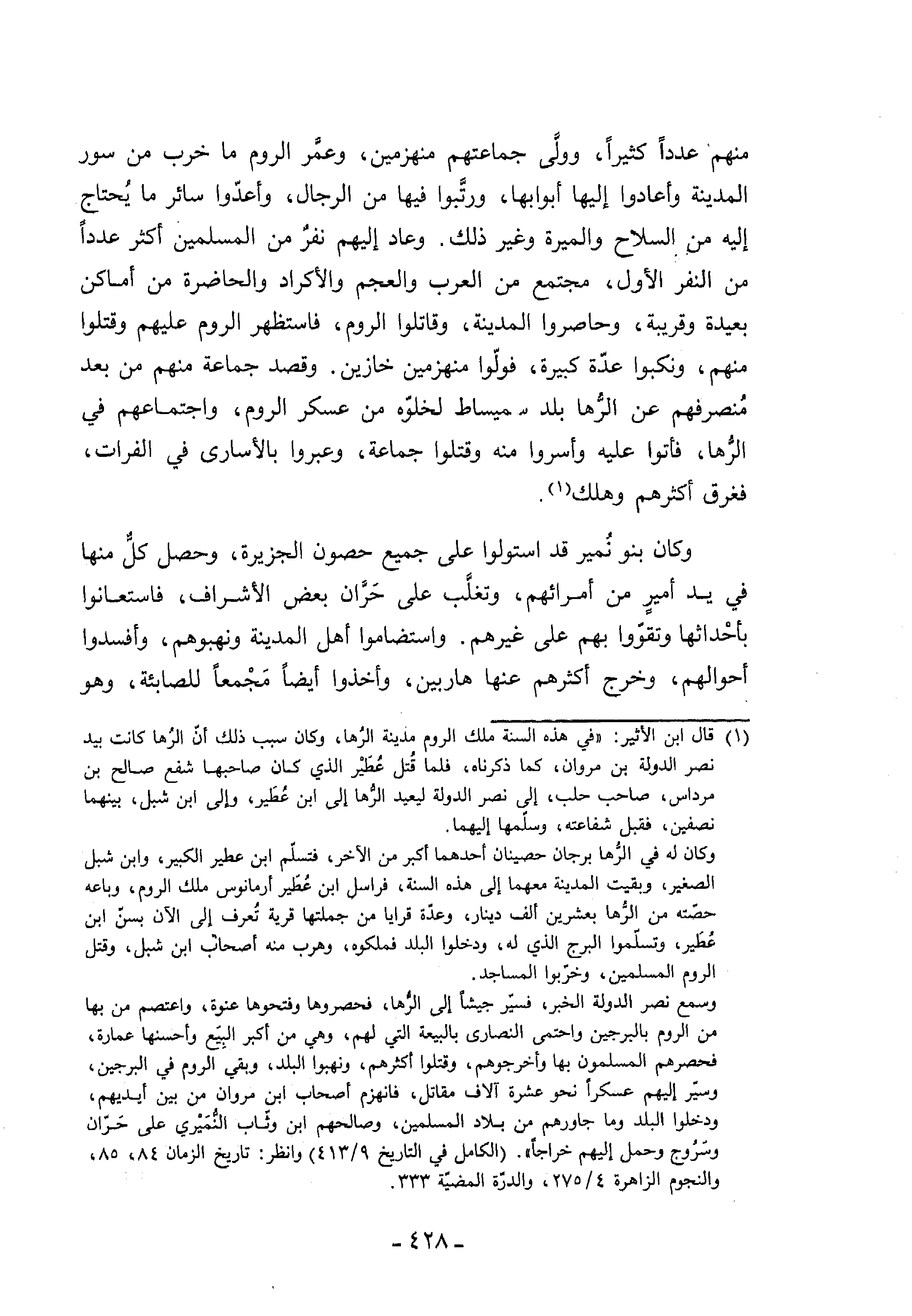 (¬1) قال ابن الأثير: «في هذه السنة ملك الروم مدينة الرها، وكان سبب ذلك أنّ الرها كانت بيد نصر الدولة بن مروان، كما ذكرناه، فلما قتل عطير الذي كان صاحبها شفع صالح بن مرداس، صاحب حلب، إلى نصر الدولة ليعيد الرّها إلى ابن عطير، وإلى ابن شبل، بينهما نصفين، فقبل شفاعته، وسلّمها إليهما. وكان له في الرّها برجان حصينان أحدهما أكبر من الآخر، فتسلّم ابن عطير الكبير، وابن شبل الصغير، وبقيت المدينة معهما إلى هذه السنة، فراسل ابن عطير أرمانوس ملك الروم، وباعه حصّته من الرّها بعشرين ألف دينار، وعدّة قرايا من جملتها قرية تعرف إلى الآن بسنّ ابن عطير، وتسلّموا البرج الذي له، ودخلوا البلد فملكوه، وهرب منه أصحاب ابن شبل، وقتل الروم المسلمين، وخرّبوا المساجد. وسمع نصر الدولة الخبر، فسيّر جيشا إلى الرّها، فحصروها وفتحوها عنوة، واعتصم من بها من الروم بالبرجين واحتمى النصارى بالبيعة التي لهم، وهي من أكبر البيع وأحسنها عمارة، فحصرهم المسلمون بها وأخرجوهم، وقتلوا أكثرهم، ونهبوا البلد، وبقي الروم في البرجين، وسيّر إليهم عسكرا نحو عشرة آلاف مقاتل، فانهزم أصحاب ابن مروان من بين أيديهم، ودخلوا البلد وما جاورهم من بلاد المسلمين، وصالحهم ابن وثّاب النّميري على حرّان وسروج وحمل إليهم خراجا». (الكامل في التاريخ 9/ 413) وانظر: تاريخ الزمان 84،85، والنجوم الزاهرة 4/ 275، والدرّة المضيّة 333.