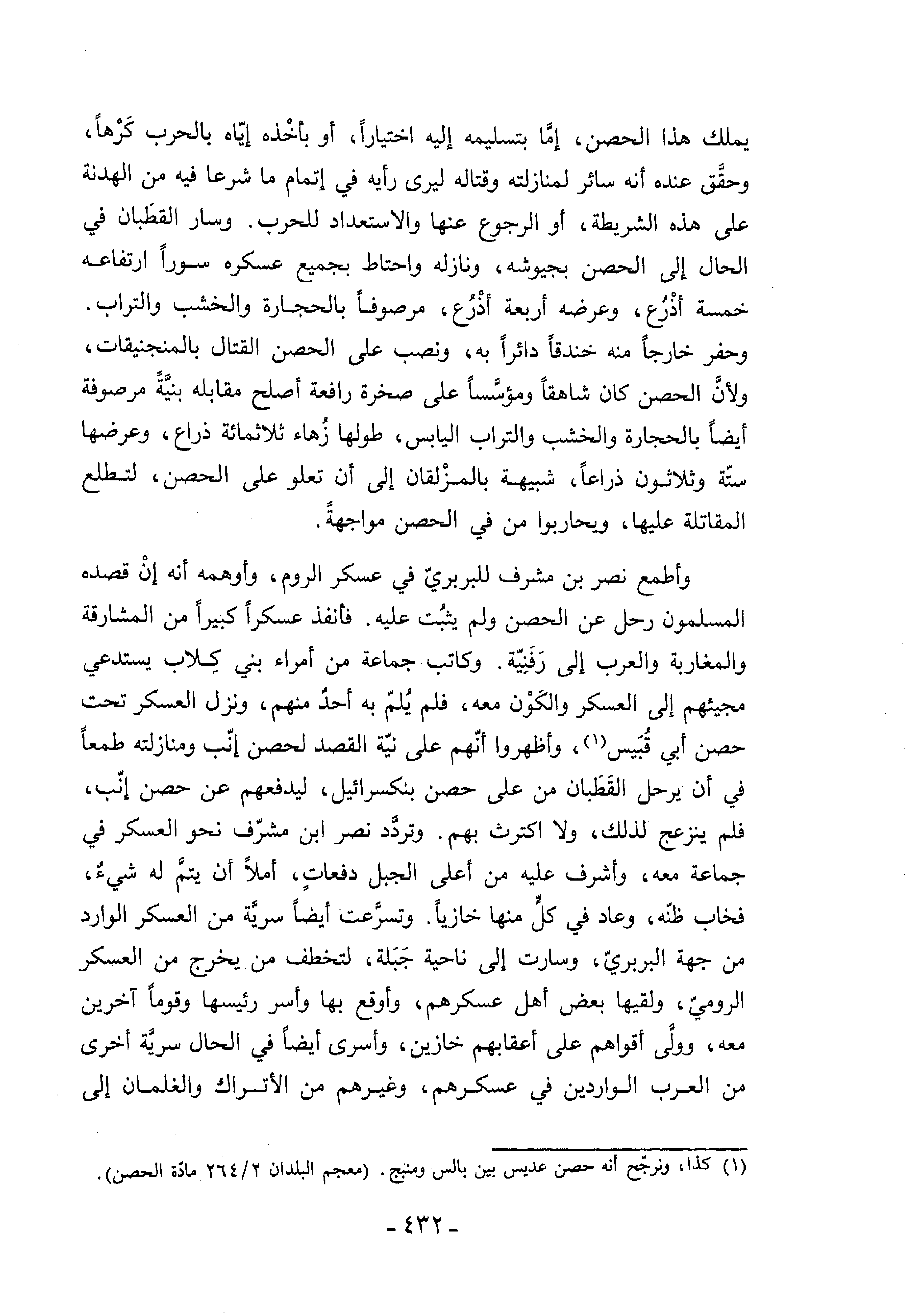 وأطمع نصر بن مشرف للبربريّ في عسكر الروم، وأوهمه أنه إن قصده المسلمون رحل عن الحصن ولم يثبت عليه. فأنفذ عسكرا كبيرا من المشارقة والمغاربة والعرب إلى رفنيّة. وكاتب جماعة من أمراء بني كلاب يستدعي مجيئهم إلى العسكر والكون معه، فلم يلمّ به أحد منهم، ونزل العسكر تحت حصن أبي قبيس (¬1)، وأظهروا أنّهم على نيّة القصد لحصن إنّب ومنازلته طمعا في أن يرحل القطبان من على حصن بنكسرائيل، ليدفعهم عن حصن إنّب، فلم ينزعج لذلك، ولا اكترث بهم. وتردّد نصر ابن مشرّف نحو العسكر في جماعة معه، وأشرف عليه من أعلى الجبل دفعات، أملا أن يتمّ له شيء، فخاب ظنّه، وعاد في كلّ منها خازيا.