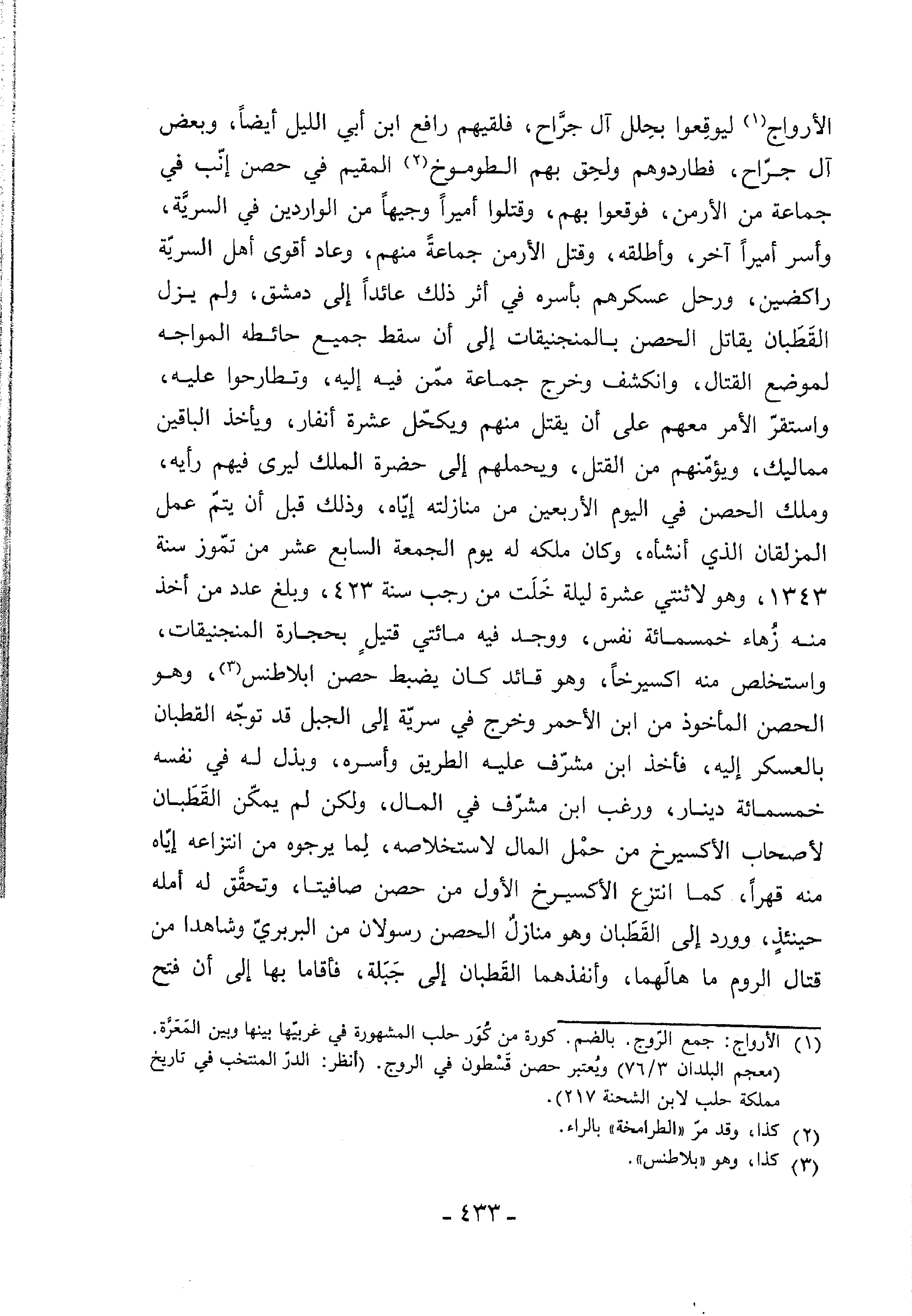 الأرواج (¬1) ليوقعوا بحلل آل جرّاح، فلقيهم رافع ابن أبي الليل أيضا، وبعض آل جرّاح، فطاردوهم ولحق بهم الطوموخ (¬2) المقيم في حصن إنّب في جماعة من الأرمن، فوقعوا بهم، وقتلوا أميرا وجيها من الواردين في السريّة، وأسر أميرا آخر، وأطلقه، وقتل الأرمن جماعة منهم، وعاد أقوى أهل السريّة راكضين، ورحل عسكرهم بأسره في أثر ذلك عائدا إلى دمشق،