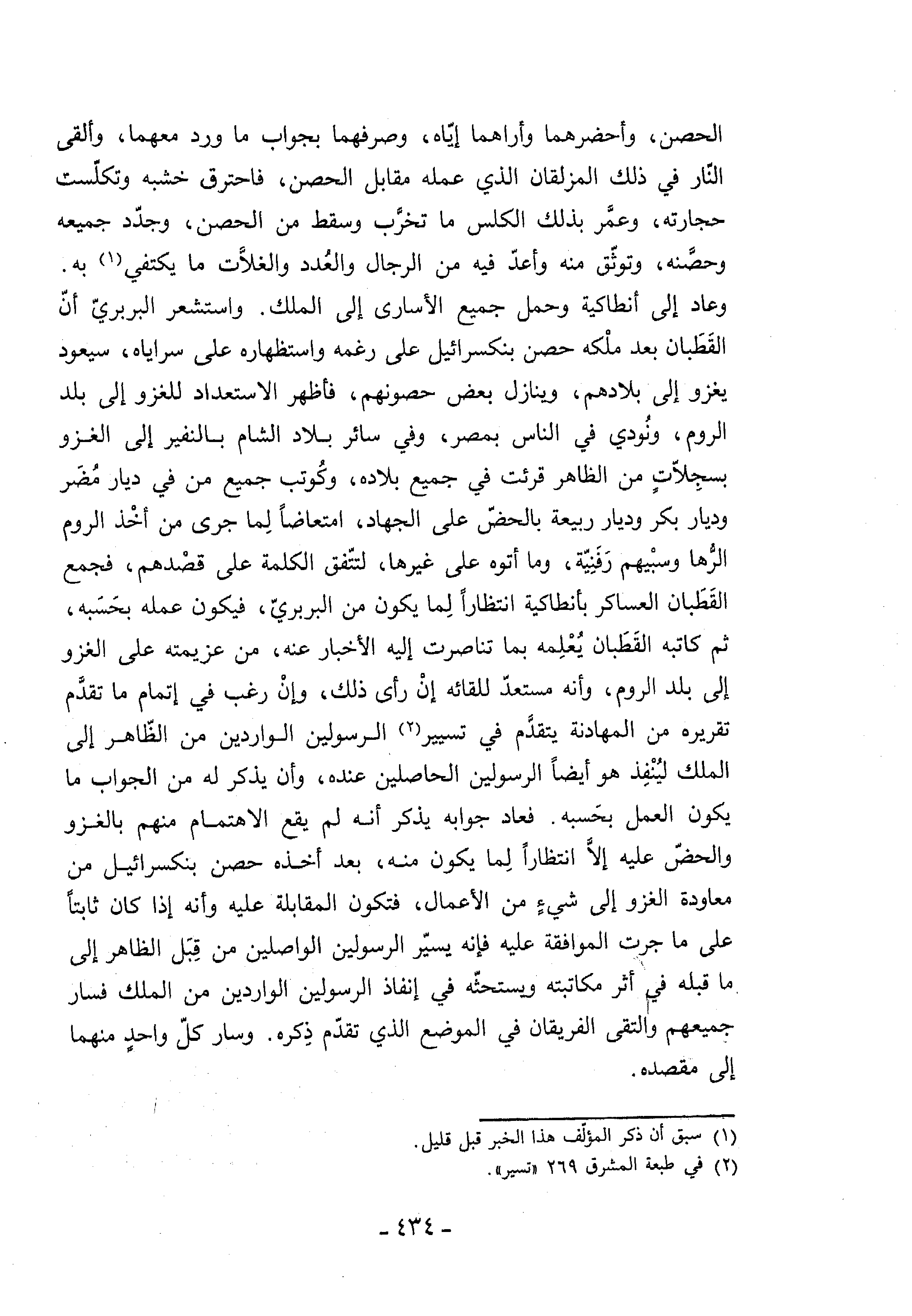 ثم كاتبه القطبان يعلمه بما تناصرت إليه الأخبار عنه، من عزيمته على الغزو إلى بلد الروم، وأنه مستعدّ للقائه إن رأى ذلك، وإن رغب في إتمام ما تقدّم تقريره من المهادنة يتقدّم في تسيير (¬2) الرسولين الواردين من الظّاهر إلى الملك لينفذ هو أيضا الرسولين الحاصلين عنده، وأن يذكر له من الجواب ما يكون العمل بحسبه. فعاد جوابه يذكر أنه لم يقع الاهتمام منهم بالغزو والحضّ عليه إلاّ انتظارا لما يكون منه، بعد أخذه حصن بنكسرائيل من معاودة الغزو إلى شيء من الأعمال، فتكون المقابلة عليه وأنه إذا كان ثابتا على ما جرت الموافقة عليه فإنه يسيّر الرسولين الواصلين من قبل الظاهر إلى ما قبله في أثر مكاتبته ويستحثّه في إنفاذ الرسولين الواردين من الملك فسار جميعهم والتقى الفريقان في الموضع الذي تقدّم ذكره. وسار كلّ واحد منهما إلى مقصده.